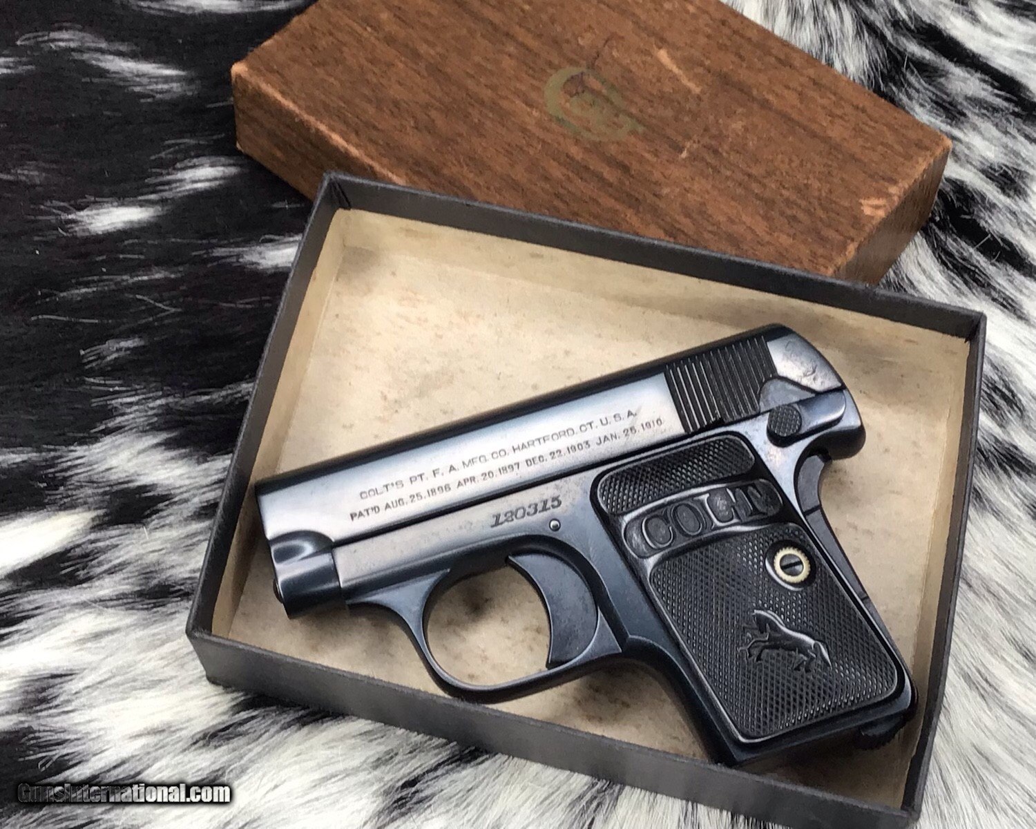 Description: This Colt Model 1908 Vest Pocket Semi-Automatic Pistol with Box was born in 1908. Very good to excellent condition, in what looks to be a Colt Junior box. One mag, .25 acp chambering. I've always been amazed at these little Colt marvels designed by John Moses Browning. A gun that conceals in a shirt or any pocket, that is good looking,tough,and reliable. This gun looks fresh and appears to not of had much, or any use in its 106 years of duty. Made in the USA by American craftsman. Add 3% if paying with credit card. God Bless America from a proud American, and a Viet Nam Vet , thankful for our freedoms.. paid for by the Blood ,Sweat and Tears of our brave men and women in uniform. Ten Below Firearms is a Veteran owned and operated business. We specialize in out of production models of high quality firearms. We love to ship! If you are out of state or can't make it to our store, just give us a call! Handguns normally ship for $30 and Long guns for $40 to $55 for extra length long guns. That's 2-3 day USPS Priority shipping, Delivery conformation and with tracking number. Optional Postal insurance is additional $1.50 per $100 and highly recommended. SOLD Curio/Relic: Yes Handgun Caliber: .25 ACP (6.35mm Browning, 6.35×16mmSR) Manufacturer: Colt Model: 1908 Serial Number: 120315 Condition: Excellent Metal Condition: Excellent Bore Condition: Shiny Action: Semi-auto Finish: Blued Manufacture Date: 1915 Item Location: Mn |