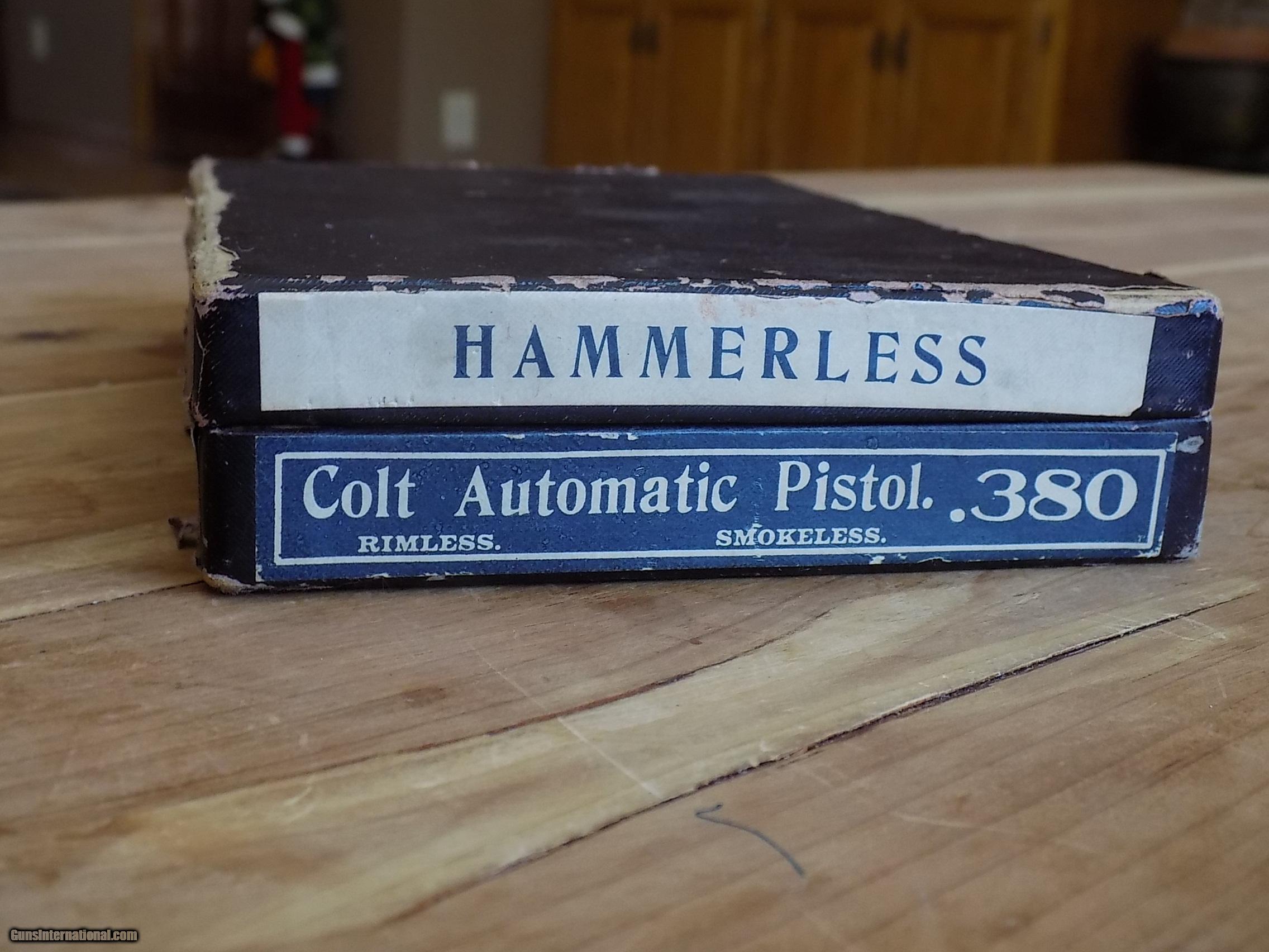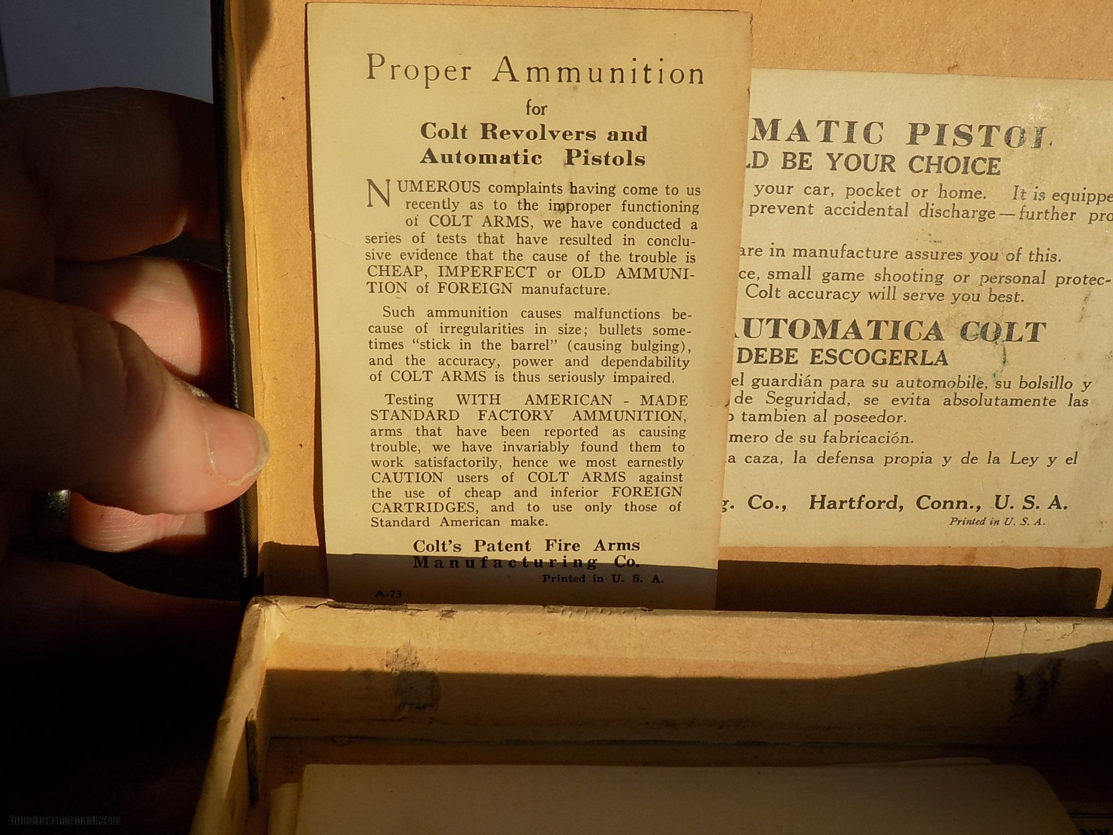 Description: Sold This is the Colt 1908 .380 Pocket Hammerless. This pistol comes out of a collection that was started in the 1950's and the pistol has not been out of its original box until now. Box contains Original owners manual, Colt's special instruction sheet and an ultra rare Proper Ammunition suggestion/warning sheet. This document was only included with the prewar autos for a very limited time. The condition of this Colt is amazing. The guns deep prewar charcoal finish would rate 99.5+ with only a whisper of finish loss on the upper left edge on the front of the slide. Likely from box wear. The gun appears unfired as there is no wear to the ejection port and the barrel retains 100% of its original finish. Mint example of the .380 pocket hammerless! Buyer pays $50 shipping to FFL C&R OK 2,995 or best offer. SOLD Curio/Relic: Yes |