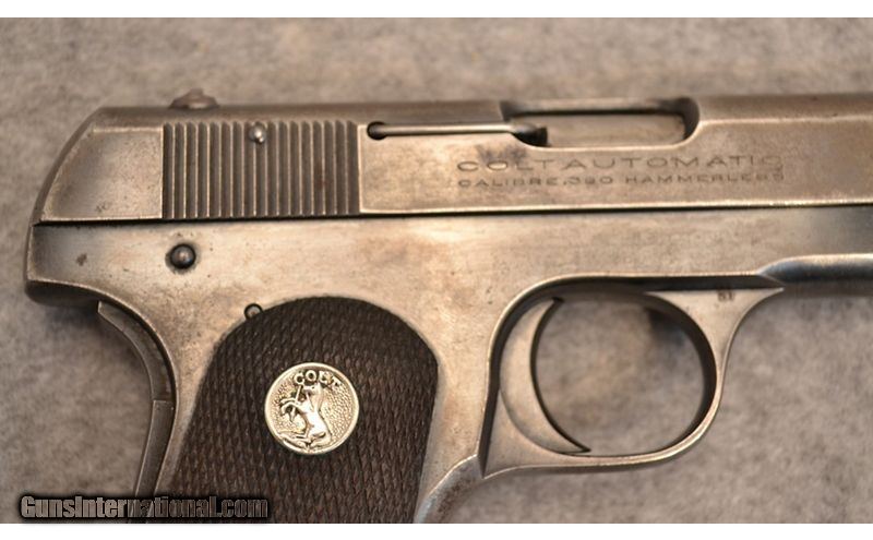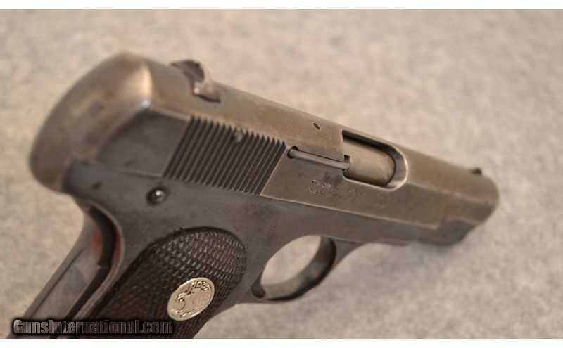 Description: If you are a noir movie fan, this model of Colt was often used by Hollywood. This Colt was manufactured in 1932 and in very good condition. The finish is worn but has plenty of original bluing. .380 ACP SOLD Curio/Relic: Yes Metal Condition: Very good...has original patina Wood Condition: Factory wooden grips Bore Condition: Excellent...bright and no pitting Barrels: 4 Weight: 2 lbs Sights: Open Item Location: Rogers, AR |