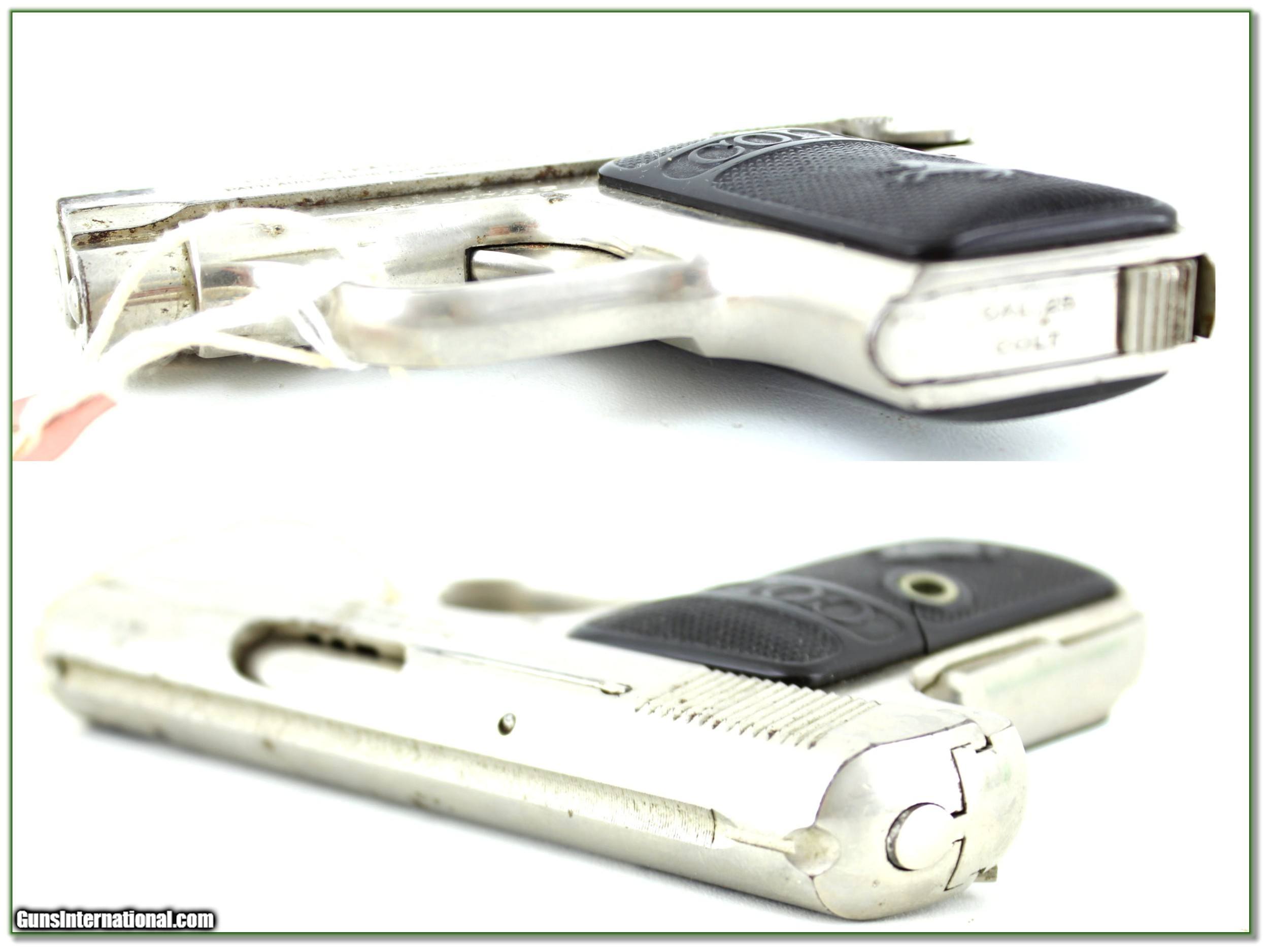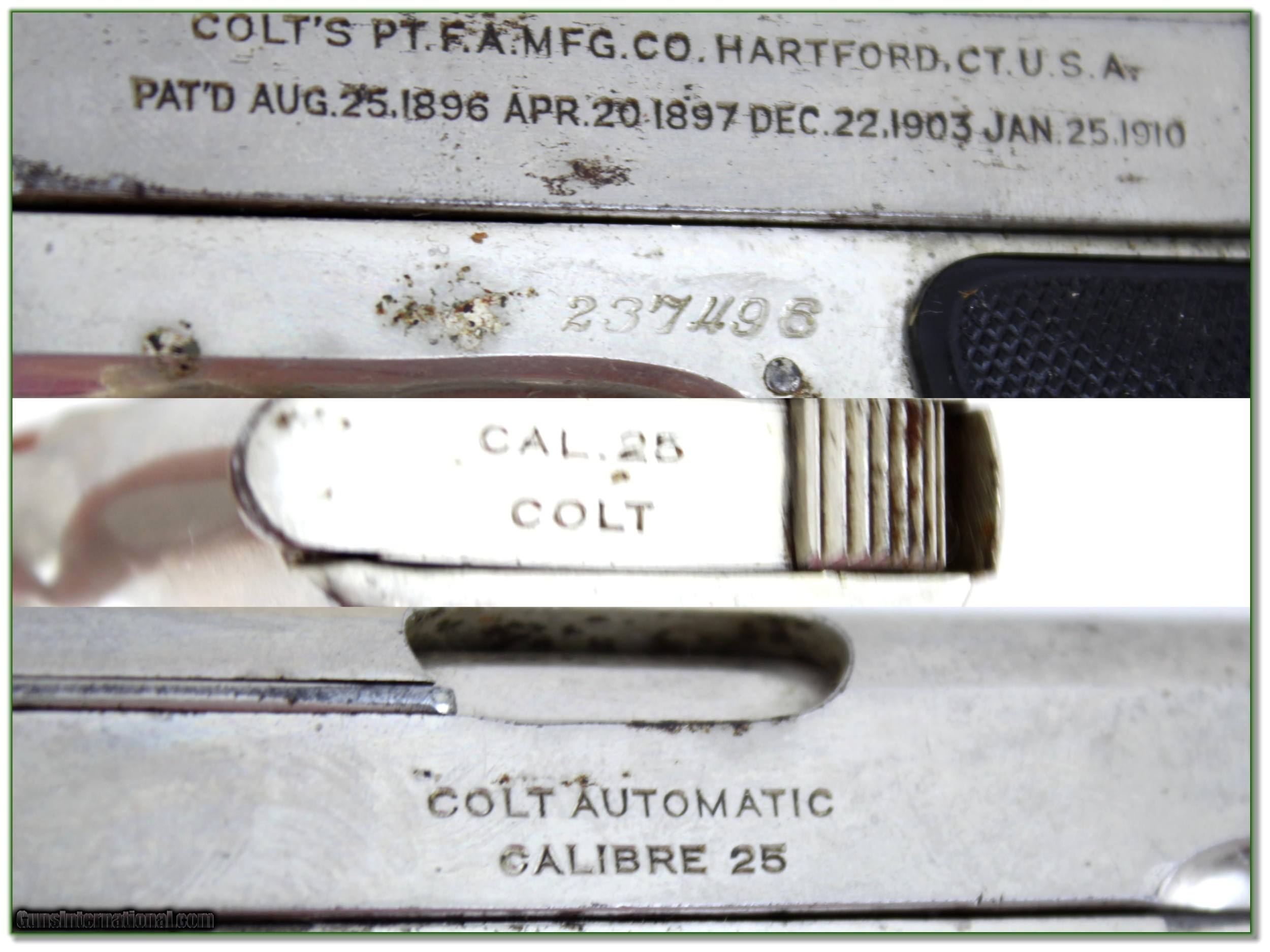 Description: This is a 1920 made Colt Model N in 25 ACP. It is all original with original magazine. Aside from the rust as seen on the left side it is excellent and is fully functional. I am selling this one on consignment and as such lay-a-way can’t be used. It does of course have the standard 3-day inspection. Shipping and insurance is $39. Please email me with any questions or larger pictures. (Consign your quality firearms with Shooting Investments for only 12%! Let me know if you have any you would like to sell!) 20-0908 Payment: Payment is by Money Order, Cashiers Check or Personal Check. I can now also accept Credit Cards (MasterCard, Visa, Discover & American Express) with a 3% convenience fee. Shipping: The shipping charge will be listed in each description. It is $39 for most firearms. Some heavy guns or those insured for over $2000 will be higher. Shipments to Alaska and Hawaii are higher because air shipment is required. Most firearms are shipped on Tuesday and Thursday and usually in 5 days of receipt of payment. We package all shipments carefully and insure them. Optics are shipped Priority Mail and most other non-firearm shipments are shipped First Class. Returns: Our return policy is simple. If for any reason you are not pleased with your purchase, you may return your item for a full refund of purchase price. Ammunition cannot be returned. It is important to us that you are happy. Guns cannot be fired or dissembled before returning them and they must be returned in the same condition as received. Notification of a return must occur with-in 3 days of receipt at your dealer. Shipping, convenience and dealer fees are not refundable and are the responsibility of the buyer. Lay-a-way: If needed, we offer a 60 day lay-a-way option on most firearms. It is 1/3 now, 1/3 in 30 days and 1/3 in 60 days. Lay-a-way firearm sales are final and if not completed the first payment cannot be returned. Consigning your firearms with Shooting Investments: We will help you get top dollar for your firearms. While most local guns shops charge 20% or more, our fee is only 12% with a minimum of $75. At your local gun shop it might take months to sell. Selling on-line provides instant access to thousands of interested buyers. You won’t find any other on-line dealer willing to sell your firearms for only 12% or listing every gun on 3 separate s. Selling through an House typically costs the seller 15% and the buyer an addition 15% (so 30%) and you have to wait several months to sell and longer to receive funds. If properly priced, we will sell your firearms in a few weeks. Send us an email or give us a call and we’ll explain how easy it is for you to get top dollar. Trading: Trading for use is really just buying your gun to re-sell. If you have a gun you want to trade, please email a picture and we will let you know what we can give or it. You will always get more if we sell it for you on consignment. Help for California Buyers: We are happy to ship to California. It is the buyer’s responsibility to make sure any item you buy is legal in your state. We are also happy to help with your purchase of a firearm from someone other than us. If you see a gun you would like to buy but the seller can’t or won’t ship to California they can ship to use and we’ll then ship it to your California dealer. The cost for this service is only $30 + shipping. Let us know if we can help! SOLD |