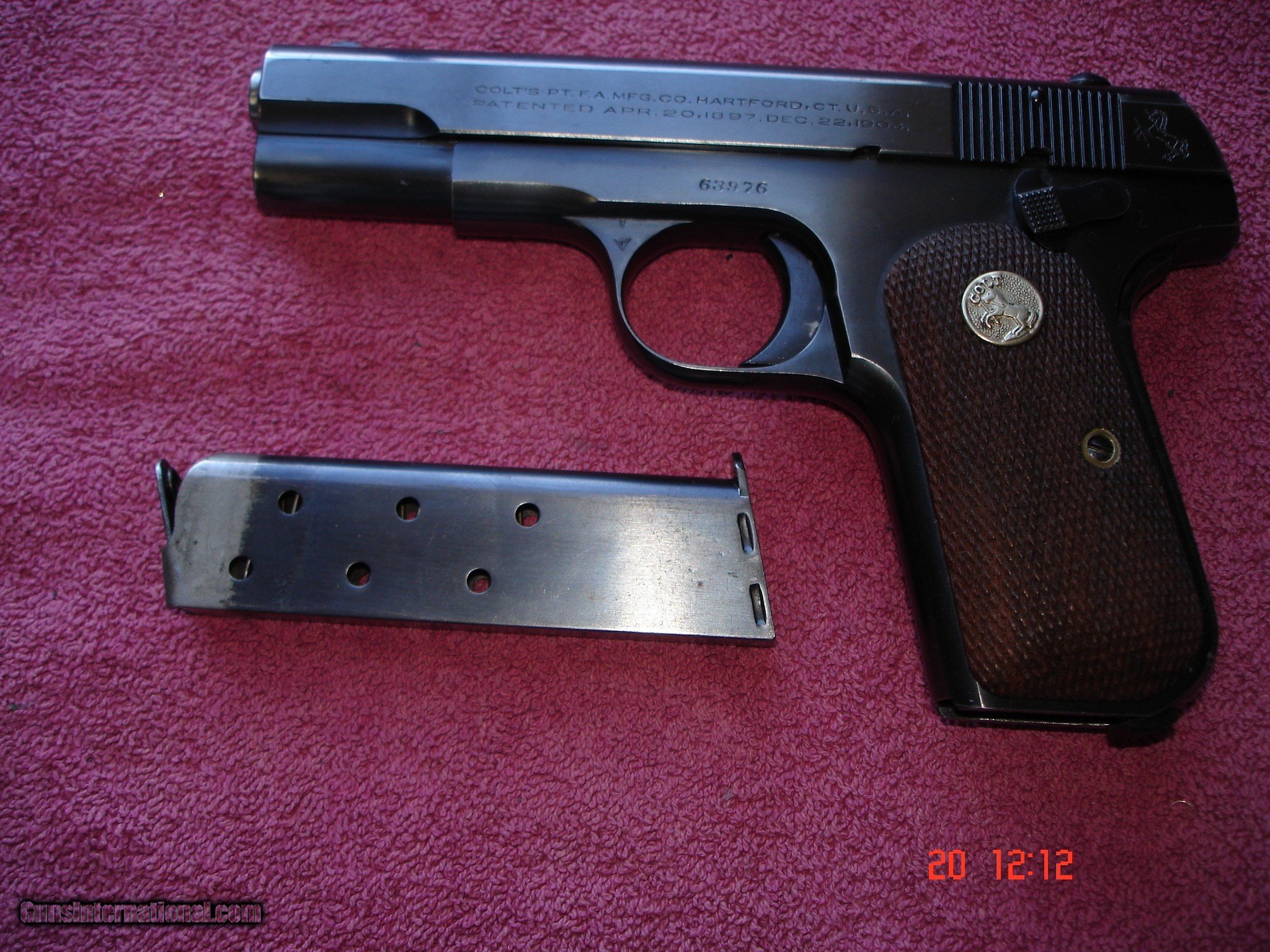 Description: Out of my collection I have for sale a Colt Pocket Pistol Model 1908, .380 ACP. MFG in 1923 Semi-Auto, 1st. Model Hammerless pocket pistol 4" Barrel with Bushing in Near Mint Original condition. Two tone 7- round Mag. Beautiful Checkered Walnut stocks,with silver Medallions. Original Blueing is in a Good 98% condition. 4"BBl. has a mint bore. Weight is 24oz. This Little Gem shows very little use. Functions Perfectly, SER#.63976 Comes with a Vintage Copy of a Colt Black Two piece Box with copies of Vintage Owners Manual ETC. What a Great Little Colt Pocket Pistol. Priced At $2299.00 Shipping & insurance to your FFL is $35.00 C&R is also fine Ask About our Free Layway's! Sale Pending! SOLD Curio/Relic: Yes |