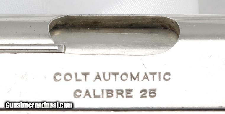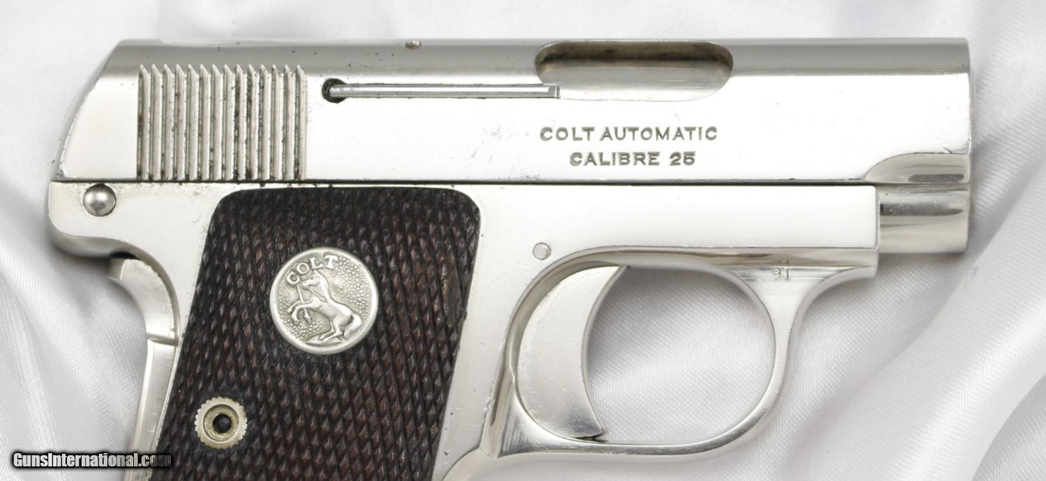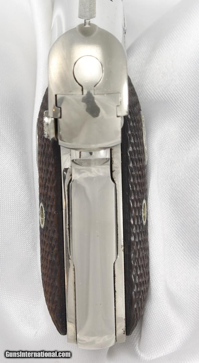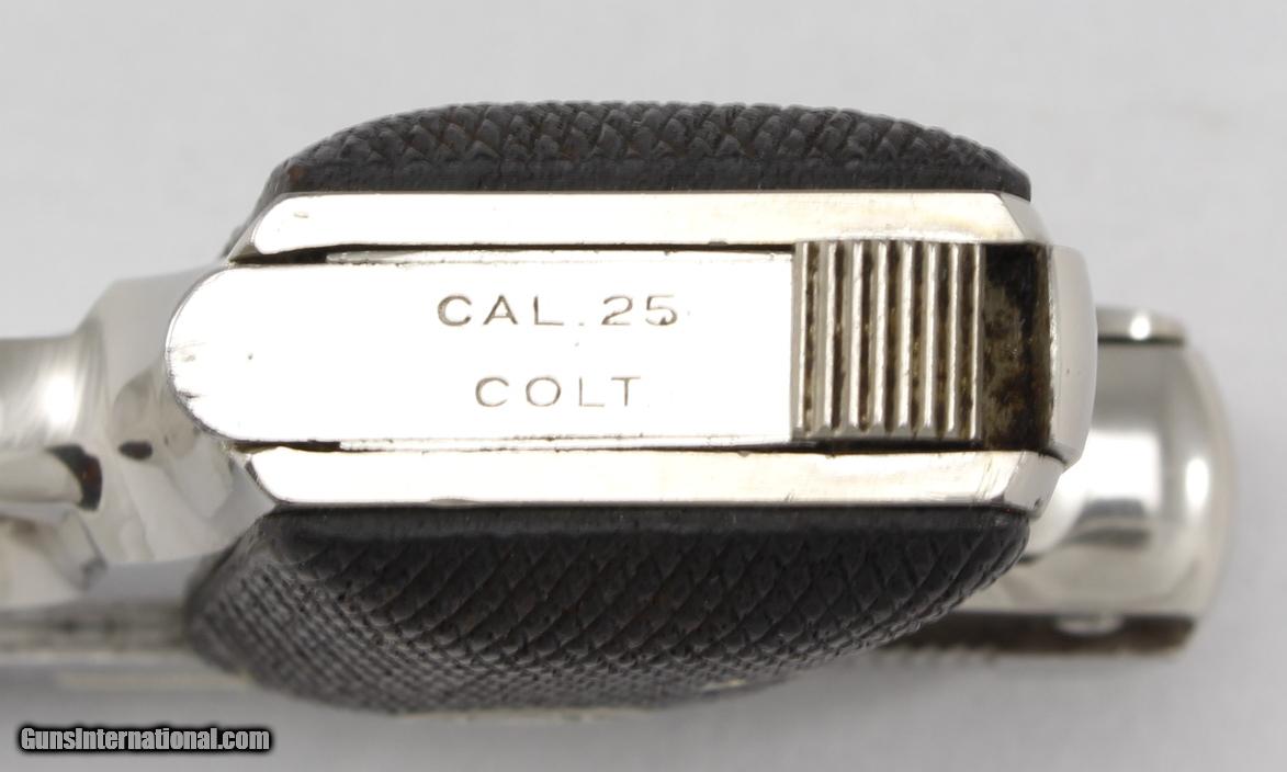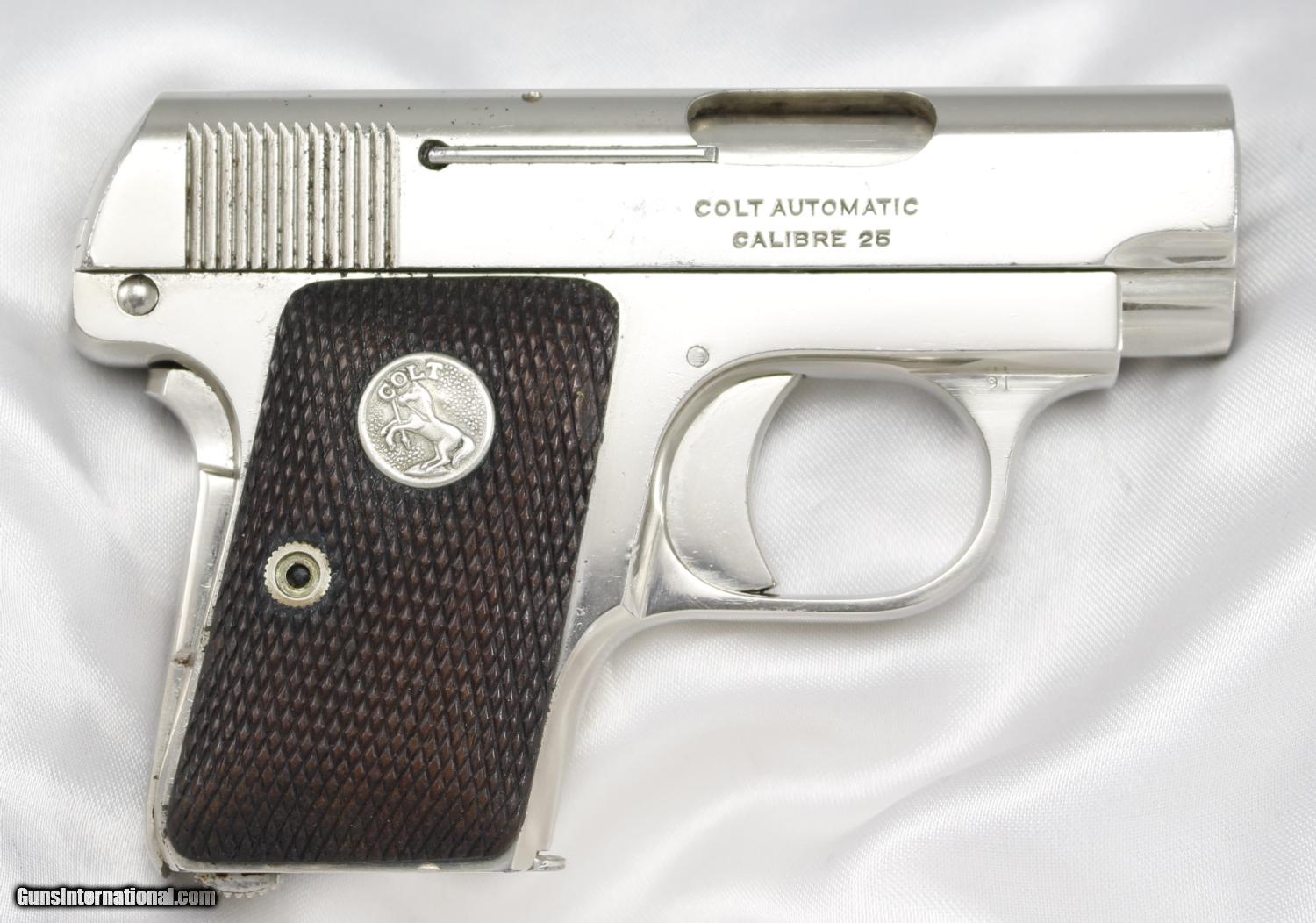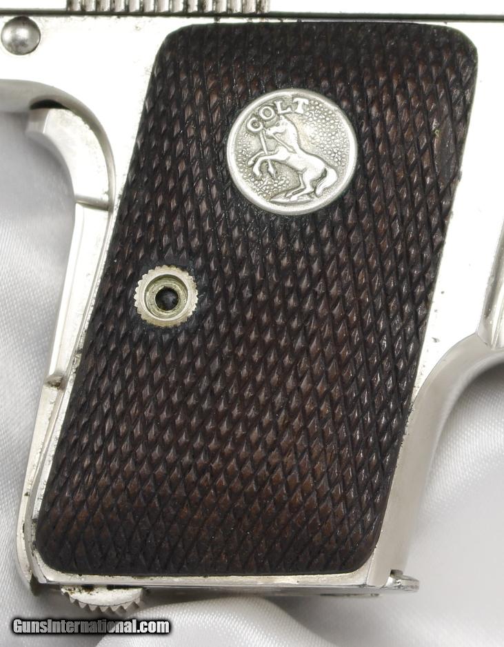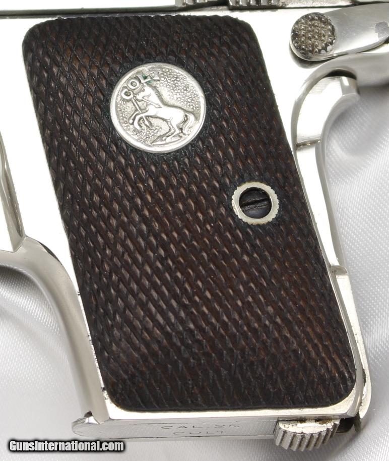 Description: This is a "COLT VEST POCKET MODEL 1908", Made in 1920, Nickel, Original Walnut Grips, Excellent Condition, Original Magazine. Very Hard to find in this Condition. Ship to Lower 48, $25.00 SOLD Curio/Relic: Yes Manufacturer: COLT Model: VEST POCKET MODEL 1908 Serial Number: 243762 Caliber Info: .25 Condition: EXCELLENT Bore Condition: EXCELLENT Barrels: 2 Finish: NICKEL |