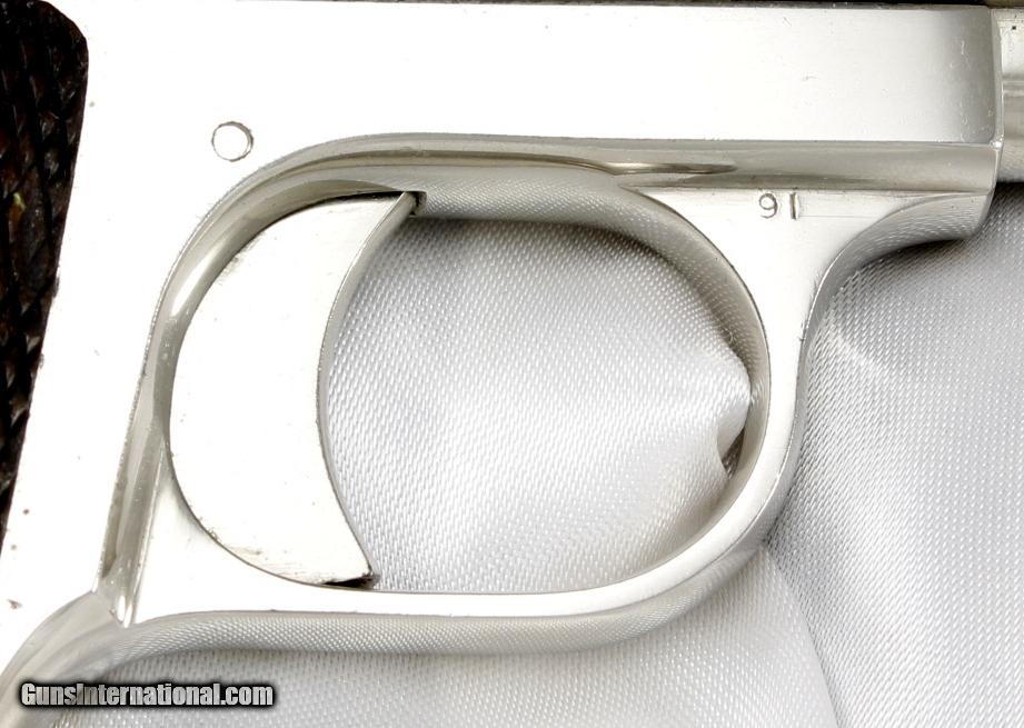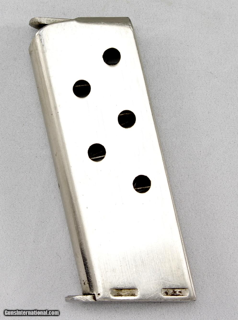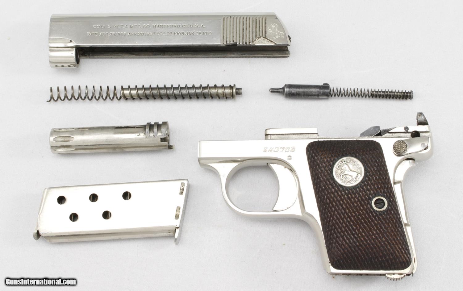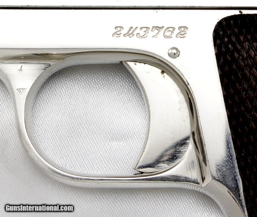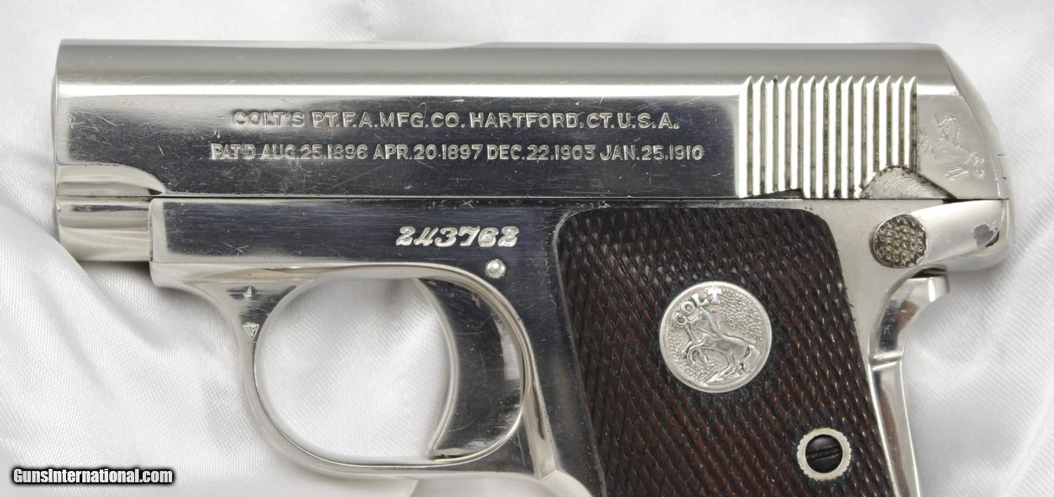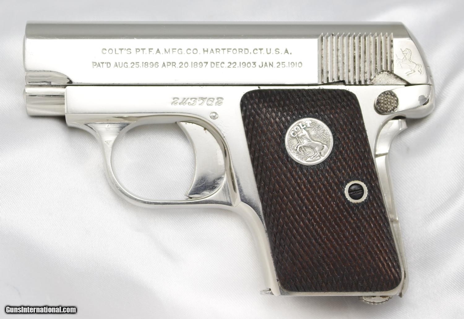 Description: This is a "COLT VEST POCKET MODEL 1908", Made in 1920, Nickel, Original Walnut Grips, Excellent Condition, Original Magazine. Very Hard to find in this Condition. Ship to Lower 48, $25.00 SOLD Curio/Relic: Yes Manufacturer: COLT Model: VEST POCKET MODEL 1908 Serial Number: 243762 Caliber Info: .25 Condition: EXCELLENT Bore Condition: EXCELLENT Barrels: 2 Finish: NICKEL |