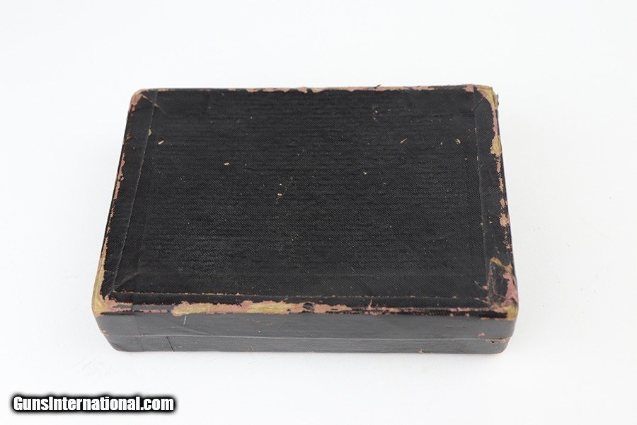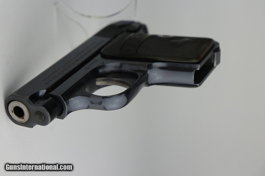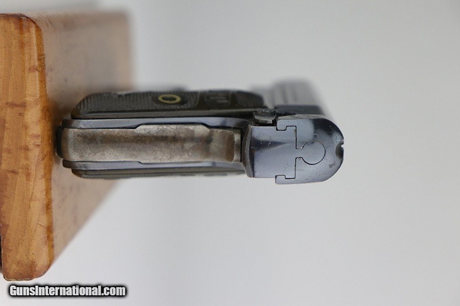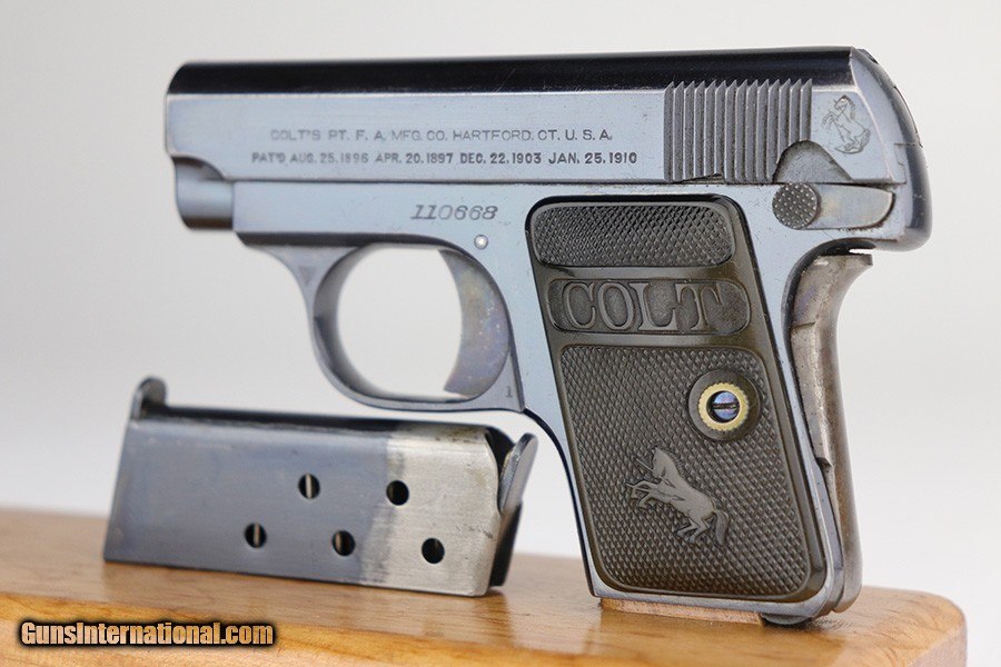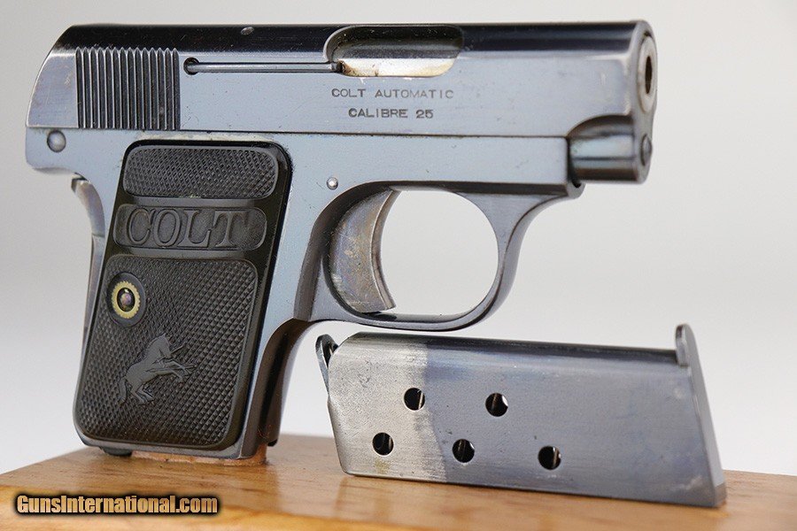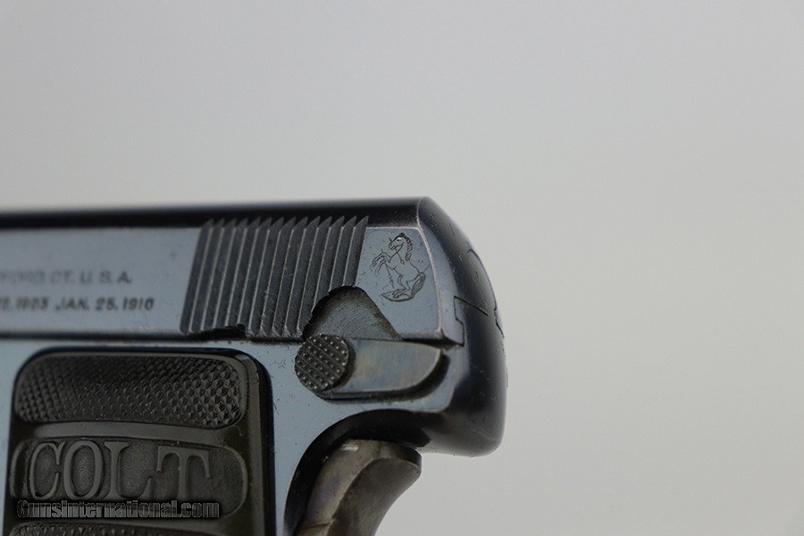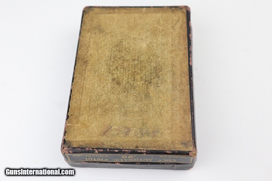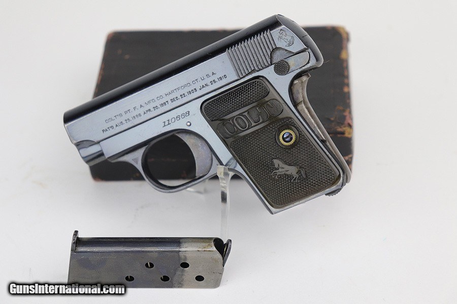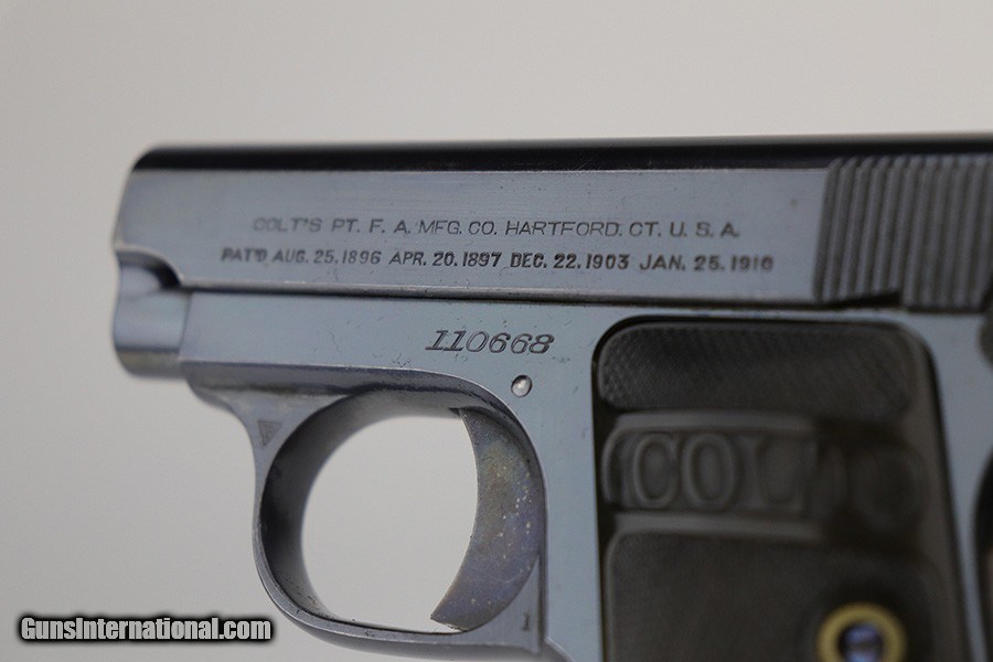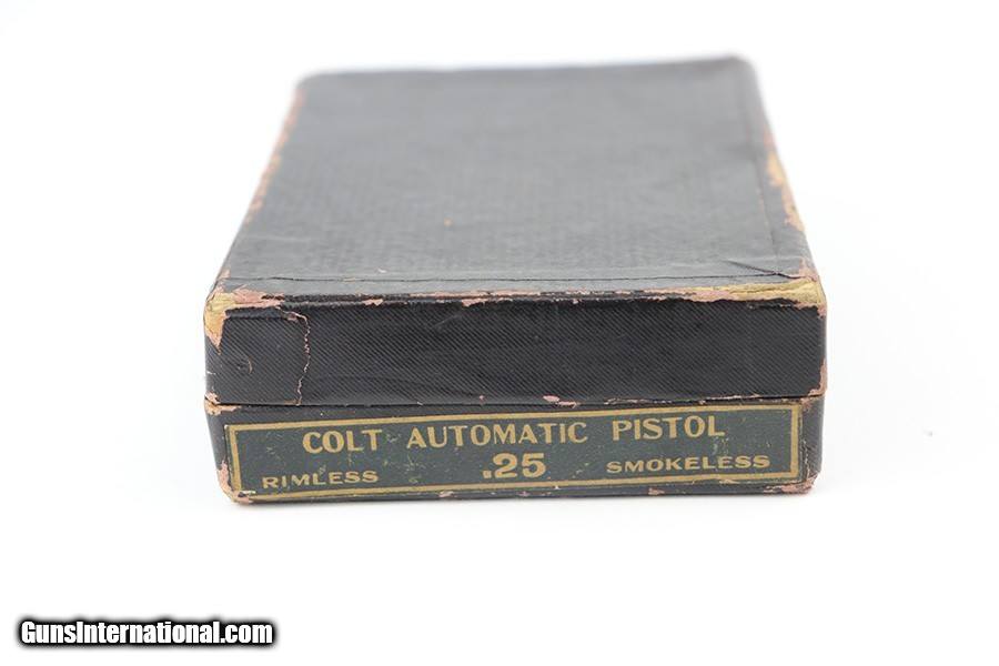 Description: This is an excellent example of a Colt Model 1908 Vest Pocket pistol, chambered in .25 ACP. Manufactured in 1914. It is all matching and has the proper Rampant Colt logo at the back left of the slide. It comes with an original box that is hand-numbered to match the gun but very faint and hard to see. The gun has retained about 97% of its original beautiful deep Colt bluing. Most of the case-hardening is worn on the grip safety but still mostly intact on the trigger. There is very minor wear around the high edges of the slide and around the muzzle. A few very light surface scratches on the top of the slide and a few small dots of freckling near the tang. Comes with minty hard rubber Colt grips and a proper two-tone magazine. The bore is excellent with strong rifling. SOLD Handgun Caliber: .25 ACP (6.35mm Browning, 6.35×16mmSR) Bore: 9/10 Condition: ~97% |