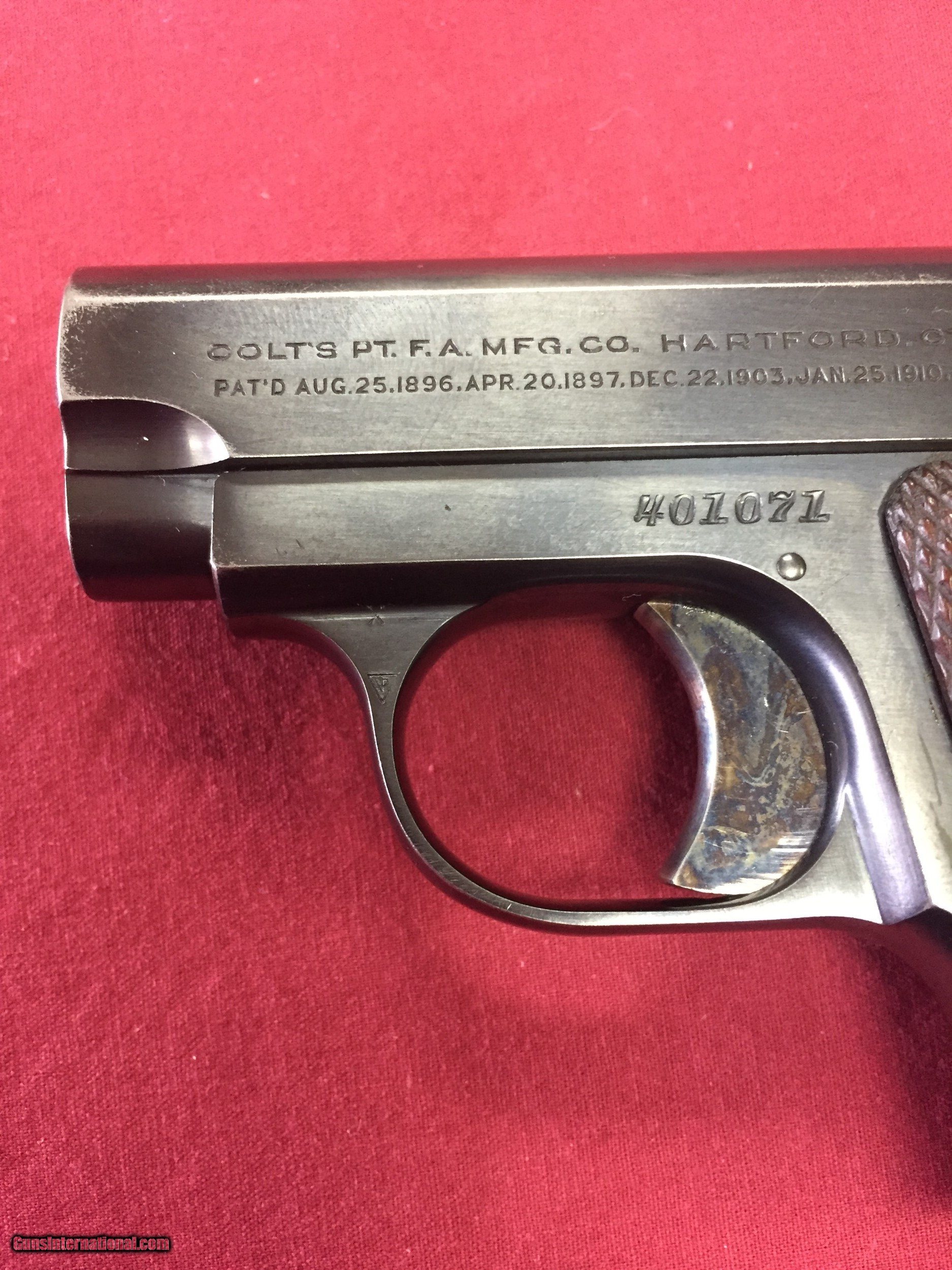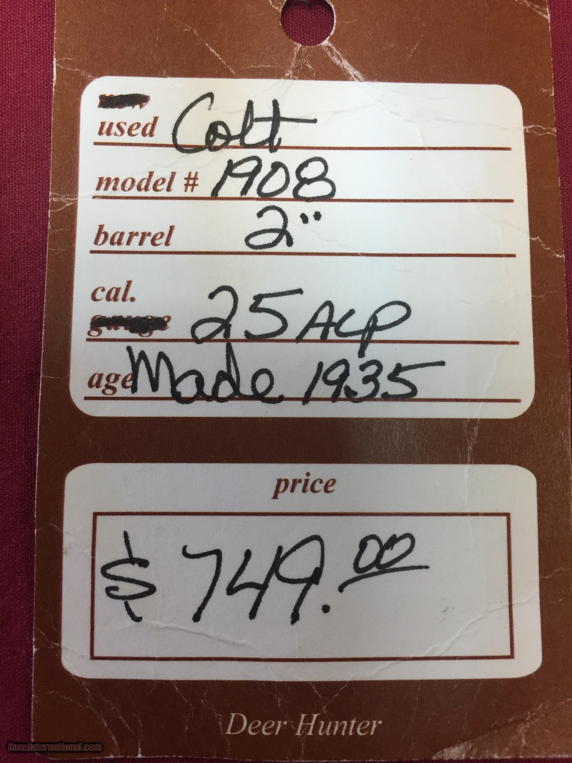 Description: SOLD FOR SALE Colt 1908, 7 shot, 25 acp, 2" barrel, beautiful bore, Excellent condition, CIRCA 1935 We accept VISA,M/C,DISCOVER Shipping to lower 48 is $30.00 US PRIORITY MAIL SOLD |