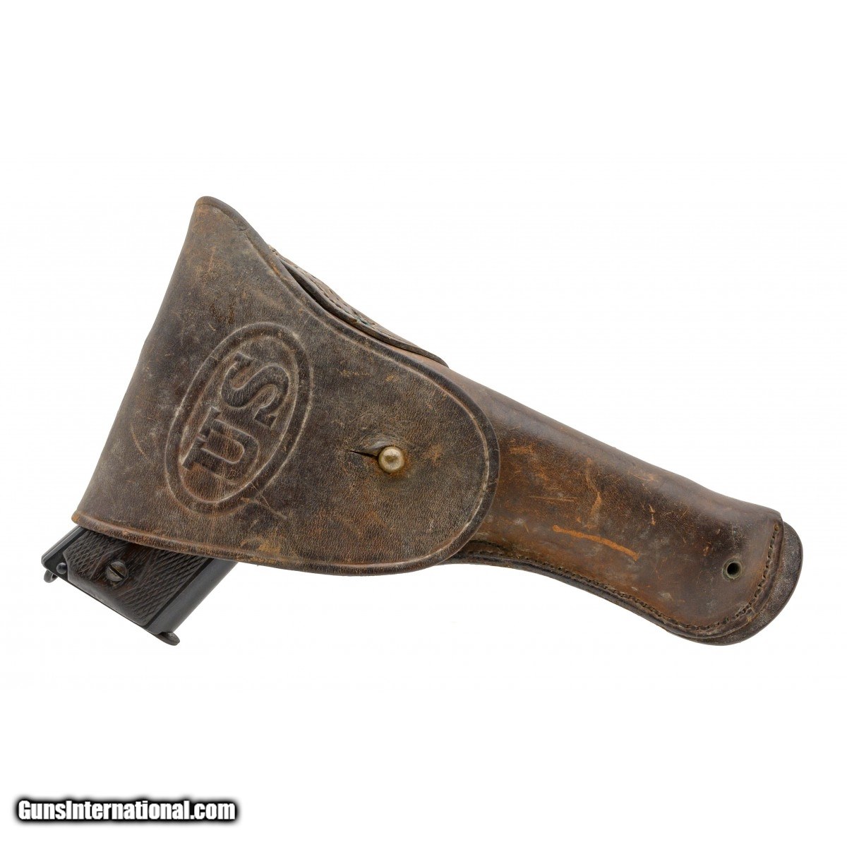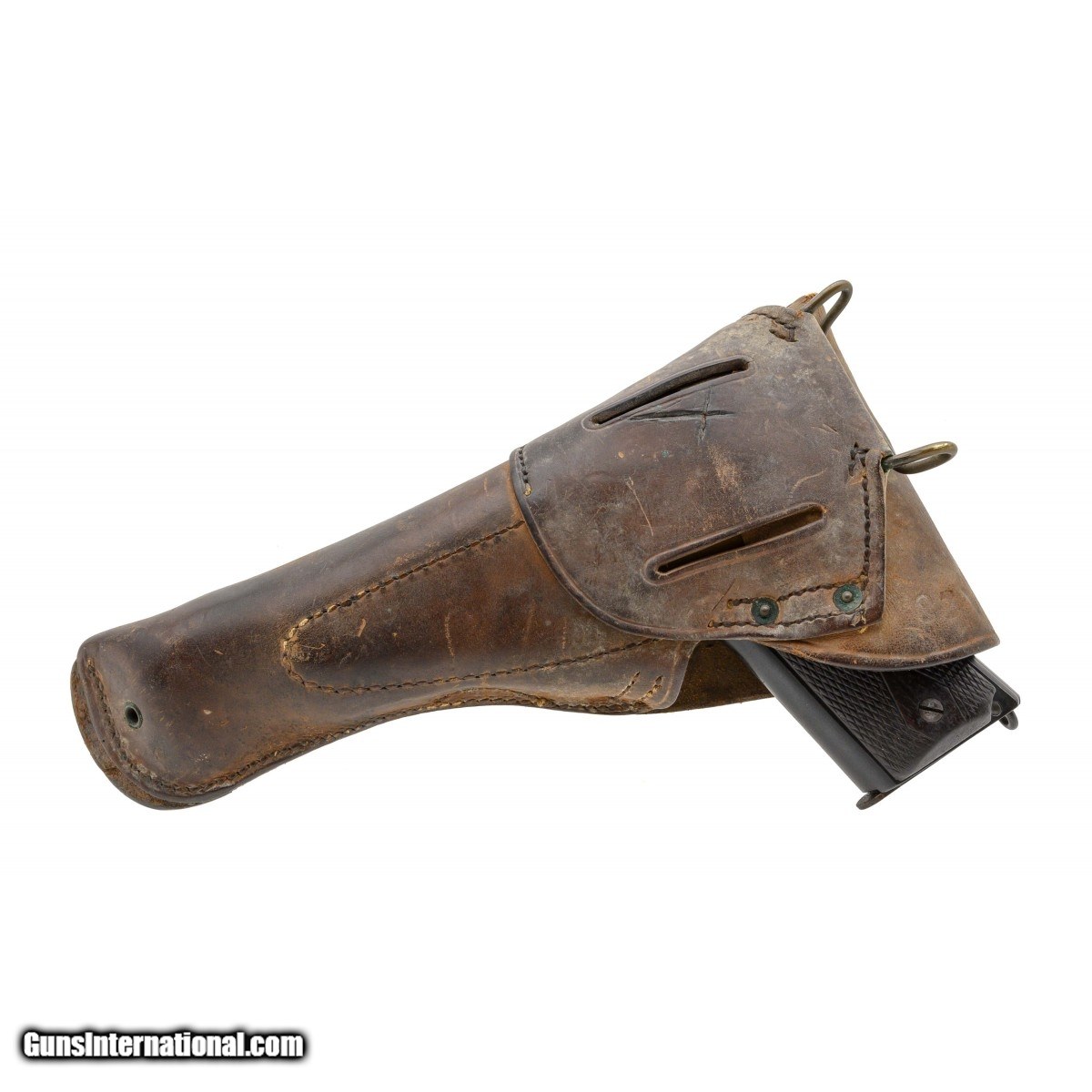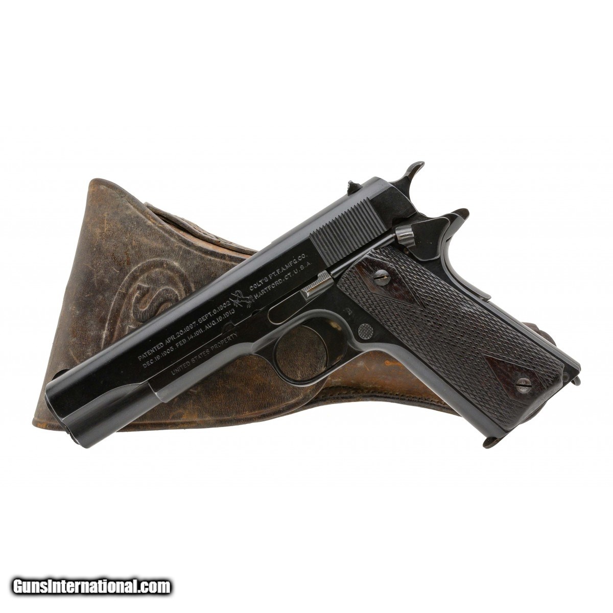 SN: 311419. Made in 1918 by COLT's Patent Firearms with a 5.03-inch barrel. Pistol is equipped with the short tang grip safety, a Type C long beavertail hammer, long trigger, Type B ""U"" notch rear sight, the Type 1 flat mainspring housing & a Type 3 ""round detent"" recoil spring plug. The frame is marked with an eagle head ""S11"" inspection mark on the left side above the magazine release. Overall condition is excellent, but it has been refinished. Nevertheless, there is even finish across all metal parts with almost no signs of oxidation or handling wear, although there is some limited friction wear on both sides of the trigger. Comes with a pair of Type 1 checkered wood ""diamond"" grips in very good condition, one no-seam 7-round magazine made by M.S. Little Company & a 1918-dated Model of 1916 leather holster. Consignment