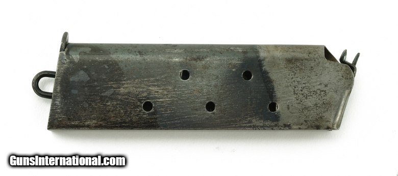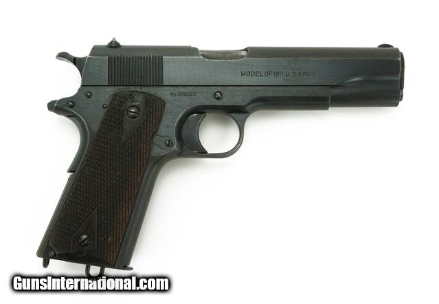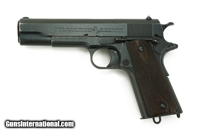 Description: " Colt 1911 .45 ACP caliber pistol. Very fine U.S. Military Colt 1911 made in 1918. Very fine gun with 90% of the original blue. Gun still has all of its original military polishing marks. The biggest concentration of blue loss is on the backstrap where it has turned to a brown patina. Grips show light wear. Magazine is a two tone with a lanyard loop. Bore has strong rifling with pitting in the grooves. Nice sharp gun! SOLD Curio/Relic: Yes |