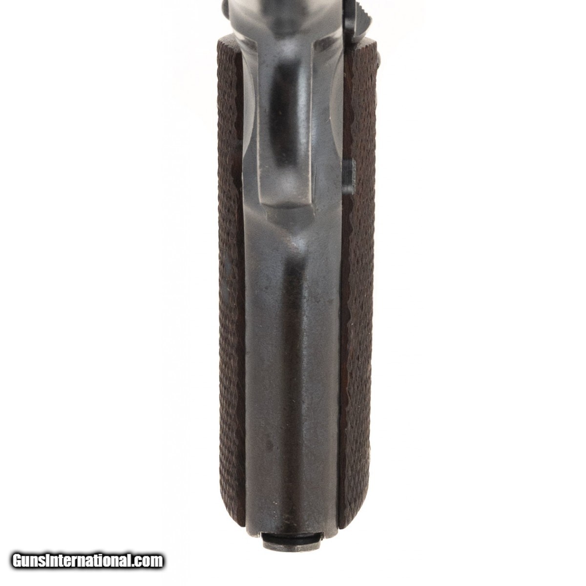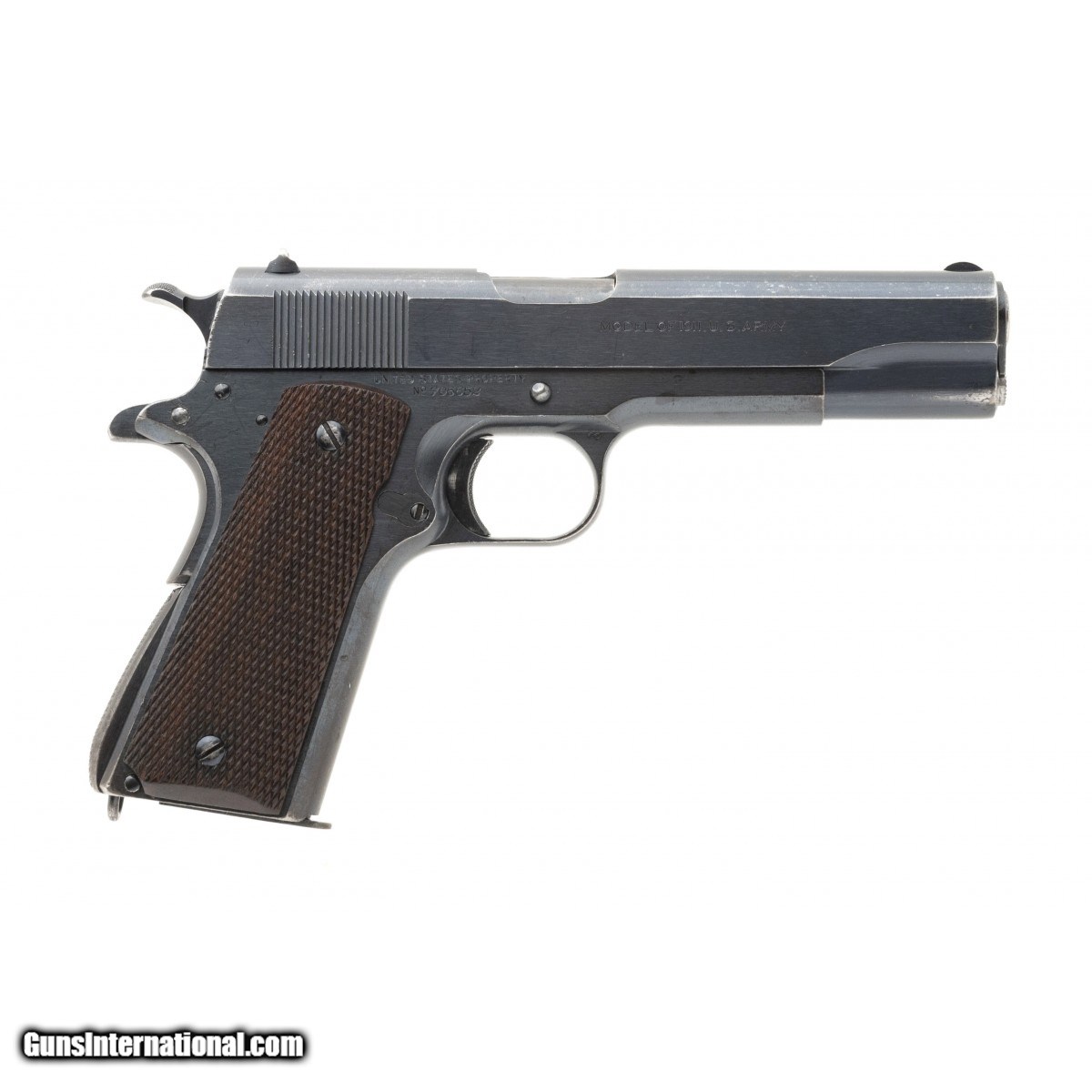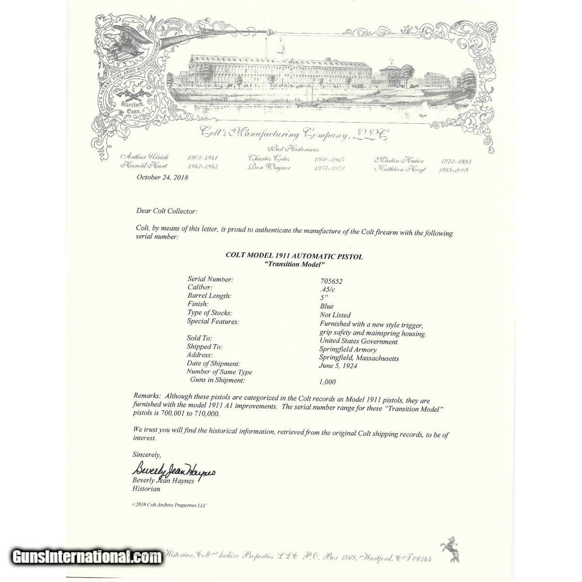 Description: "Serial number 705652. Made in 1924. 45 ACP with a 5" barrel. Absolutely beautiful condition with 97% of the original blued finish. Grips are excellent with nice sharp checkering. Bore is excellent. This is rare transitional model which has the 1911A1 features with a blued finish. This gun was part of a 10,000 gun contract from Springfield Armory that was awarded to Colt on June 12th of 1923. All of these guns were assigned the serial number 700,000 – 710,000. This contract was delivered across 1924. This gun comes with a factory letter. This gun comes with paperwork that this gun was sent to the USS Charleston from the Springfield research records. Absolutely beautiful 1911 Transitional. Hard to improve upon! SOLD Curio/Relic: Yes |