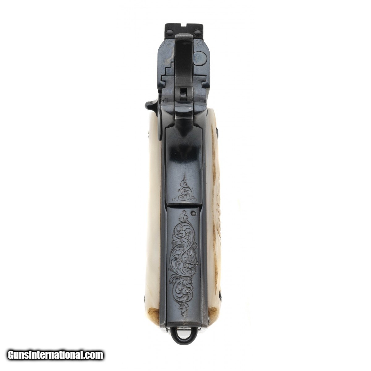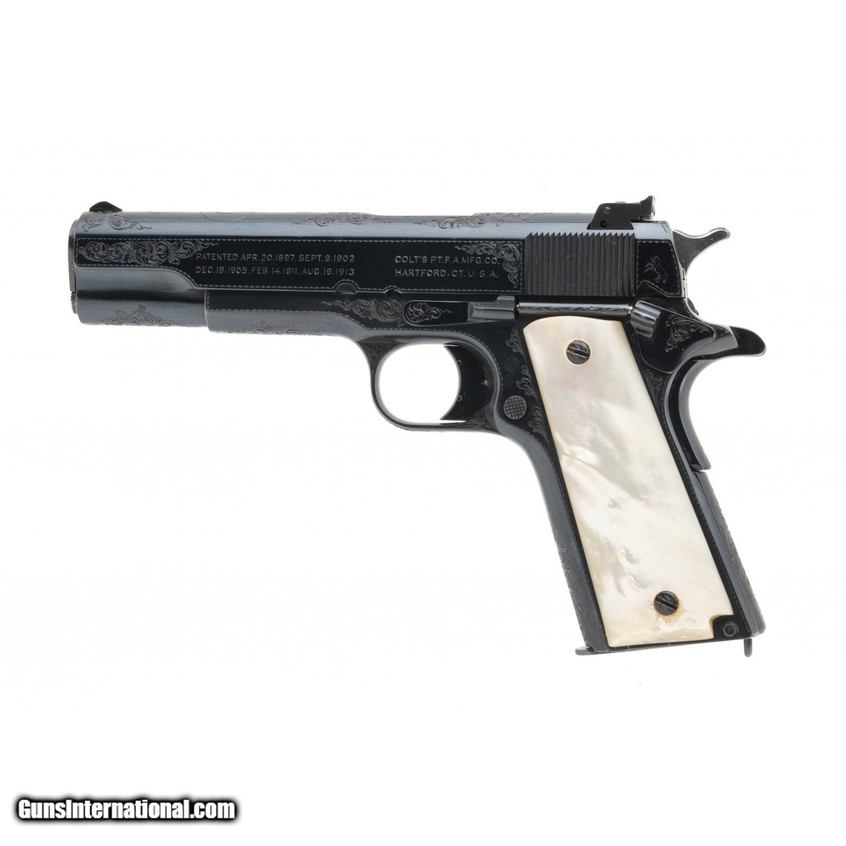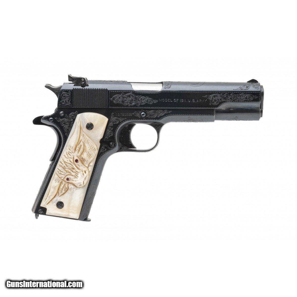 Description: " SN: 220232. Made in 1918. 45 ACP with a 5"" barrel. Beautiful custom engraved Colt 1911 with a ""U"" numbered .22 caliber conversion unit. The .45 slide has a pre-war match target rear sight, as does the conversion unit. Grips are pre-war carved steerhead pearls. Gun has 99% blue, all cased in oak. A very fine outfit. SOLD Curio/Relic: Yes |