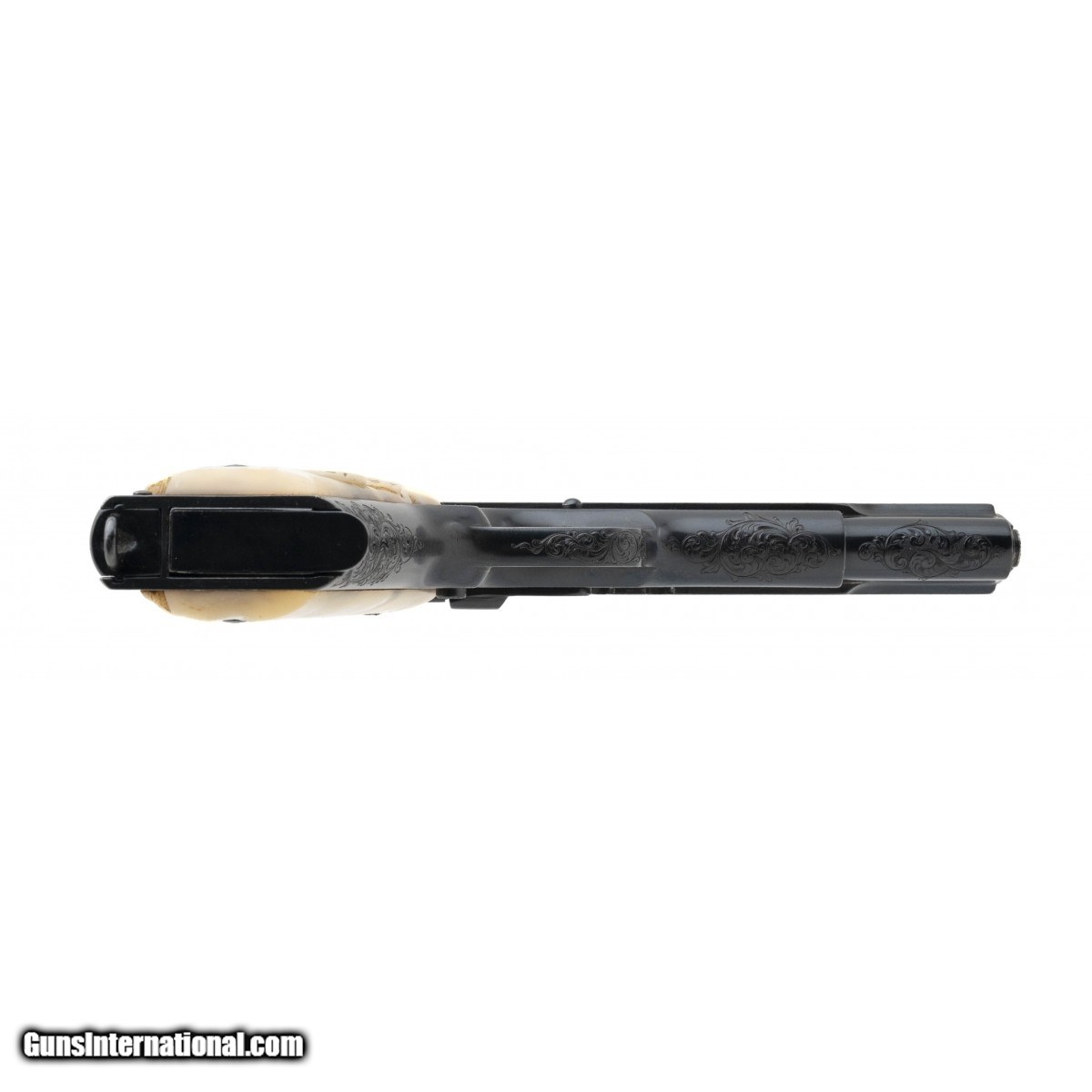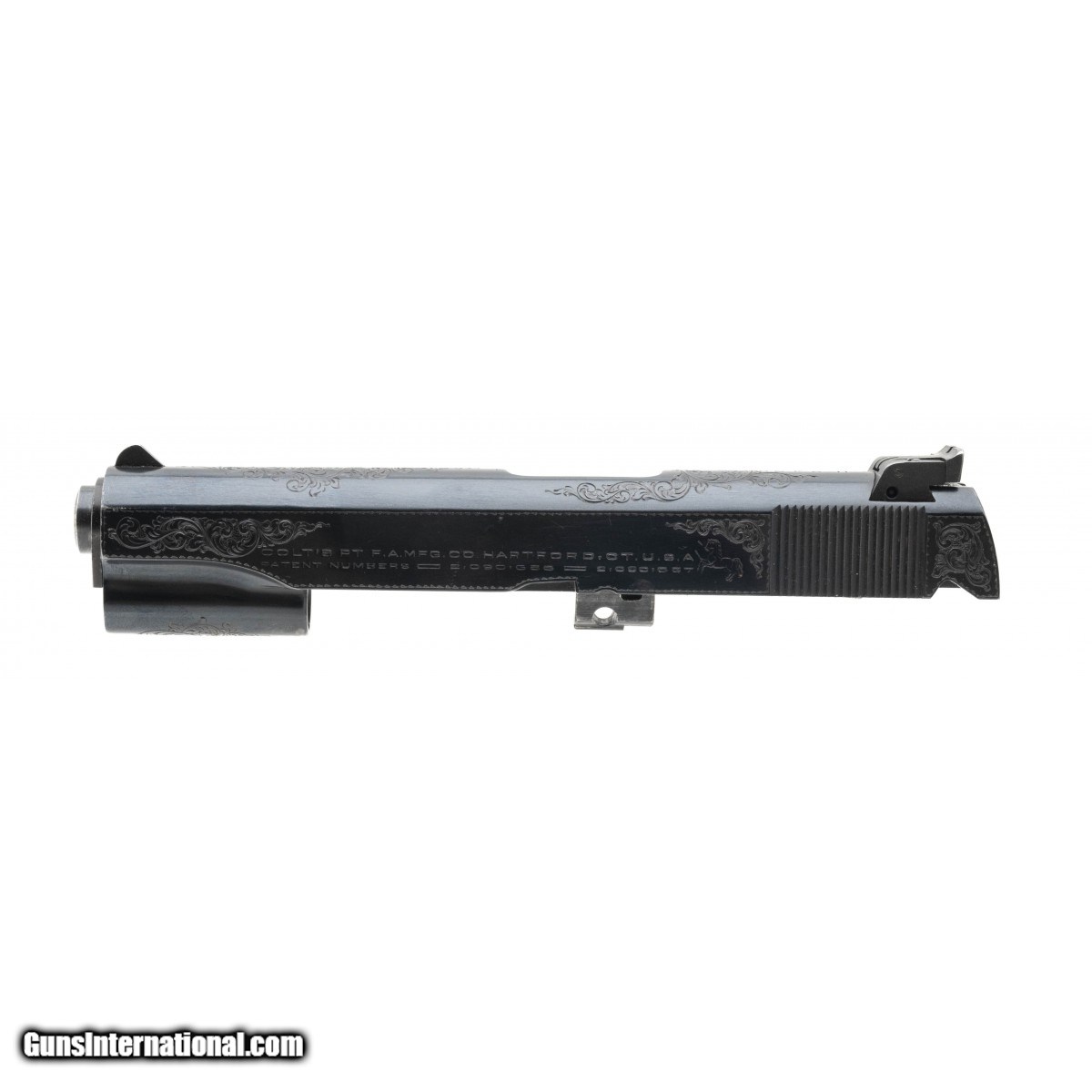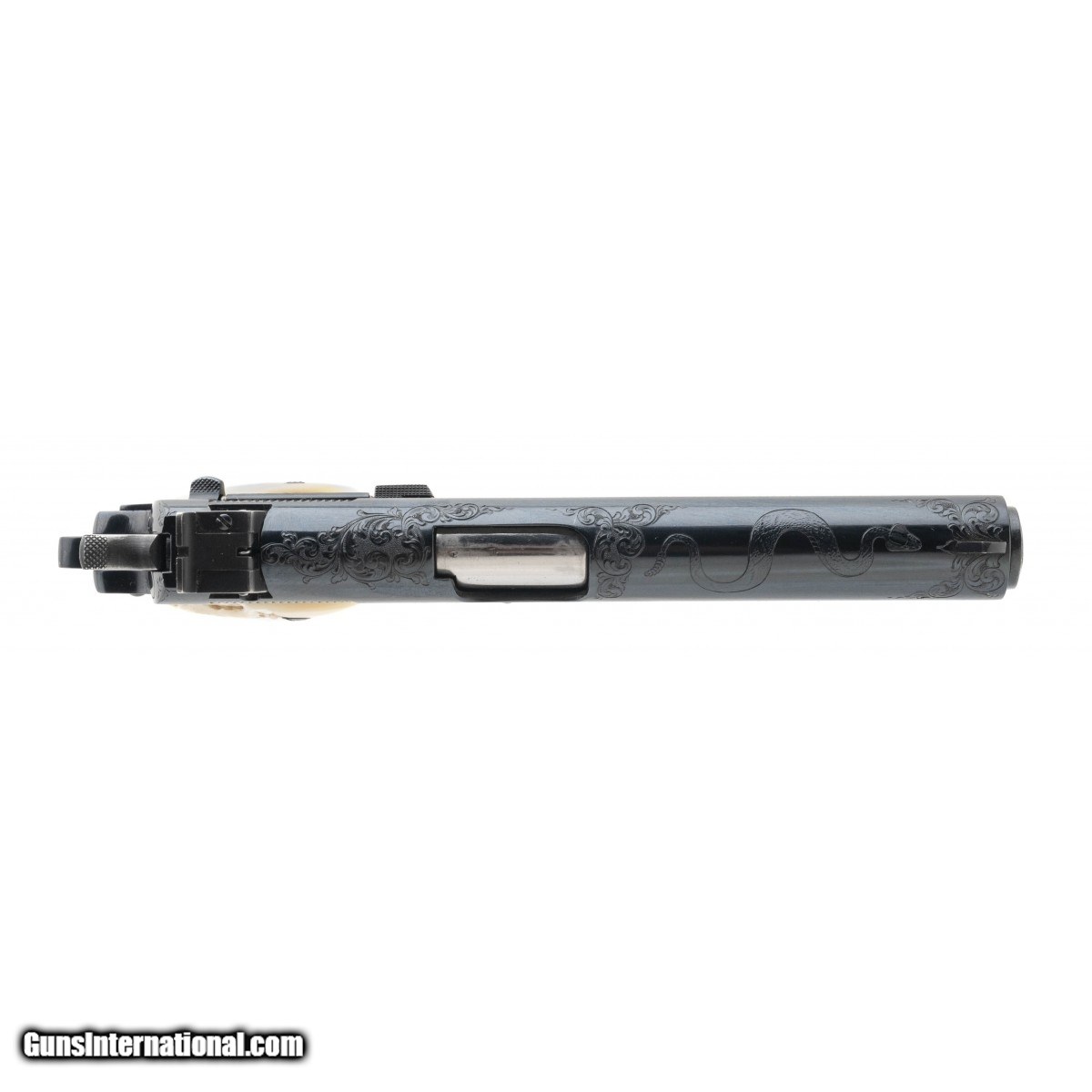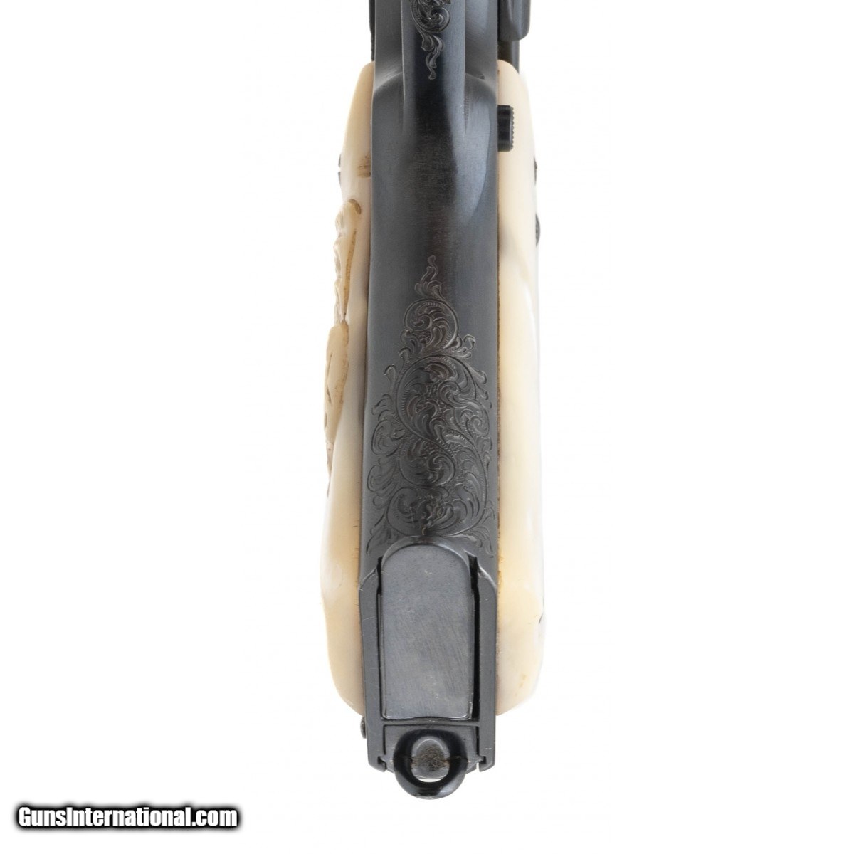 Description: " SN: 220232. Made in 1918. 45 ACP with a 5"" barrel. Beautiful custom engraved Colt 1911 with a ""U"" numbered .22 caliber conversion unit. The .45 slide has a pre-war match target rear sight, as does the conversion unit. Grips are pre-war carved steerhead pearls. Gun has 99% blue, all cased in oak. A very fine outfit. SOLD Curio/Relic: Yes |