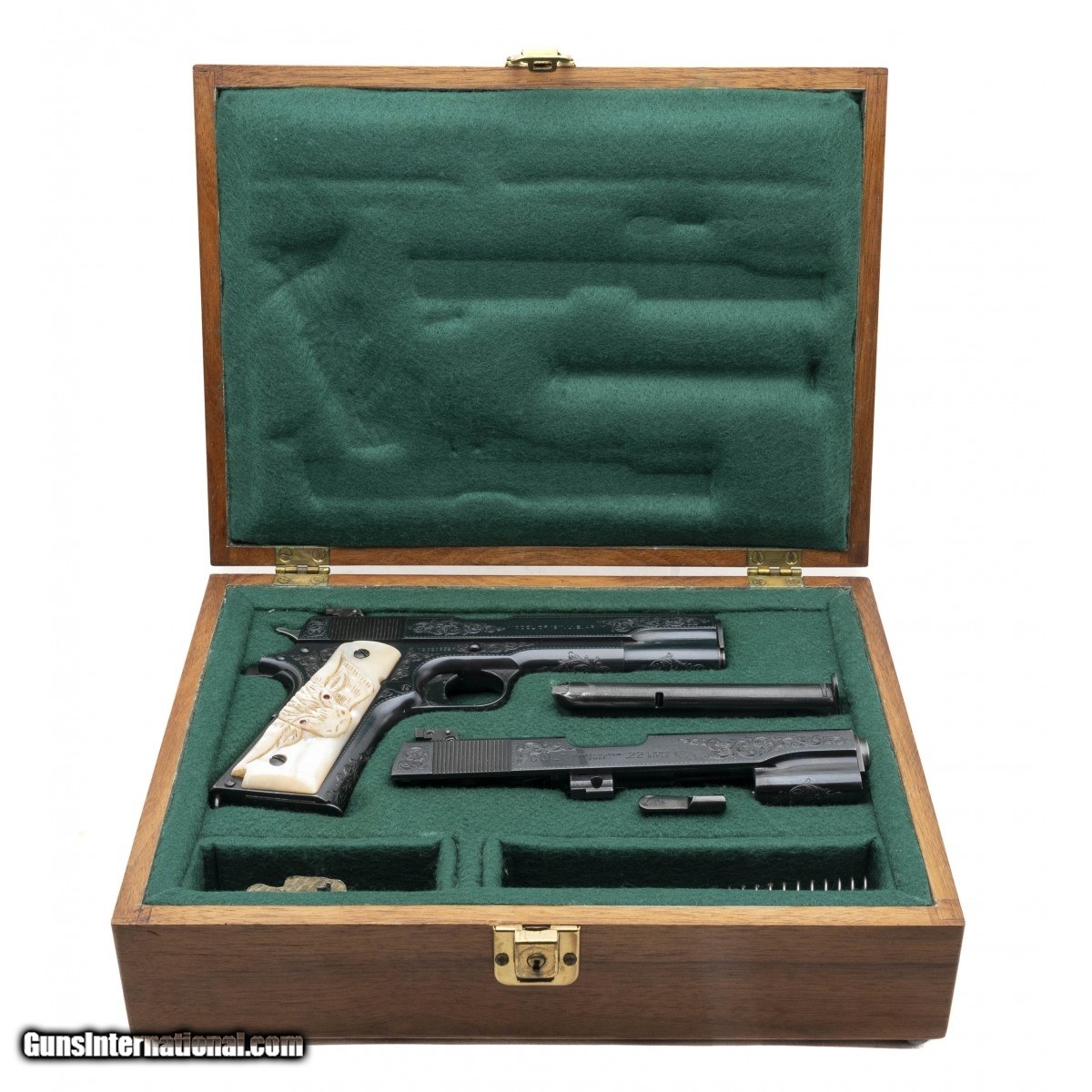 SN: 220232. Made in 1918. 45 ACP with a 5"" barrel. Beautiful custom engraved Colt 1911 with a ""U"" numbered .22 caliber conversion unit. The .45 slide has a pre-war match target rear sight, as does the conversion unit. Grips are pre-war carved steerhead pearls. Gun has 99% blue, all cased in oak. A very fine outfit.