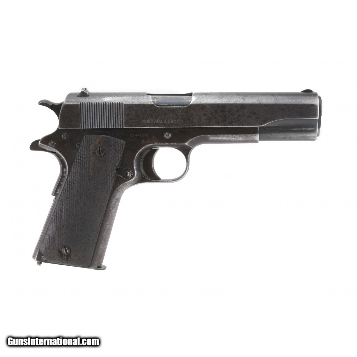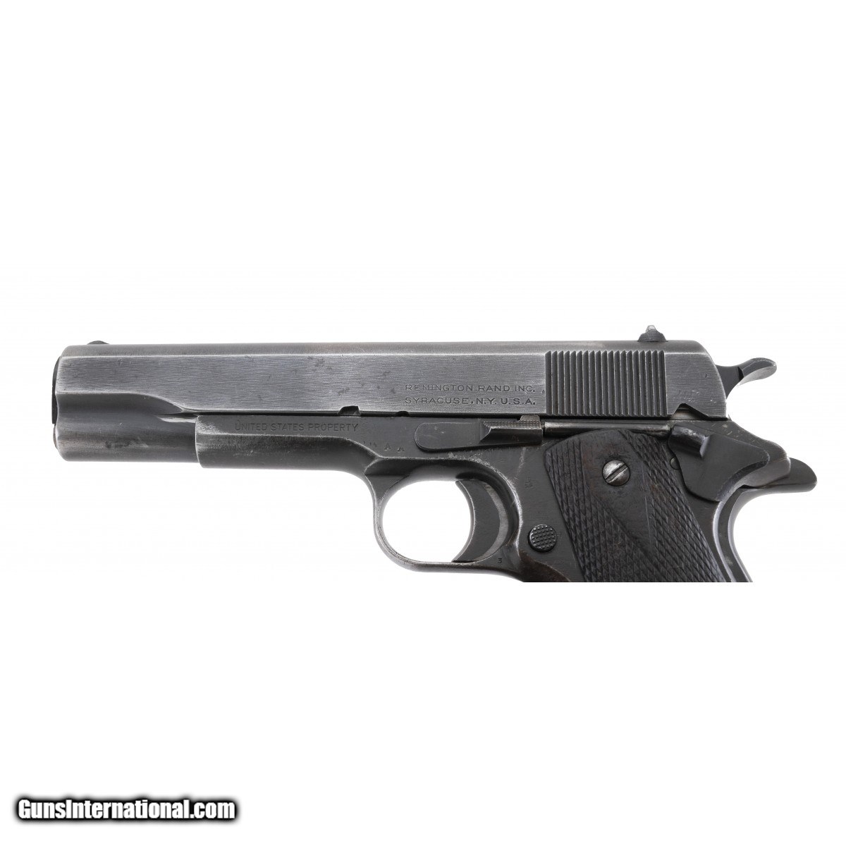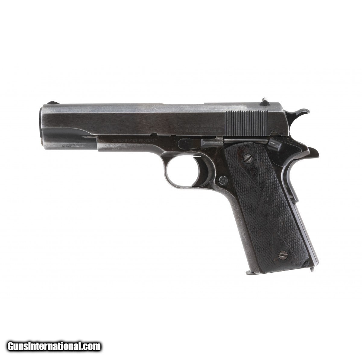US WWI 1911 with WWII Remington Rand slide. Left side of frame is marked ""United States Property"" over ""AA"" (Augusta Arsenal). Grips are WWI era and are very worn. Metal on frame is turning a brown and gray patina. Barrel is stamped ""P"" on left side of lug and ""HS"" on right side. Bore is excellent. Magazine is marked ""S"" on toe along with ""579"" on base. Fair overall condition. Reasonably priced.