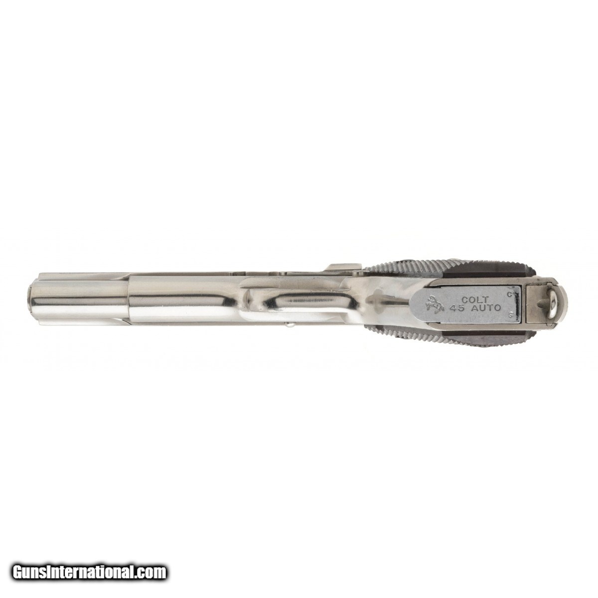 SN: 883629. Manufactured in 1943, .45ACP with a 5"" barrel. The bore has very good rifling with some light frosting in the grooves. WWII U.S. military Colt pistol with excellent nickel refinish. Is marked G.H.D. and P on the left of the frame, Ordnance wheel on the right of the slide and has a ""P"" on the top of the slide. Overall excellent condition.
