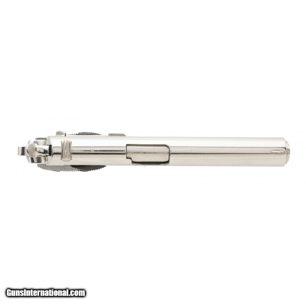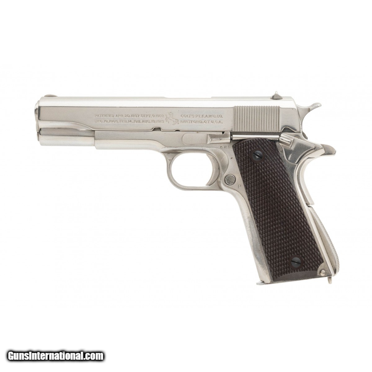 Description: " SN: 883629. Manufactured in 1943, .45ACP with a 5"" barrel. The bore has very good rifling with some light frosting in the grooves. WWII U.S. military Colt pistol with excellent nickel refinish. Is marked G.H.D. and P on the left of the frame, Ordnance wheel on the right of the slide and has a ""P"" on the top of the slide. Overall excellent condition. SOLD Curio/Relic: Yes |