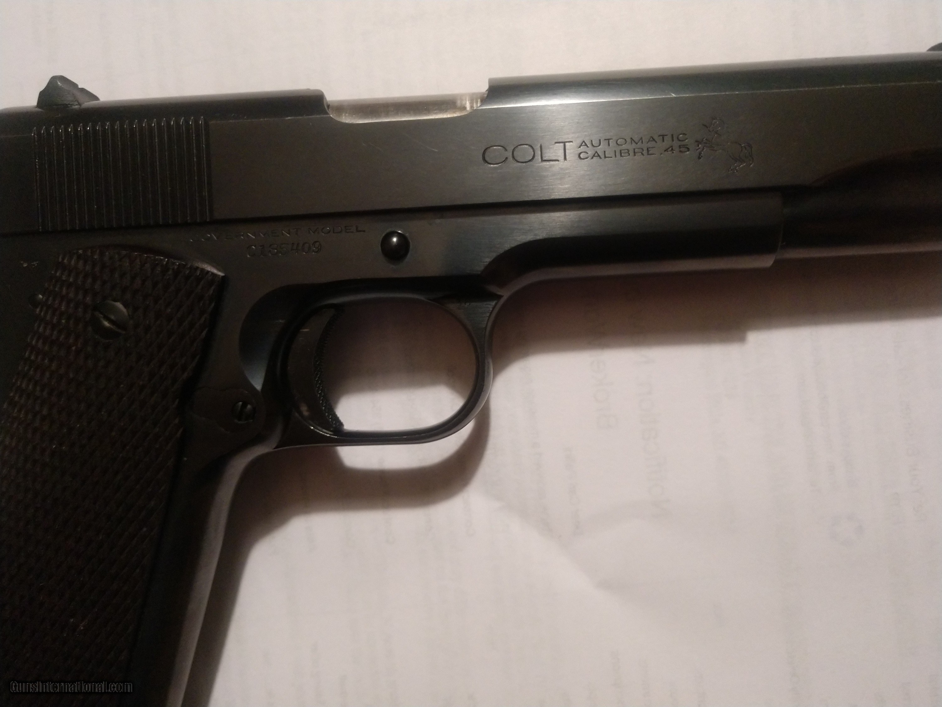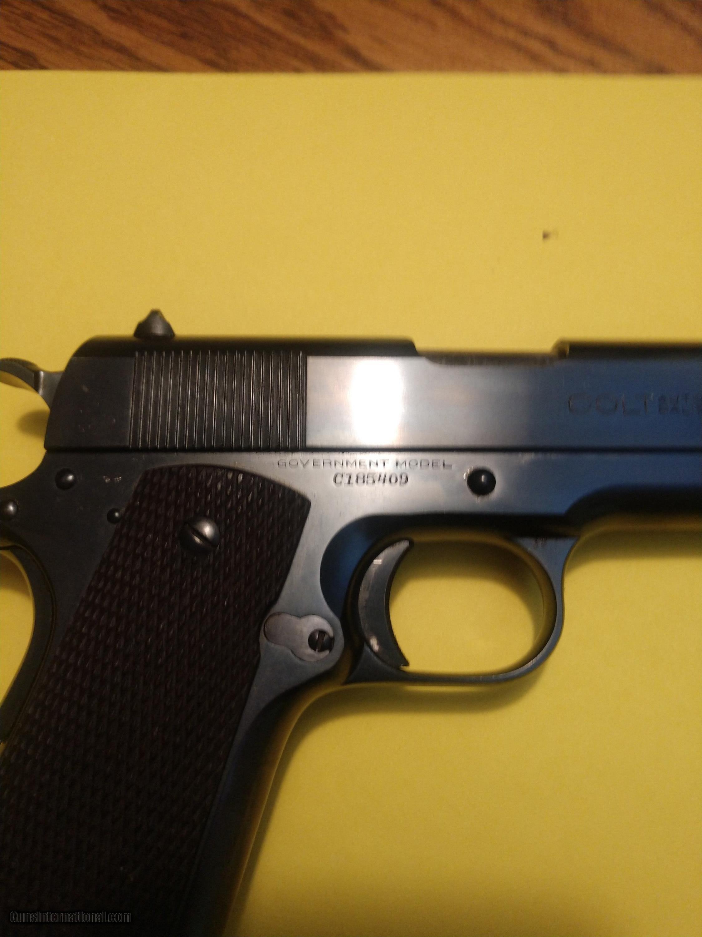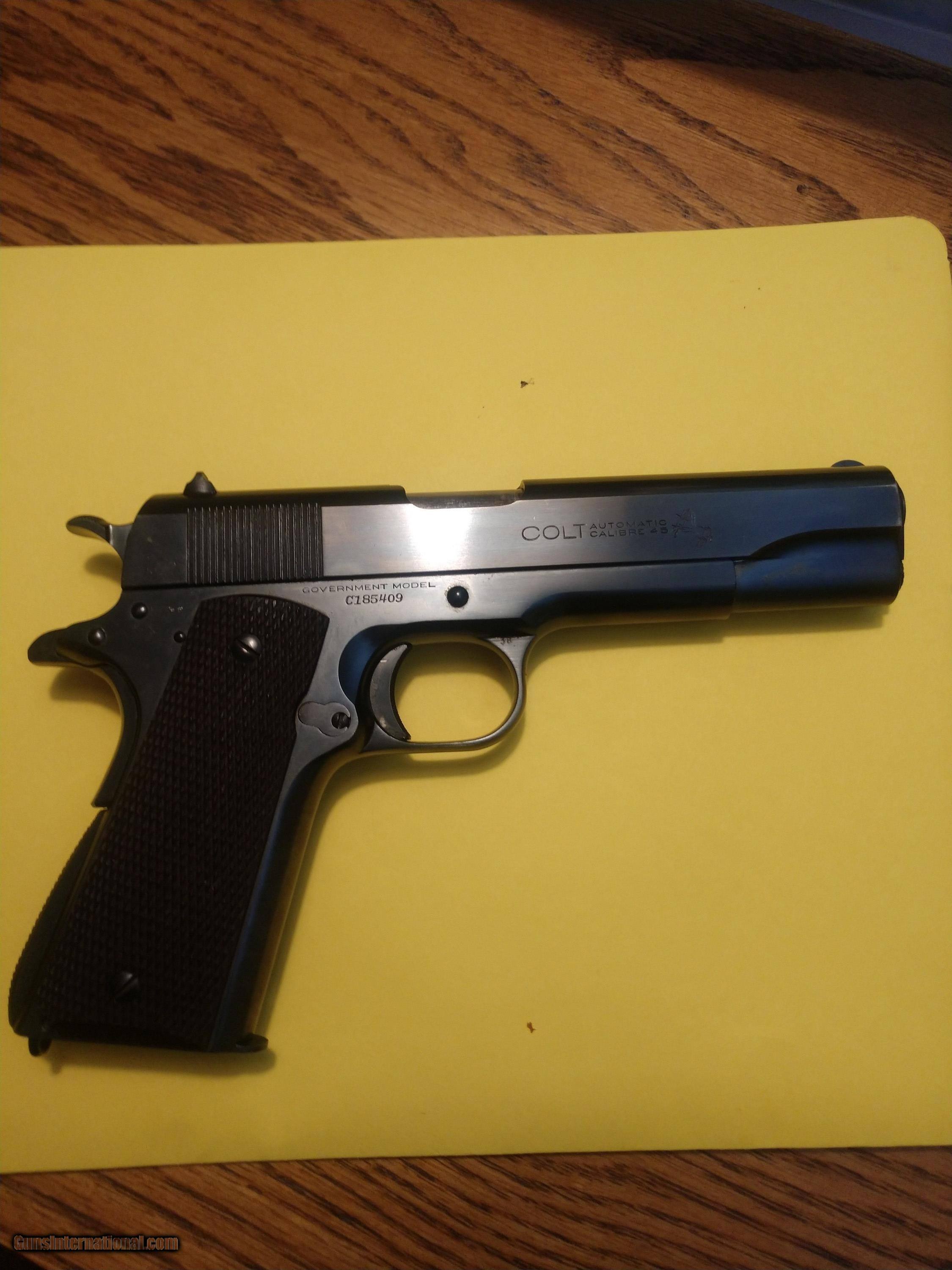 Description: Very nice pre war Colt 1911 in 45 ACP manufactured in the 20's. serial number C185409 Condition excellent with the slightest wear on the front of the slide near the muzzle. Grips and bluing 98%. Open to offers. SOLD Handgun Caliber: .45 ACP (.45 Auto) |