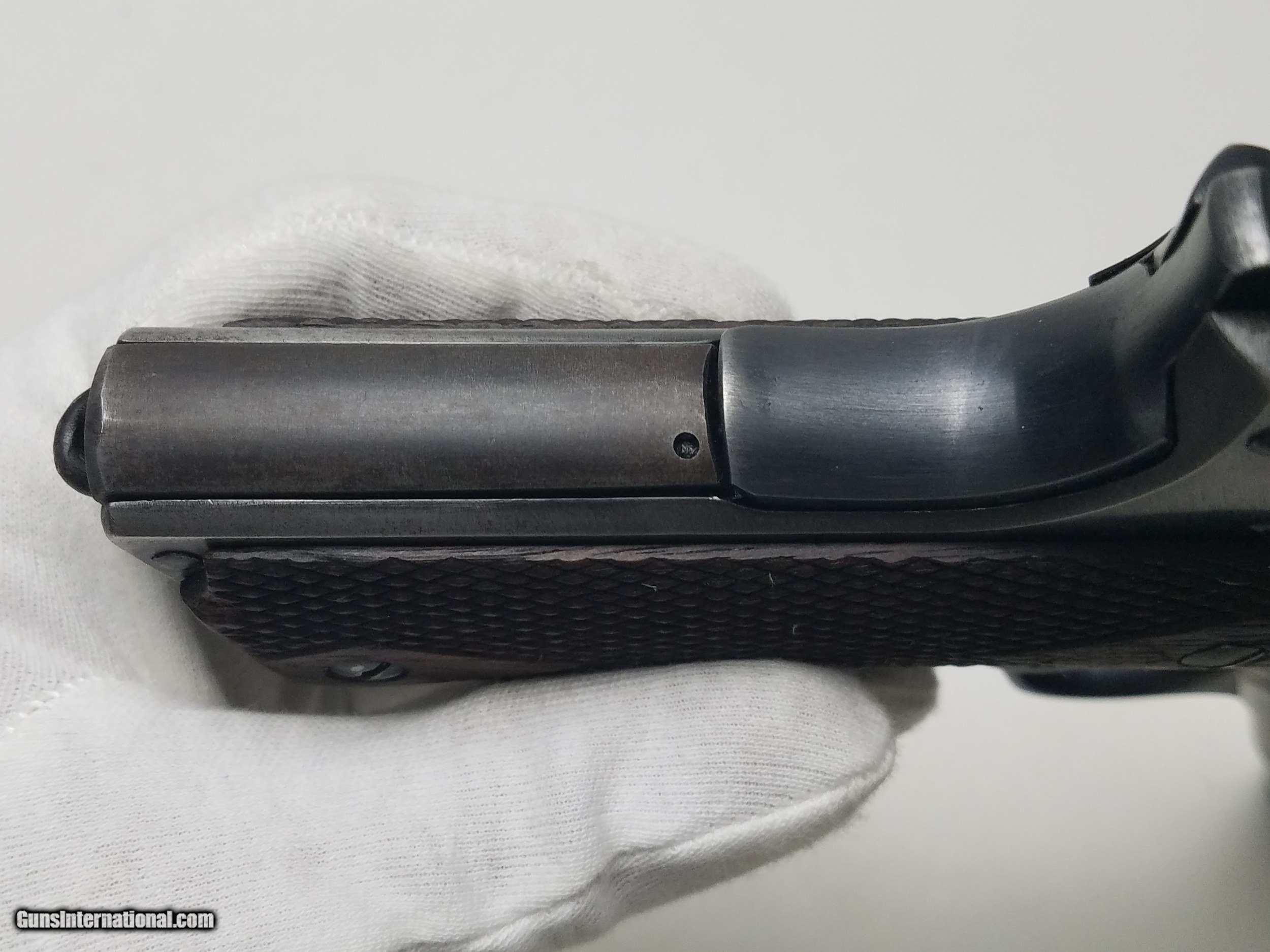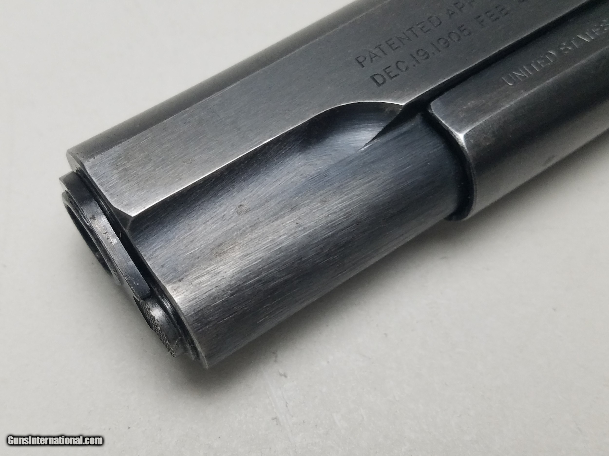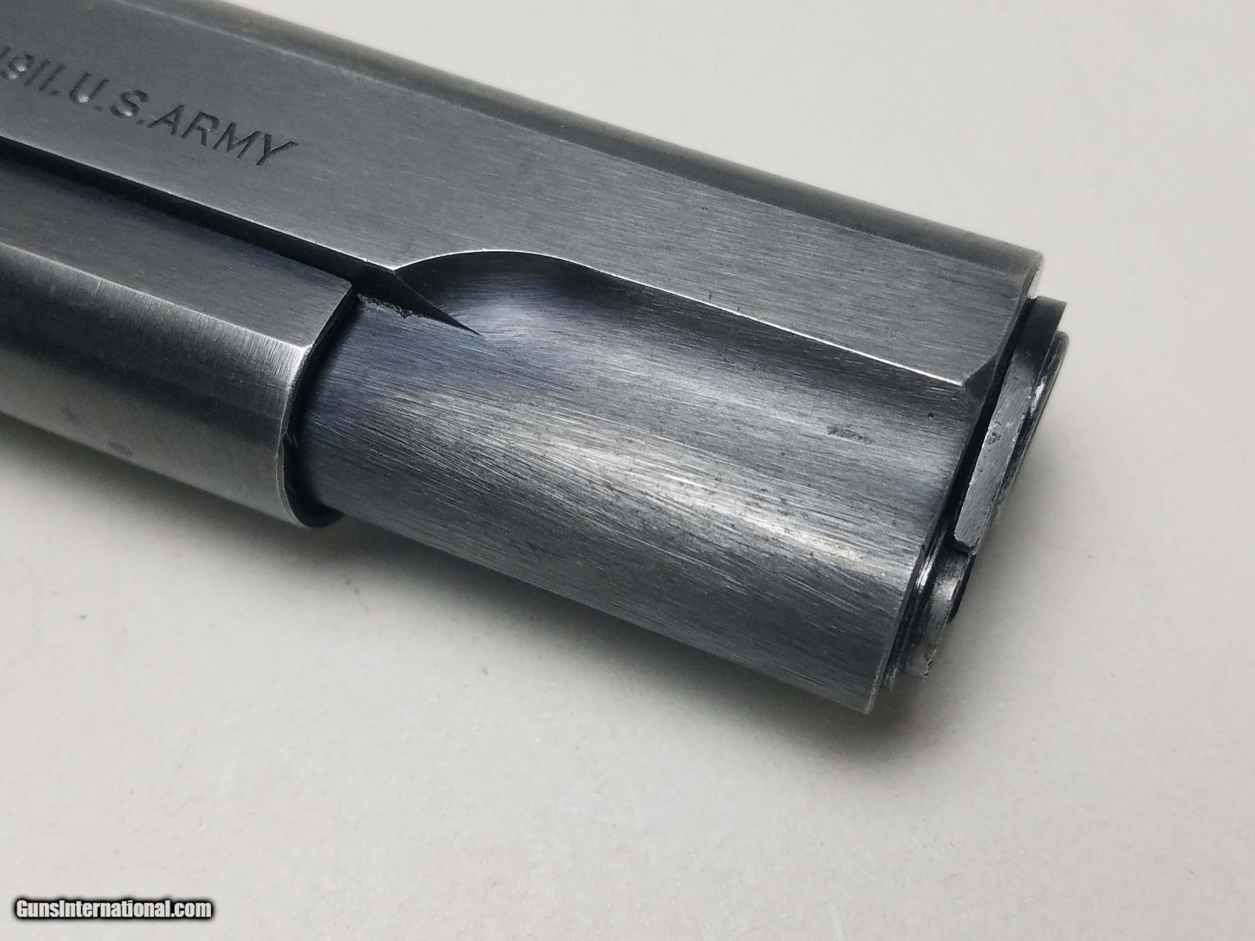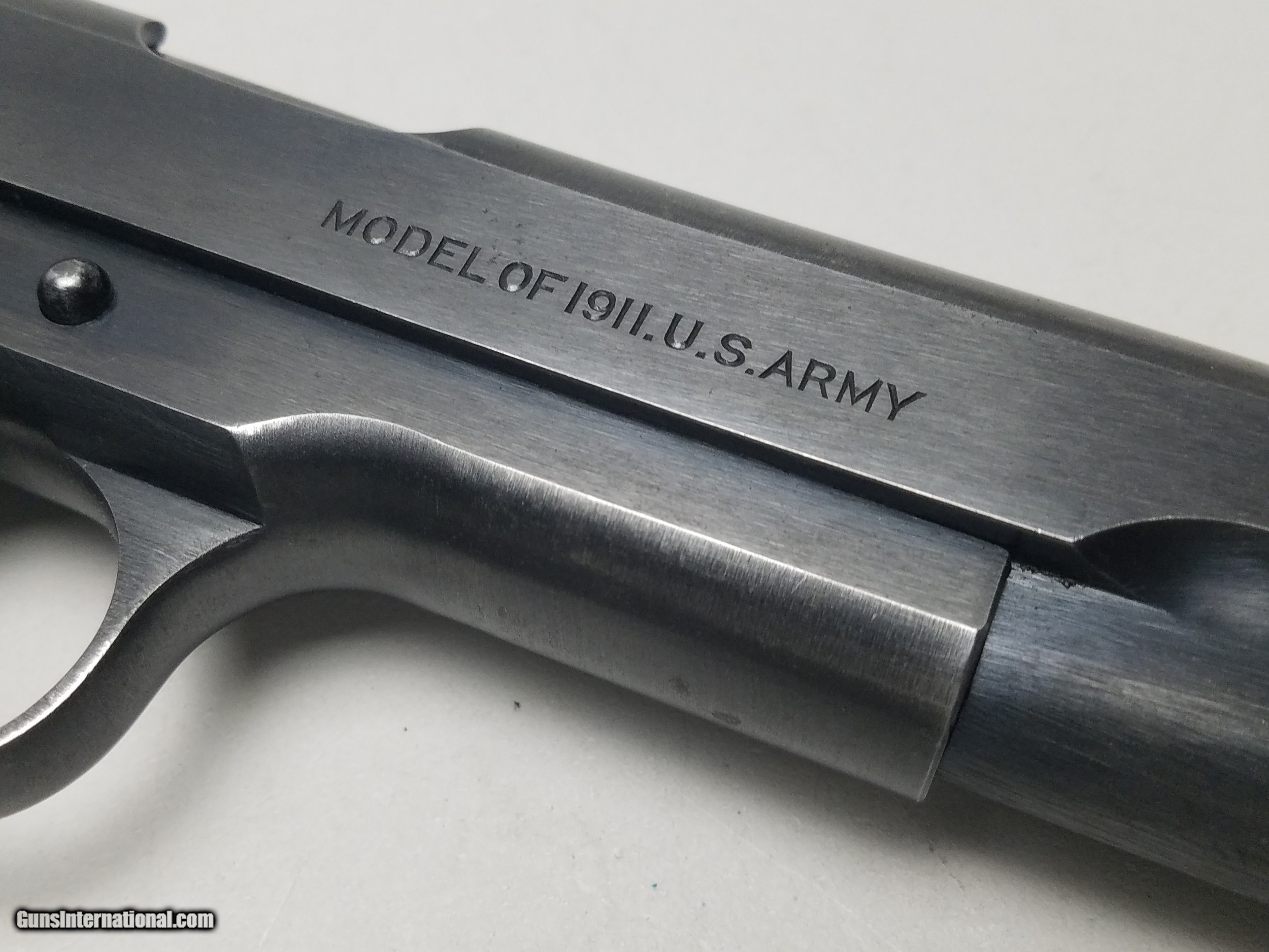 Description: Here is an exactly correct and completely original Colt military government model of 1911 U S Army 45 caliber pistol.. with correct and original 5" barrel in good condition with h and p markings in view. The magazine is in good condition and correctly blued, sights and grips are correct and both in excellent condition as well. The course grain metal finish on this particular blued gun is exactly how your military model of 1911 should appear in this near first generation of manufacture. This is Not a black army finish (late 1918), this is a blued gun (early 1918). Again, not cut quite square, the course diagonal metal grain cut on slide flats and side of frame match in appearance perfectly, and proves originality as only colt in the early years could produce such a distinct finish, and their first priority in quality control was to match slide and frame appearance. Grain is squiggly on top of slide. The frame has 4 transition points.. from grain near parallel with slide to grain vertical along grip frame angle. This is important to verify original finish.. in fantastic condition with great roll mark depth and definition. No significant assembly mark; finish wear on front grip strap IS significant, but it does not look bad.. and only lite wear on rear strap, no big significant scratches or gouges in metal, and only couple of areas with hint of petina. Hopefully the pictures can finalize your confidence.. this is NOT a makeover !!! A colt letter is not included with this firearm. Fairly early serial number! Preferred payment is gold, silver, and/or crypto.. USPS express priority ship is 45.00 to anywhere in the USA, well insured. FFL is required for transfer, C & R is OK. Please let me know if you have any questions or concerns. SOLD Handgun Caliber: .45 ACP (.45 Auto) Manufacturer: Colt Model: 1911 Serial Number: 268215 Bore: Great Condition: 96% Metal Condition: Great Wood Condition: Great Bore Condition: Mint Barrel Type: H P Manufacture Date: 1918 early |