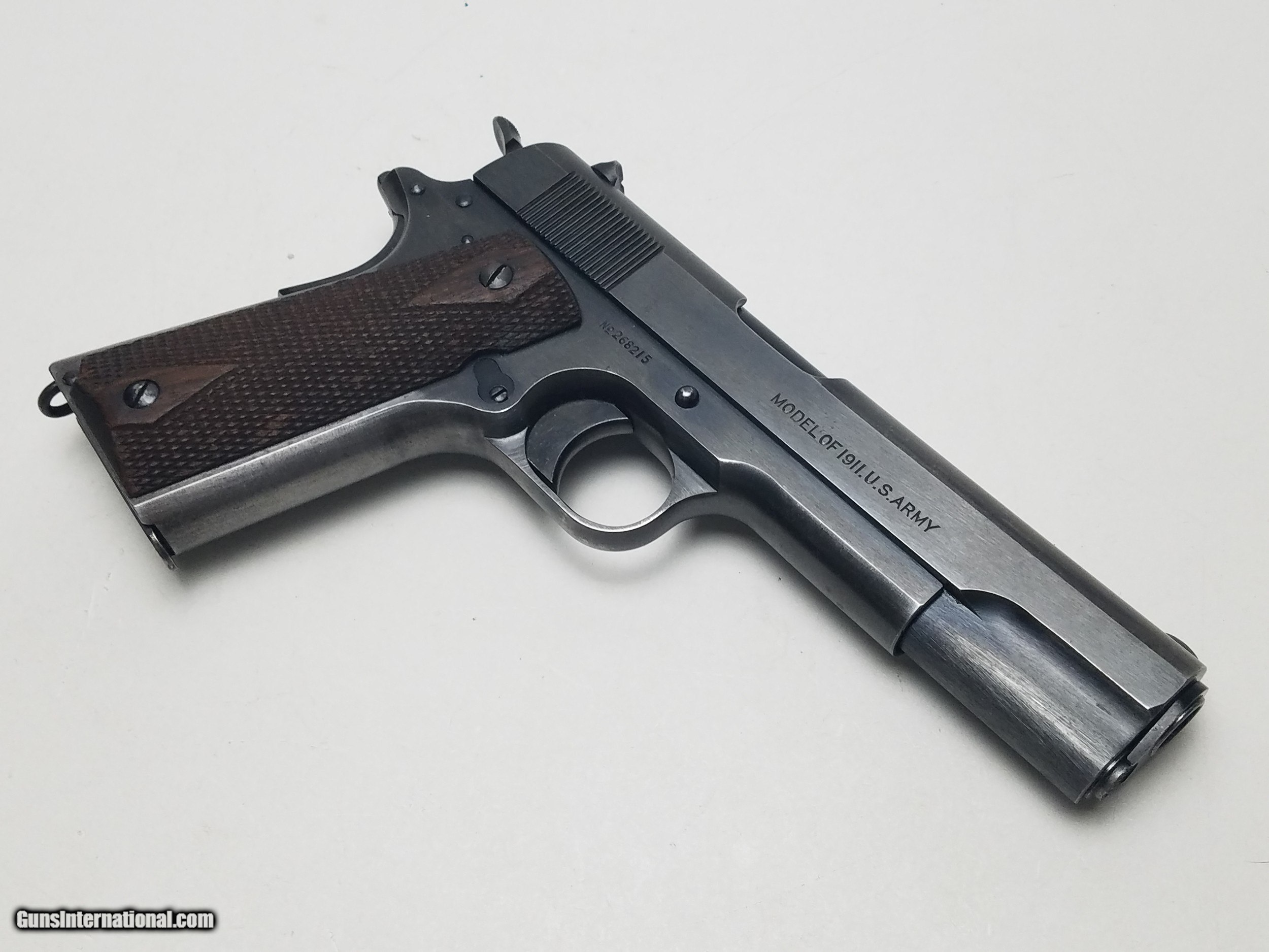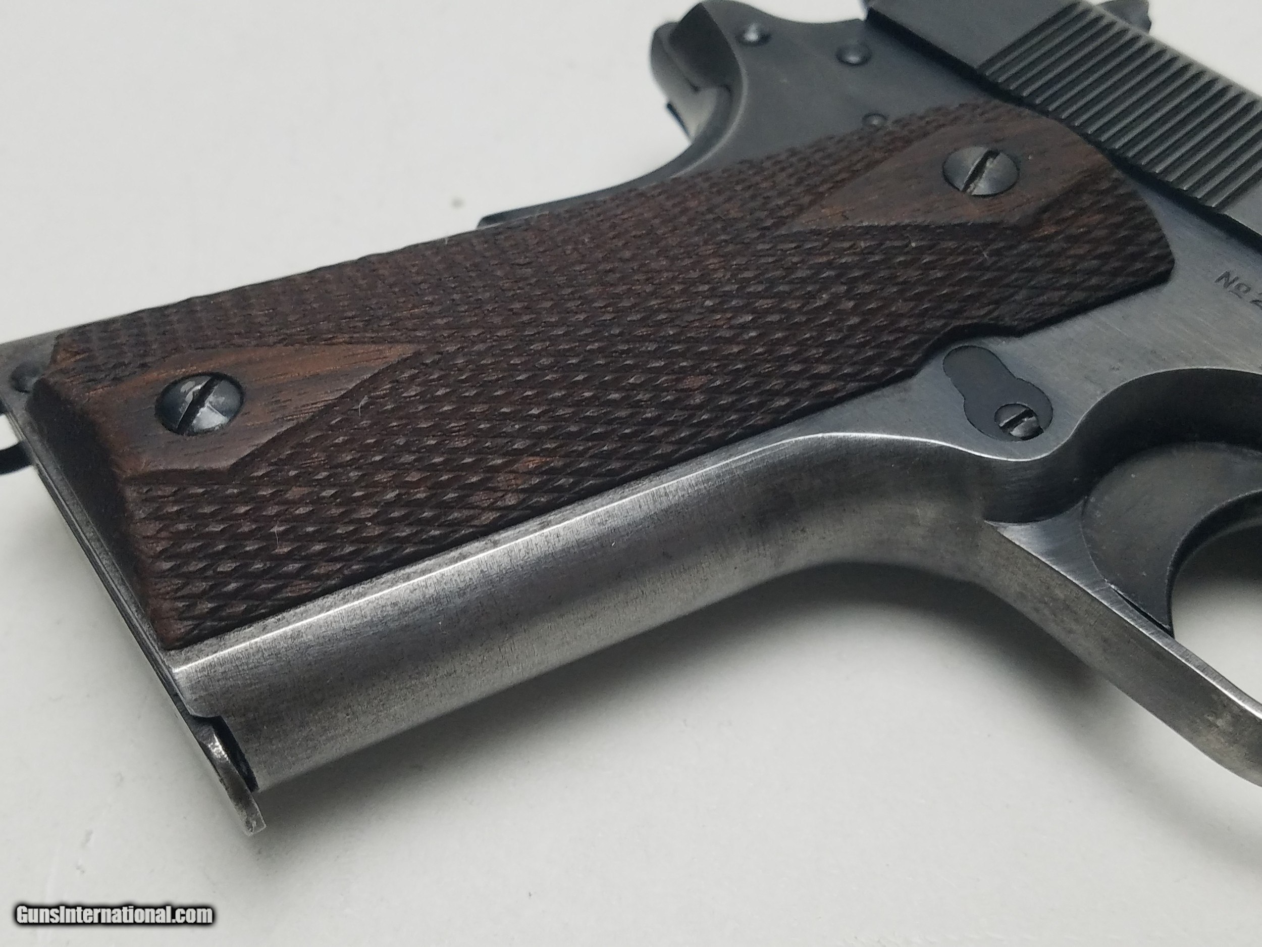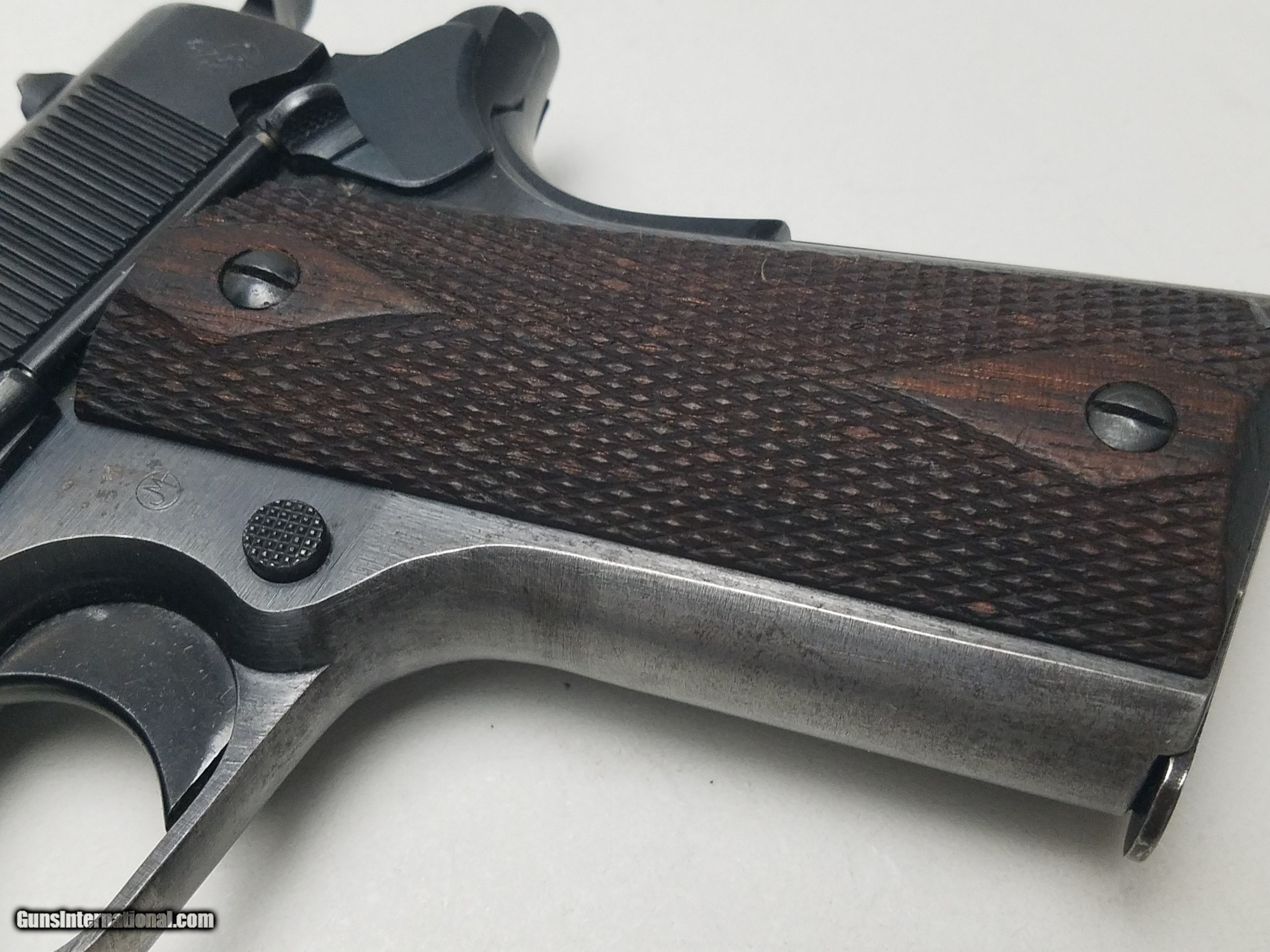 Description: Here is an exactly correct and completely original Colt military government model of 1911 U S Army 45 caliber pistol.. with correct and original 5" barrel in good condition with h and p markings in view. The magazine is in good condition and correctly blued, sights and grips are correct and both in excellent condition as well. The course grain metal finish on this particular blued gun is exactly how your military model of 1911 should appear in this near first generation of manufacture. This is Not a black army finish (late 1918), this is a blued gun (early 1918). Again, not cut quite square, the course diagonal metal grain cut on slide flats and side of frame match in appearance perfectly, and proves originality as only colt in the early years could produce such a distinct finish, and their first priority in quality control was to match slide and frame appearance. Grain is squiggly on top of slide. The frame has 4 transition points.. from grain near parallel with slide to grain vertical along grip frame angle. This is important to verify original finish.. in fantastic condition with great roll mark depth and definition. No significant assembly mark; finish wear on front grip strap IS significant, but it does not look bad.. and only lite wear on rear strap, no big significant scratches or gouges in metal, and only couple of areas with hint of petina. Hopefully the pictures can finalize your confidence.. this is NOT a makeover !!! A colt letter is not included with this firearm. Fairly early serial number! Preferred payment is gold, silver, and/or crypto.. USPS express priority ship is 45.00 to anywhere in the USA, well insured. FFL is required for transfer, C & R is OK. Please let me know if you have any questions or concerns. SOLD Handgun Caliber: .45 ACP (.45 Auto) Manufacturer: Colt Model: 1911 Serial Number: 268215 Bore: Great Condition: 96% Metal Condition: Great Wood Condition: Great Bore Condition: Mint Barrel Type: H P Manufacture Date: 1918 early |