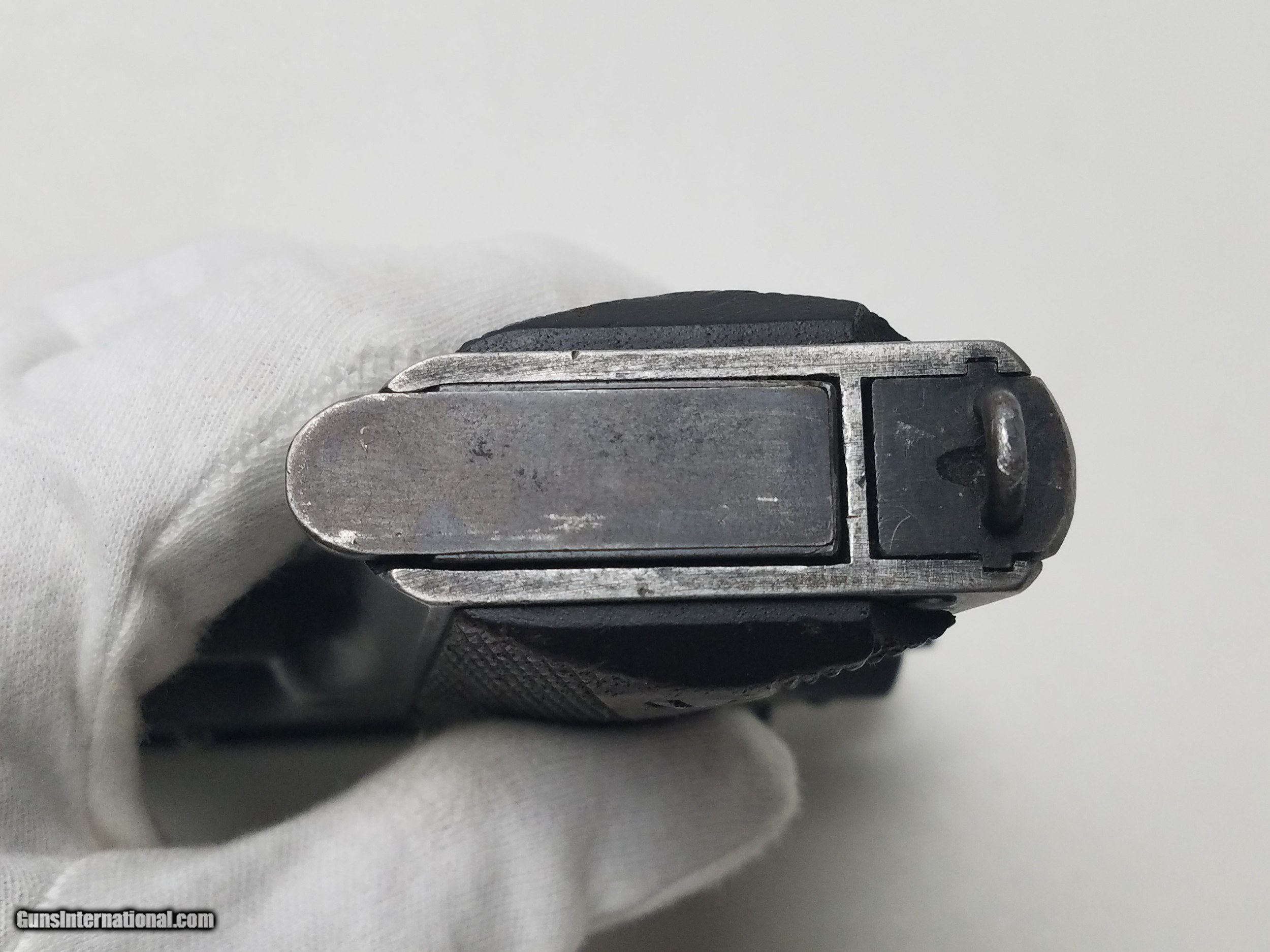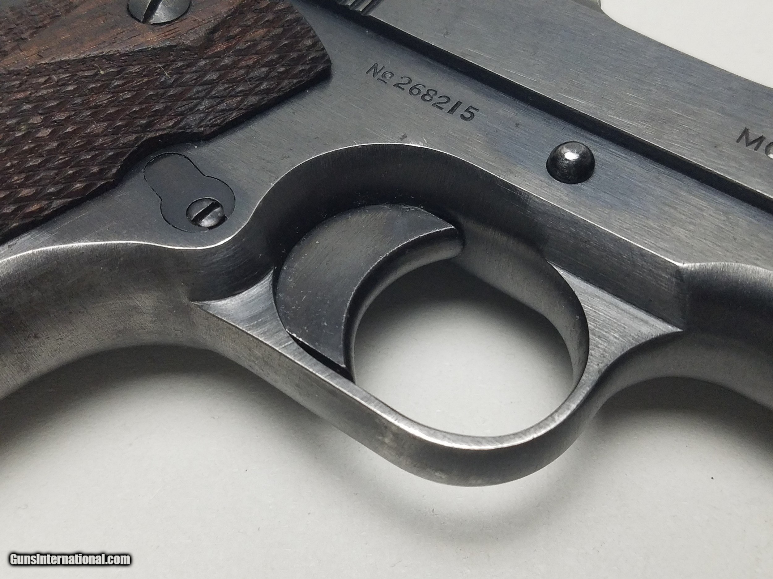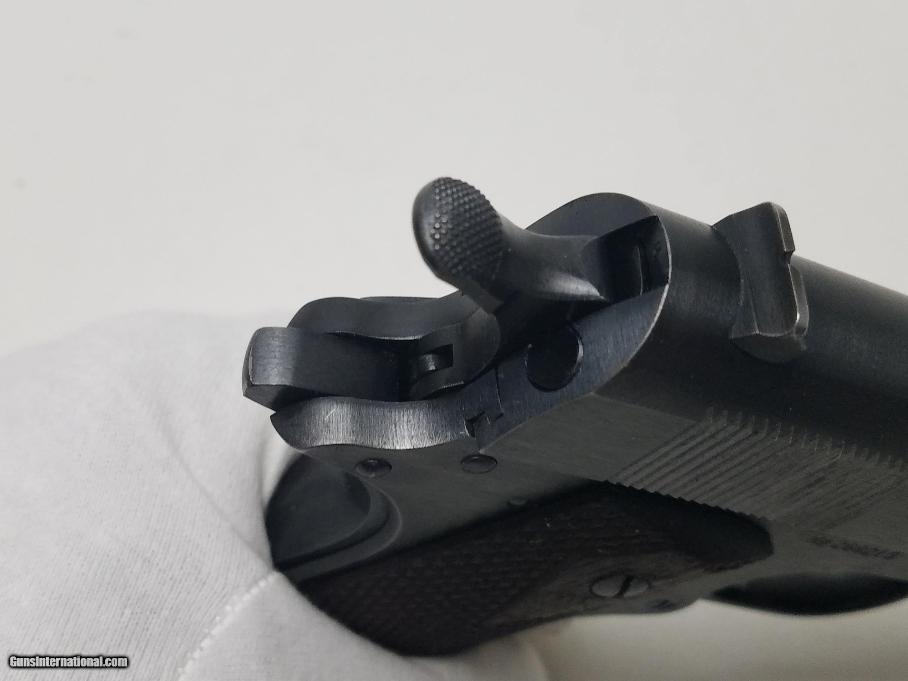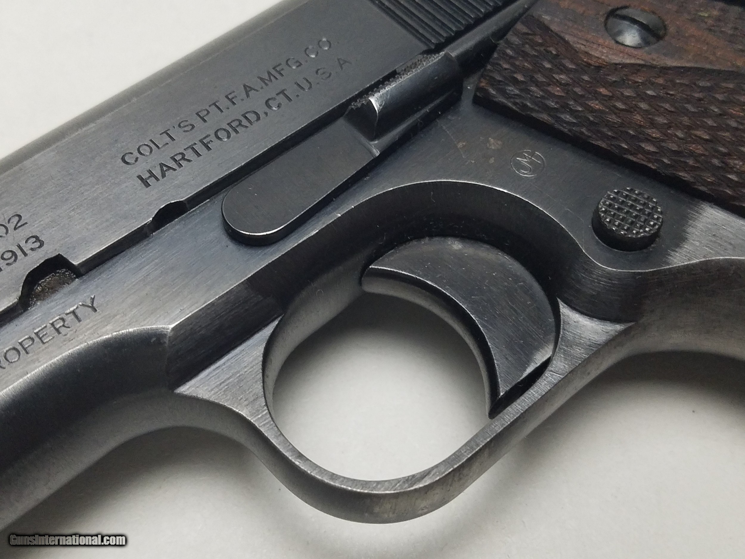 Description: Here is an exactly correct and completely original Colt military government model of 1911 U S Army 45 caliber pistol.. with correct and original 5" barrel in good condition with h and p markings in view. The magazine is in good condition and correctly blued, sights and grips are correct and both in excellent condition as well. The course grain metal finish on this particular blued gun is exactly how your military model of 1911 should appear in this near first generation of manufacture. This is Not a black army finish (late 1918), this is a blued gun (early 1918). Again, not cut quite square, the course diagonal metal grain cut on slide flats and side of frame match in appearance perfectly, and proves originality as only colt in the early years could produce such a distinct finish, and their first priority in quality control was to match slide and frame appearance. Grain is squiggly on top of slide. The frame has 4 transition points.. from grain near parallel with slide to grain vertical along grip frame angle. This is important to verify original finish.. in fantastic condition with great roll mark depth and definition. No significant assembly mark; finish wear on front grip strap IS significant, but it does not look bad.. and only lite wear on rear strap, no big significant scratches or gouges in metal, and only couple of areas with hint of petina. Hopefully the pictures can finalize your confidence.. this is NOT a makeover !!! A colt letter is not included with this firearm. Fairly early serial number! Preferred payment is gold, silver, and/or crypto.. USPS express priority ship is 45.00 to anywhere in the USA, well insured. FFL is required for transfer, C & R is OK. Please let me know if you have any questions or concerns. SOLD Handgun Caliber: .45 ACP (.45 Auto) Manufacturer: Colt Model: 1911 Serial Number: 268215 Bore: Great Condition: 96% Metal Condition: Great Wood Condition: Great Bore Condition: Mint Barrel Type: H P Manufacture Date: 1918 early |