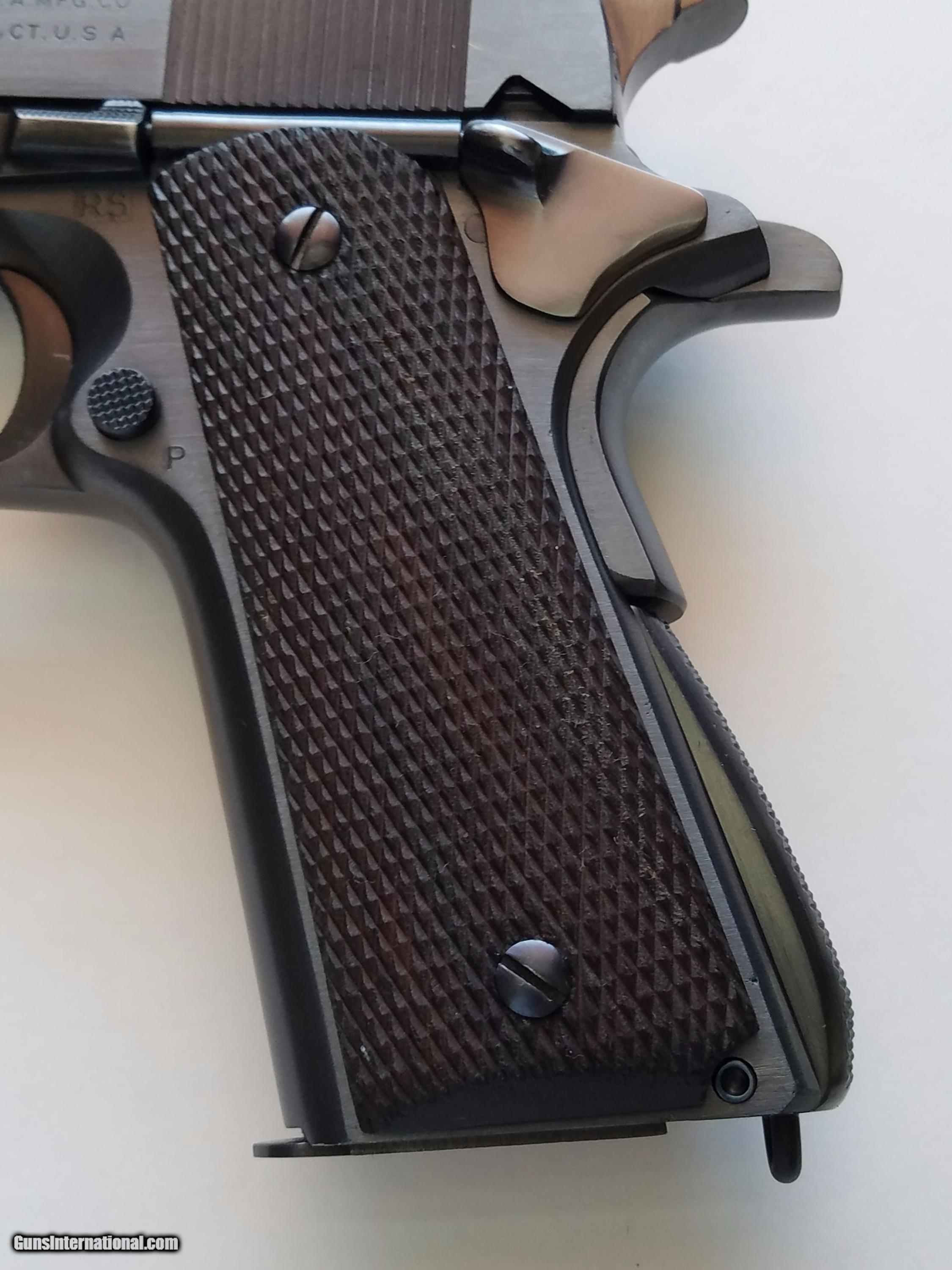Description: NOW.. no reserve!! format at gb 713473920 absolutely gorgeous Colt 1911 A1 military .45 auto. This was gun was manufactured and sold in about May of 1941 just prior to colt moving to parkerized finishes on the military guns. The gun has a beautiful brushed blue finish redone by turnbull in 1996. It remains in 99+% condition. Every other part of the gun is exactly correct and original.. the checkered wood grips are excellent originals as pictured. Payment is USPS money order only. Shipping is USPS priority USA only. Please let me know if you have any questions or concerns. SOLD Curio/Relic: Yes Manufacturer: Colt Model: Government 1911 Caliber Info: 45 acp Chambers: 6 Ejectors: 1 Condition: Mint Metal Condition: Mint Wood Condition: V Good Bore Condition: V Good |