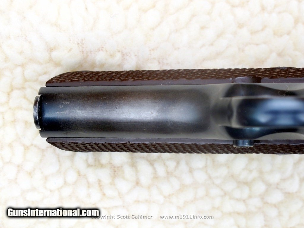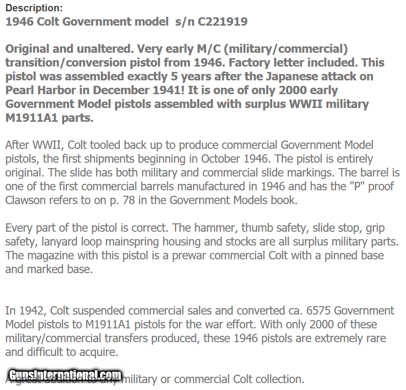 Description: 1946 Colt Government Model s/n C221919 Extremely rare early post-WWII 1st year Government Model assembled with U.S. M1911A1 surpus parts. Following WWII, Colt transitioned back to producing commercial Govt. Model pistols. It took more than one year before the first pistols were assembled in October 1946. The first 2000 pistols were assembled using surplus military parts from the last military M1911A1 pistols Colt ever produced in 1945. This is one of those pistols. It has the Military/Commercial transfer slide with both military and commercial slide slide markings. The small parts are surplus military parts, as are the stocks. The barrel is a new production 1946 GM barrel with "P" proof, as described in Clawson's Government Models book. This pistol also has the cool factor of being assembled EXACTLY 5 years after the Japanese attack on Pearl Harbor. See factory letter which is included with the gun. The finish is Colt factory original Black Magic, first used on these pistols. The pistols shows a little use, but still presents very well on both sides. This is truly a scarce pistol and would be a great addition to any U.S. military collection or Colt collection. Please see all the images and contact me with any questions or to purchase the pistol. SOLD Curio/Relic: Yes Manufacturer: Colt Model: Government Model Mil/Comm Conversion Serial Number: C221919 Caliber Info: .45 acp Condition: Exc. Finish: Blue Manufacture Date: 1946 Item Location: 46176 |