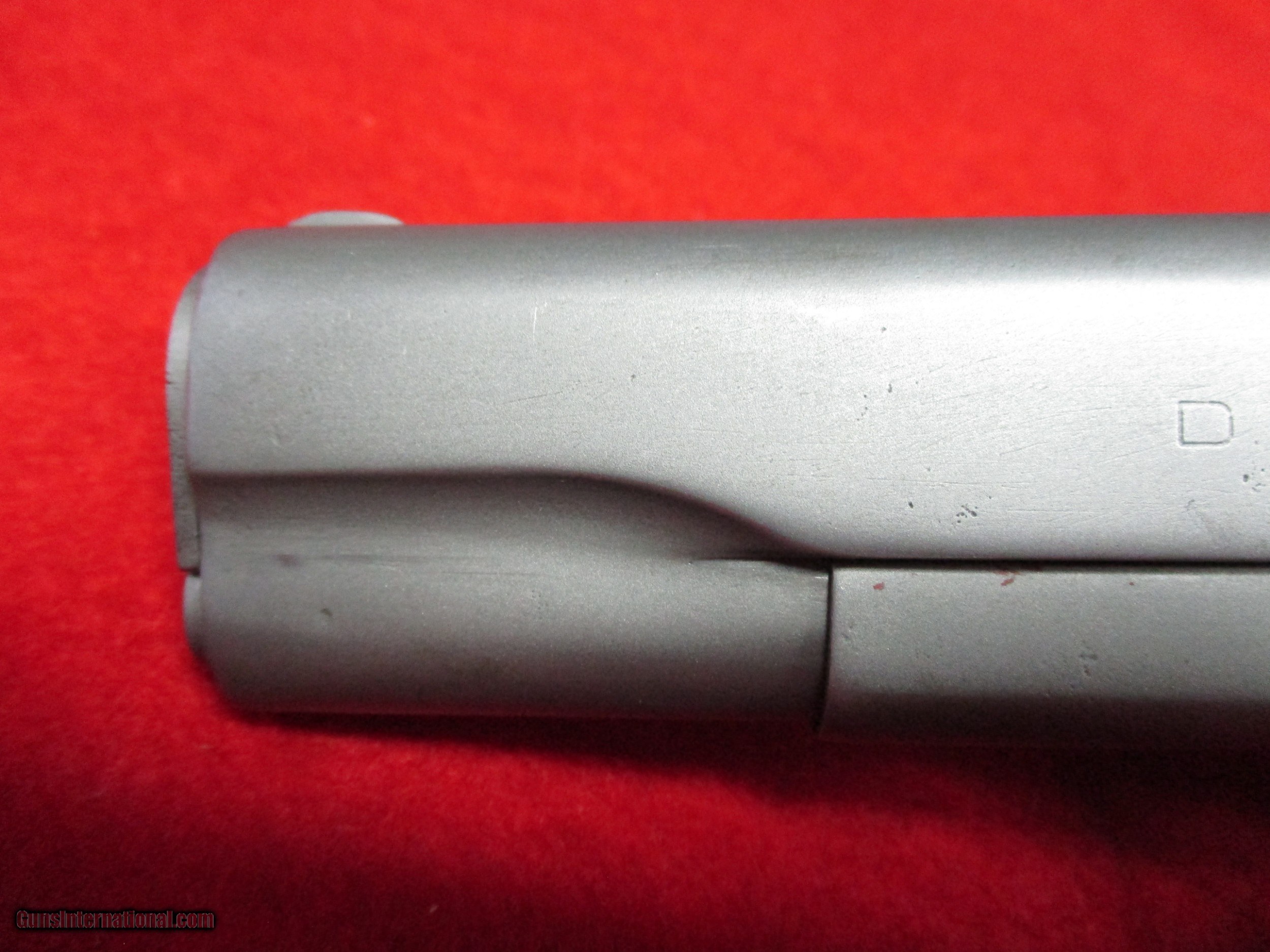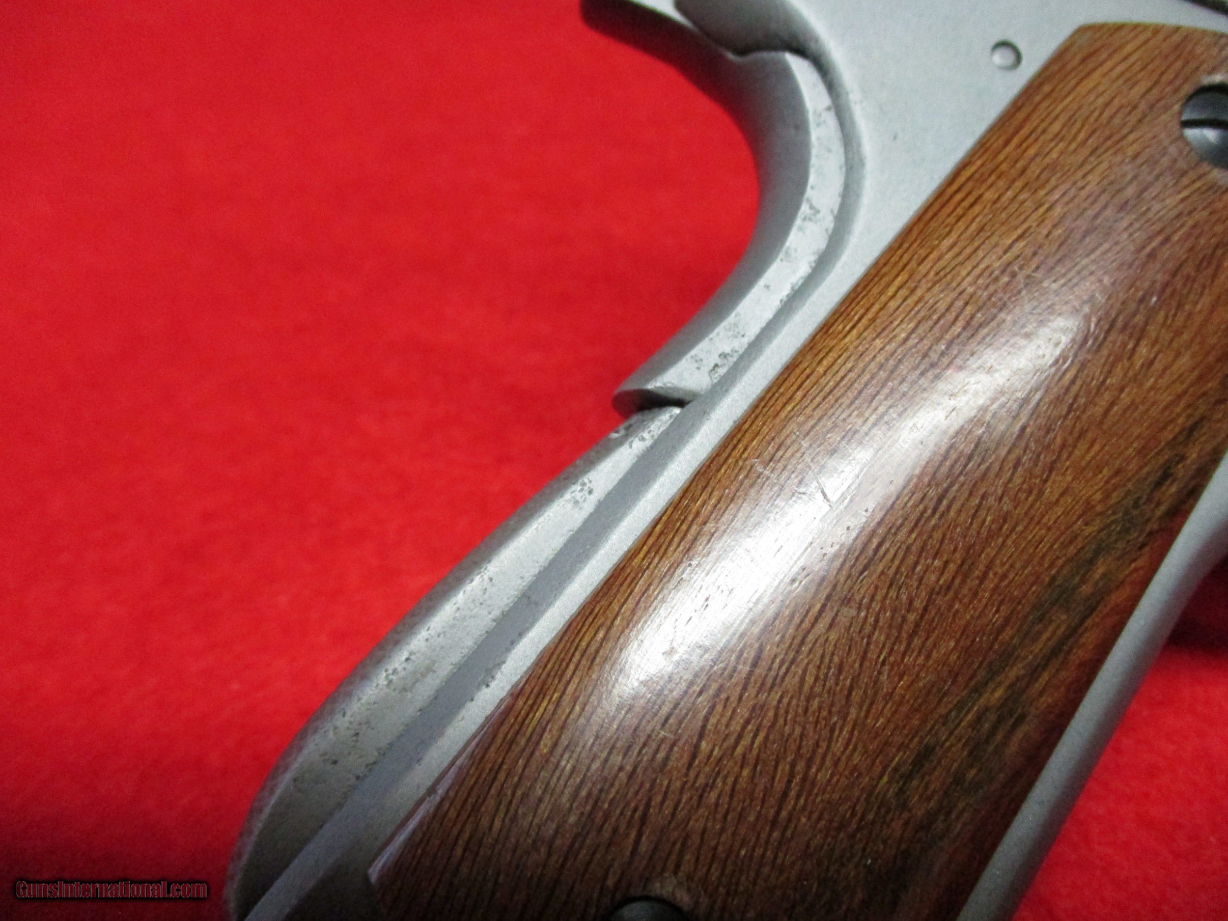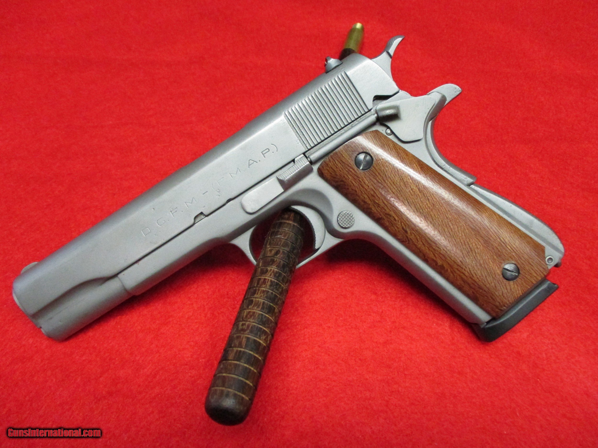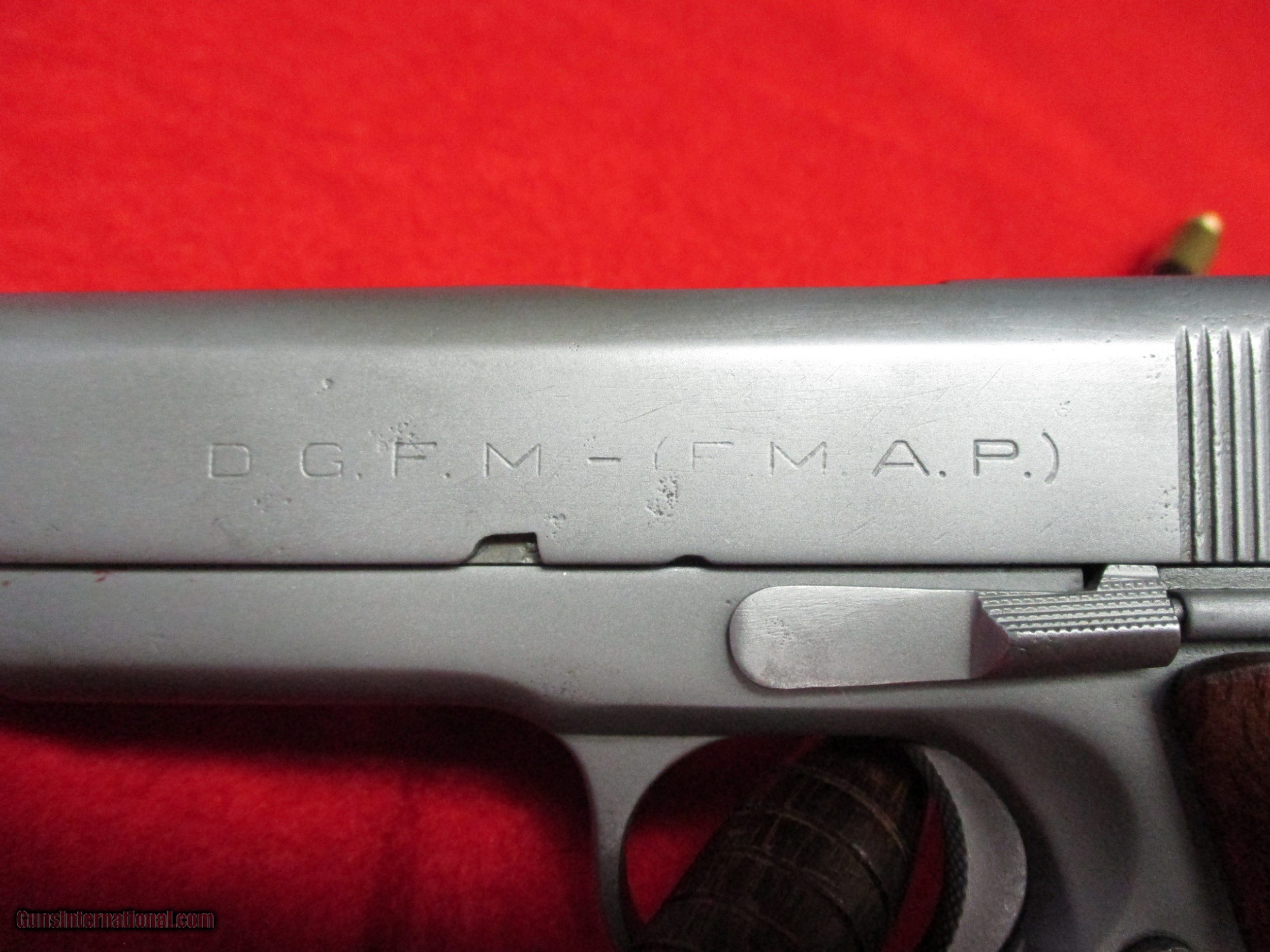 Description: The M1927 was built in Argentina using Colt machinery with assistance from Colt engineers. The pistols are well built and just as reliable as their G.I. counterparts. It is built to 1911A1 specs. The 1911A1 has seen military service all over the world and today enjoys popularity among civilians and law enforcement. The pistol shown has seen some use. It currently lacks a finish. I have disassembled the pistol and wiped down the barrel, barrel bushing, guide rod, slide, slide lock, and frame with some Barricade to protect it from rust. All wear is shown in the pictures. The bore has minor pitting but good rifling. All serial numbers match. The magazine is made by Mec-Gar, the same company that produces magazines for Beretta and others. Although worn, the pistol is still fully functional and would likely be a good shooter. It would make a nice truck or home defense gun. SOLD Manufacturer: D.G.F.M. – (F.M.A.P.) Model: M1927 Systema Serial Number: 99790 Caliber Info: .45 ACP aka .45 Auto Condition: Used - Rough Metal Condition: Worn Wood Condition: Excellent Bore Condition: Minor pitting, good rifling Barrels: 5 inches (127mm) Action: Single Action (SA) Stock: Wood Grips Finish: None Sights: Fixed |