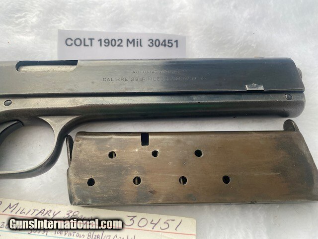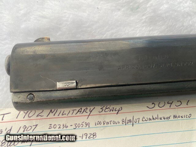 Description: Colt 1902 Military 38 One of only 18,000 1902 Militaries produced from 1902-1928 One of only 800 were produced for the Mexican military in Mexico's turbulent history in the first decade of the 1900s. "Few have survived and even less have been returned to the US. The few the author has been able to observe show evidence of a great deal of hard use" per Douglas Sheldon's fine book, COLTS 38 AUTOMATIC PISTOLS, pages 116-117. He notes only six others - so RARE Mexican crest and Mexican shipped 38 acp auto 6" barrel Mother of Pearl grips original correct w/o escutcheons - see pictures of condition Mfg'd 1907 Range of #30236 to 30539 100 went to Mexico on 8/28/1907 Letter included: Ministero de Guerra y Marina. A Combaluzier, Mexico City, Mexico Aug 28, 1907 in shipment of 100. Markings left: Patented Colts Patent Fire Arms Mfg Co Apr 20, 1897 Sept 9, 1902 Hartford CT USA Mexican Eagle crest on the top of the slide uncircled rampant Colt VP and 6 $3250 $25 shipping to your FFL or C&R if legal in your jurisdiction from my C&R. I follow all laws. See my other listed early Colt Autos Curio/Relic: Yes Handgun Caliber: .38 Auto (.38 ACP) Manufacturer: COLT Model: 1902 MILITARY Serial Number: 30451 Barrel Length: 6 Condition: good Metal Condition: good Grips: Mother of Pearl Price: $3,250.00 Shipping: $25.00 Contact Seller |