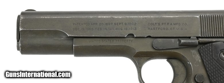 Description: Colt 1911 .45 ACP caliber pistol. WWI U.S Military pistol made in 1917. The finish is mostly a gray patina. Grips are good with no chips or cracks. Bore is very good. A faithful old warhorse, ready for action.