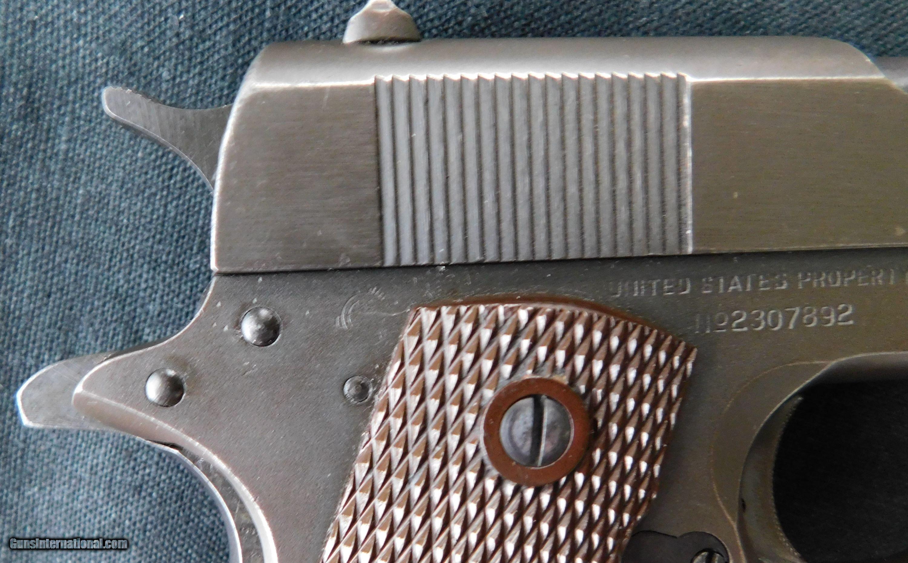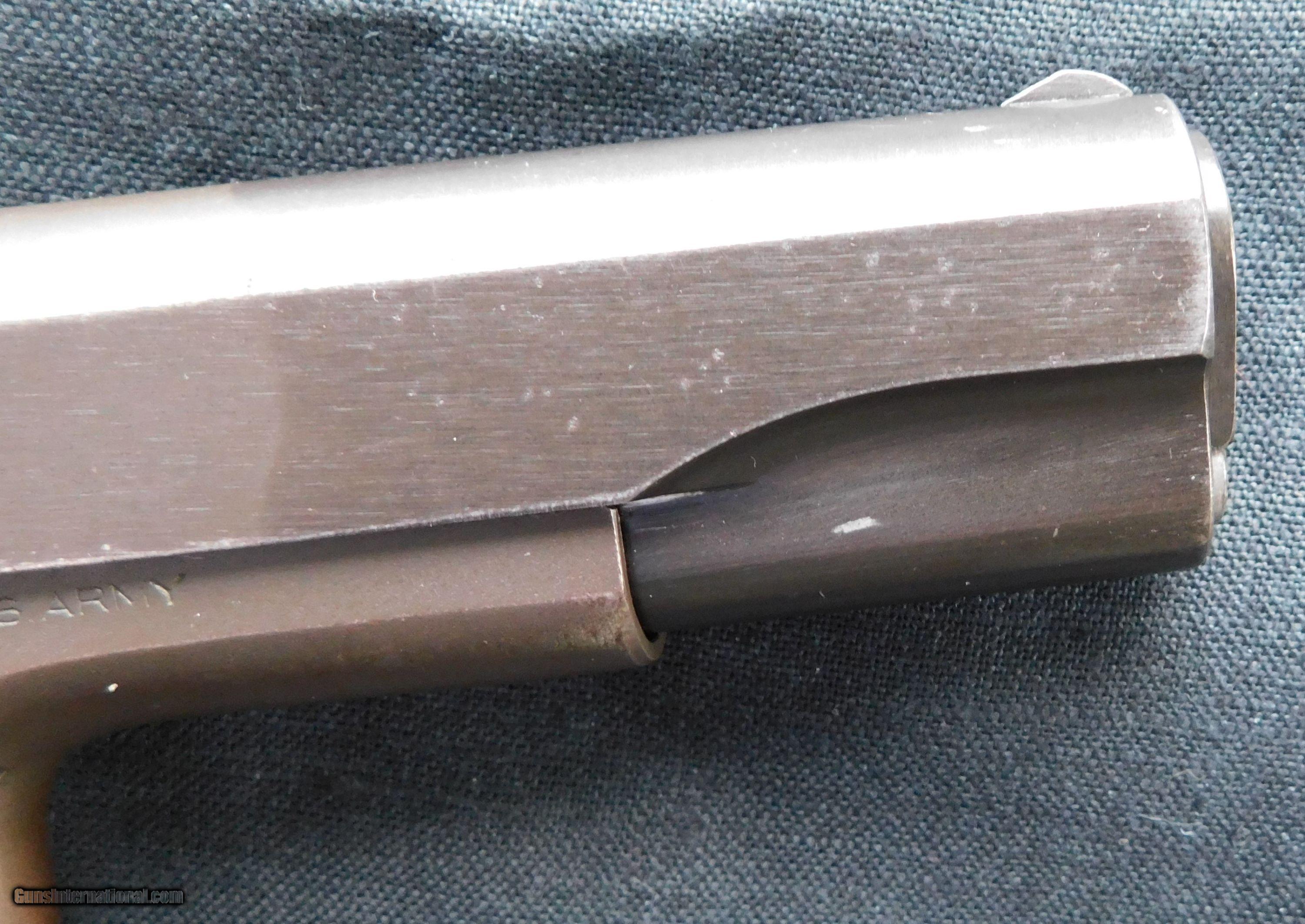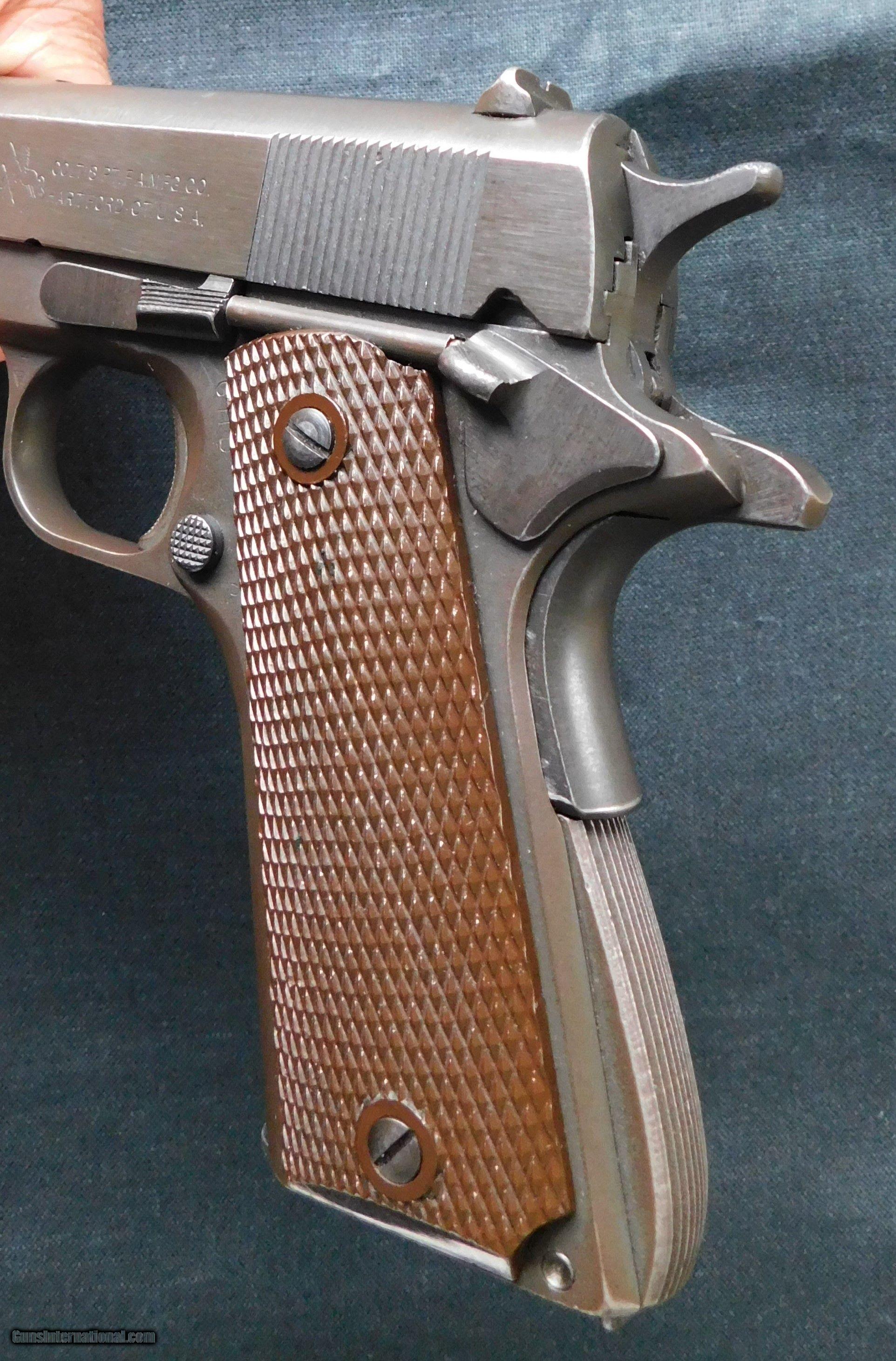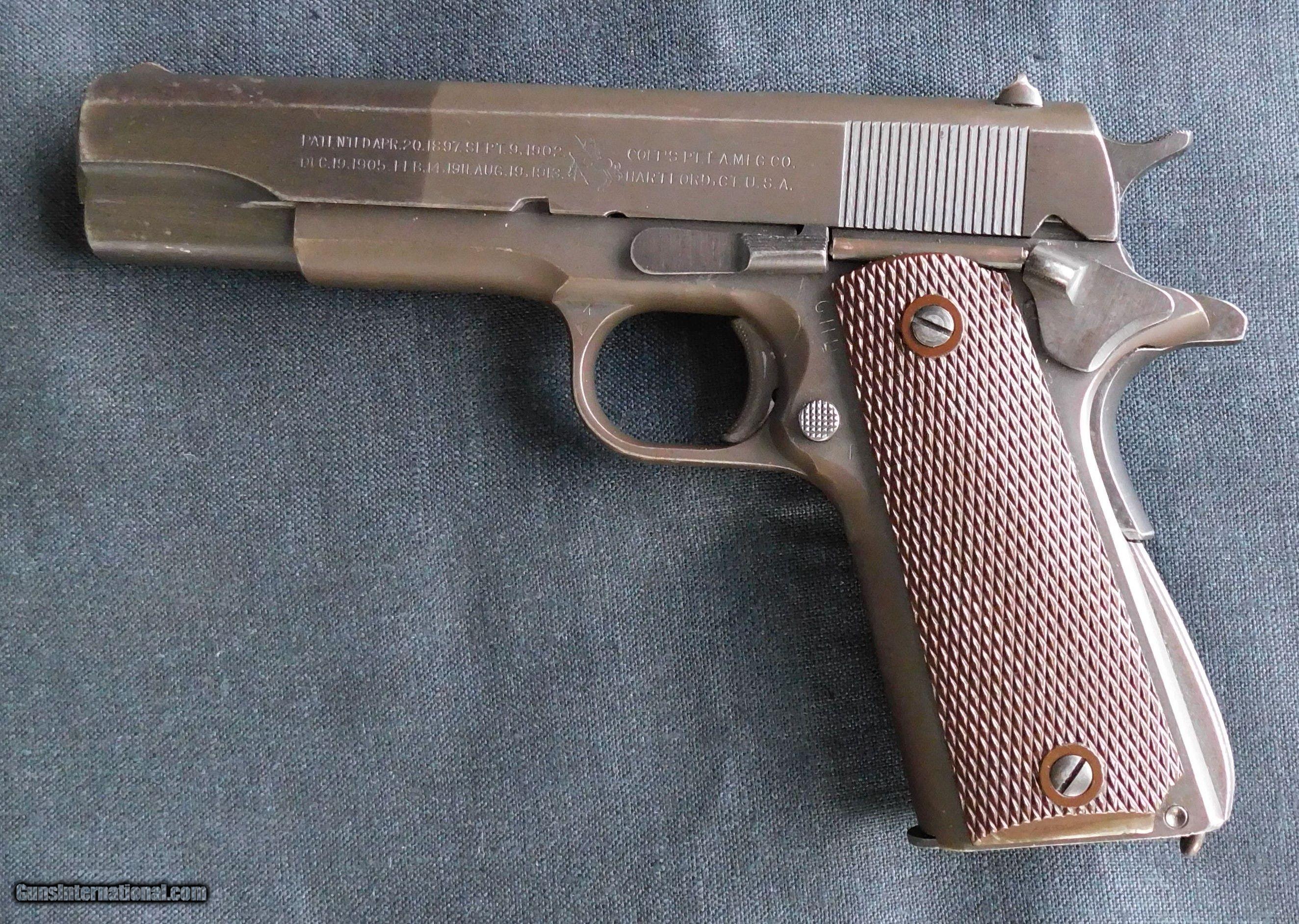 Description: Colt 1911 A1 .45 WW2. Serial # 2,307,892. The slide is brushed. The frame has the sand blasted appearance. Correct for this late war model. Both slide and frame have the Parco-Lubrite finish. The frame’s bullet ramp is not polished down to metal (like Parkerized frames) - it retains its Parco-Lubrite finish. The slide is not numbered which is correct for these late guns. Barrel lug has a 'C' in a square on right side and 'P' on the left side. At the muzzle end of the slide, in the darkened area only, there are spots of light pitting. I’ve tried to highlight those areas in the pictures. With the gun in hand, those areas are not very noticeable and don’t take away from the appearance. The front strap and bottom of the trigger guard show thinned blue. Some high-edge wear. Good bore. Magazine has no markings that I can see. A very nice & clean example of a late war Parco-Lubrite gun shipped on April 16, 1945 to Springfield (per Colt). All correct and original. Credit cards, money orders, certified check or personal check. Please add 2.5% when using a credit card to offset some of our bank’s fee. Personal checks are fine, shipment may be held for a few days. We ship only to an FFL or FFL-C&R holder. USPS insured Priority Mail - buyer pays $40 for lower 48. 3-day inspection period. If not satisfied – full refund (except for shipping and credit card fees) when returned in the same condition as received. We provide no warranties of fitness for use. Have a gunsmith inspection before firing. Please let us know if you have any questions. You can email or call Sam at 828-608-0011. We are required to collect sales tax of 6.75% from North Carolina buyers. Thanks for considering. SOLD Curio/Relic: Yes Manufacturer: Colt Serial Number: 2,307,892 Caliber Info: .45 Bore: Good |