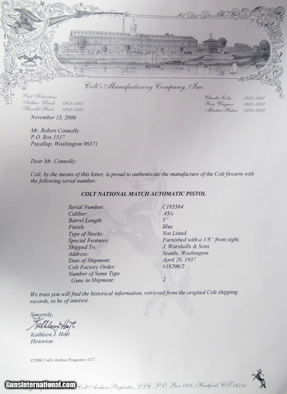 Description: Colt 1911 A1 Semi-Auto 45 ACP Pistol; Serial No. C185564; Factory Letter Indicates Shipped to Seattle, Washington in 1937 with a Special 1/8” Front Sight; Really High Condition (See Photos); Perfect Action & Bore; LIQUIDATING PERSONAL COLLECTION; Price: $7,500 Shipped; Price includes insured shipping; return policy: three days inspection from the date the items received; full refund of shipping both ways ONLY IF THE ITEM IS MISREPRESENTED. SOLD Manufacturer: Colt Model: 1911 Serial Number: C185564 |