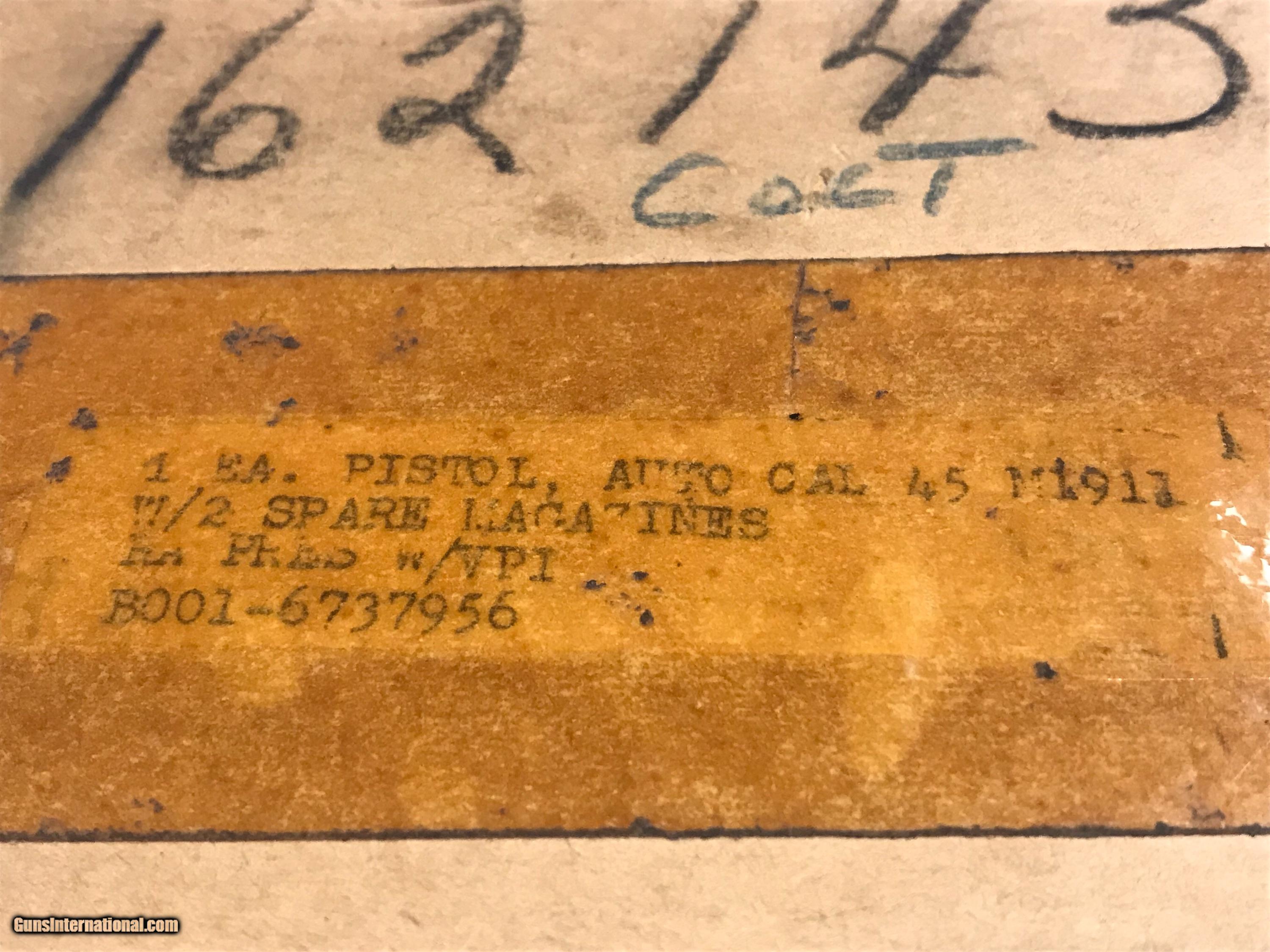 Description: This is a Colt 1911 .45 cal GI made in 1917 arsenal rework pistol For shippment for WW2 still in the Original box with 3 original Mags, and still in the Cosmeline thick plastic Bag ,still sealed never been open in 76 years . Please see all pictures Questions call Richard at 406-407-0698 SOLD Curio/Relic: Yes Manufacturer: Colt Model: 1911 A1 Serial Number: 162xxx Caliber Info: .45 |