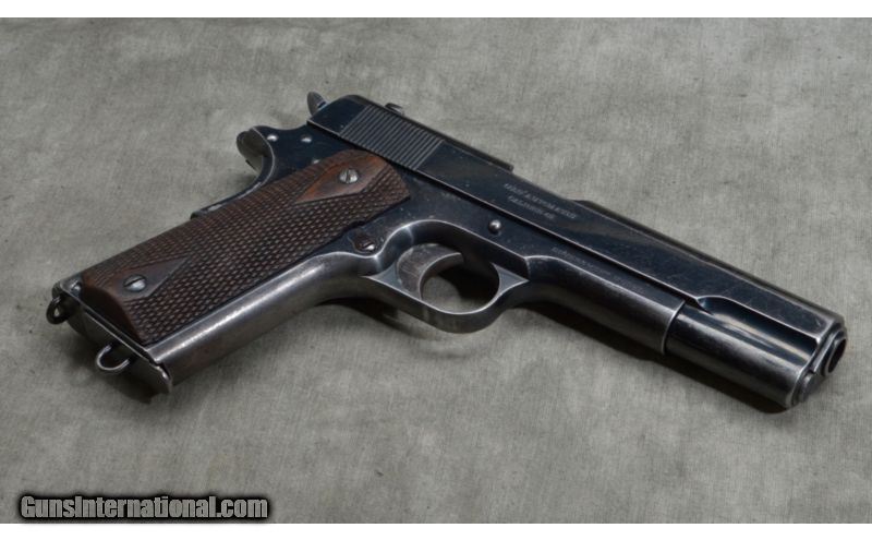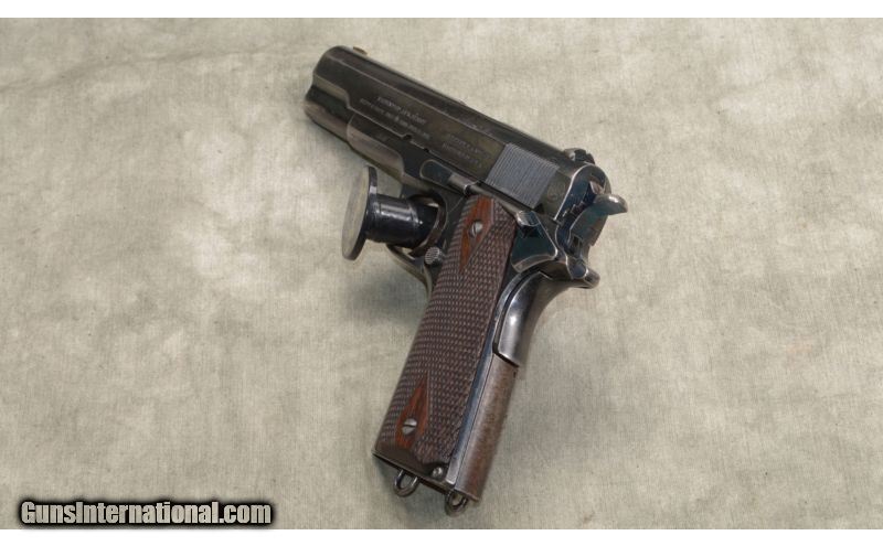 Description: This is one of the originals. It was manufactured in 1912 and is in great shape. The blue is very good overall with wear showing at the high points and holster touch points. It features high polish on the metals low profile sights for holster use. Front sight is brass. It includes a lanyard loop. SOLD Curio/Relic: Yes Manufacturer: 1912. Caliber Info: .45 ACP. Chambers: 8 round detachable "half-blue" magazine. Metal Condition: Very good. Nice blue coverage with wear showing at the high points and where a holster would contact. There a few shallow scratches and a few shallow pits. Wood Condition: Very good. Bore Condition: Shiny and bright with good rifling. Barrels: 5 Inch barrel. Triggers: Factory single action trigger. Stock: Checkered walnut. Weight: 39 oz. Sights: Low profile post and notch sights. Front sight is brass. Extras: One "half-blue" magazine. Item Location: Rogers,, MN |