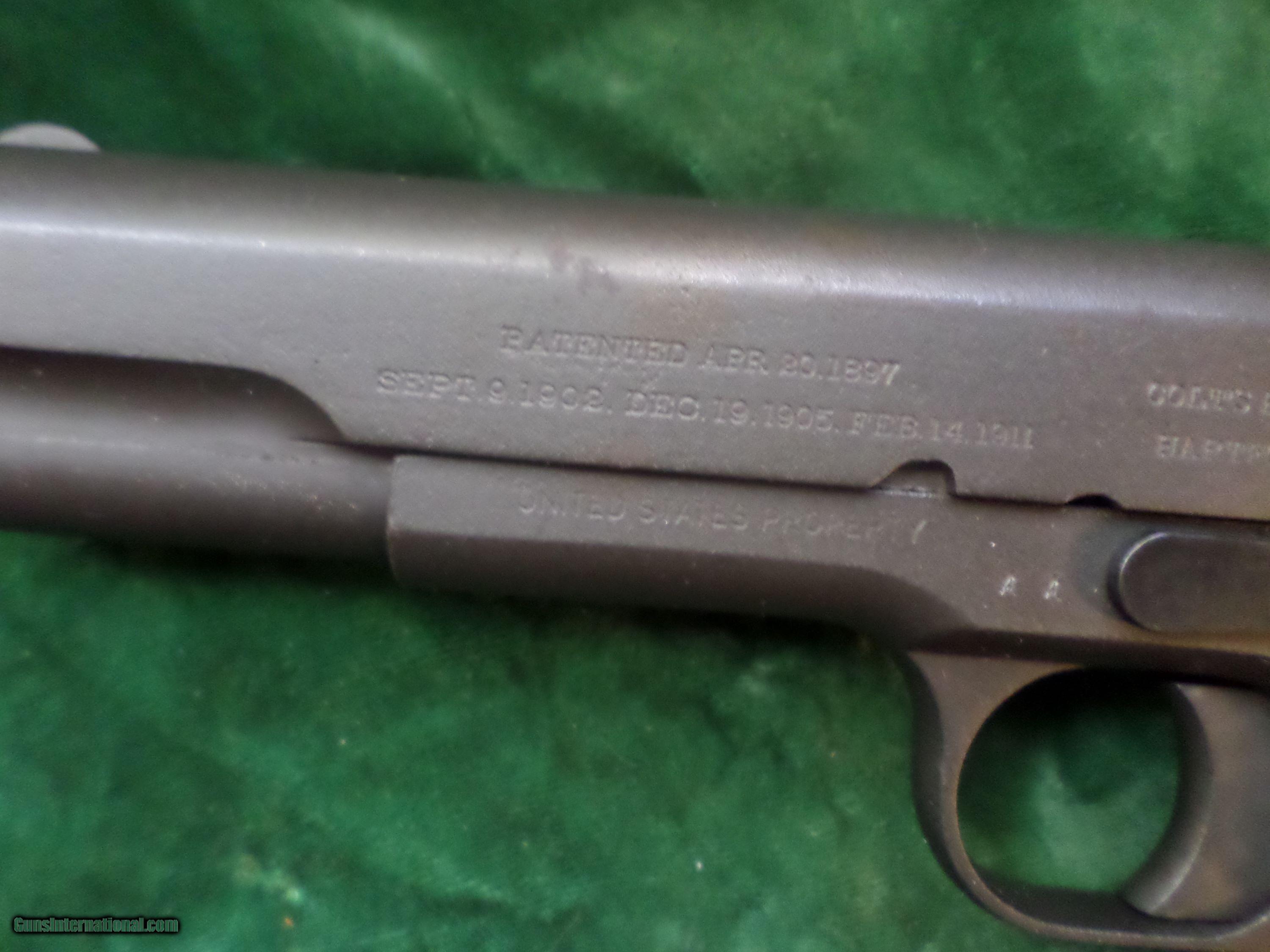 Description: Extra nice 1911 that served in both WW's. Serial #459027. 90%+ AA (Augusta Arsenal) dark parkerizing over heavy sand blasted frame, slide, barrel, Dark parkerized guns were intentionally done for various war time uses. ie Commando forces.The sand blasting process in a few incidences removed the serial number, the arsenal then assigned a new number prefixed with an "X"; those guns are a favorite of collectors. 3 areas of light oxidation, see photos. Bare metal on leading edge of slide. Fine plastic grips are original arsenal parts (Keys plastic "K" in star marks on each panel). Parkerized barrel is marked with "P" and "HS" on lug. Bore is like a mirror, no pitting. The action is perfect and tight. RIA mark indicates addional reburbishing before these were offered to the public in the 50's and 60's., probably repalcing the hammer and slide stop.The hammer is a bright blue Remington Rand bammer, like those used by RIA in the General Officers Pistols (M15). Springfield armory inspector mark on left side of fame as is the "United States Property" mark. Ask questions (?). C&R/FFL. Buyer pays all shipping. $35 priority mail in the US. This is a historical and very collectable 1911 from an Estate liquidation. SOLD Curio/Relic: Yes |