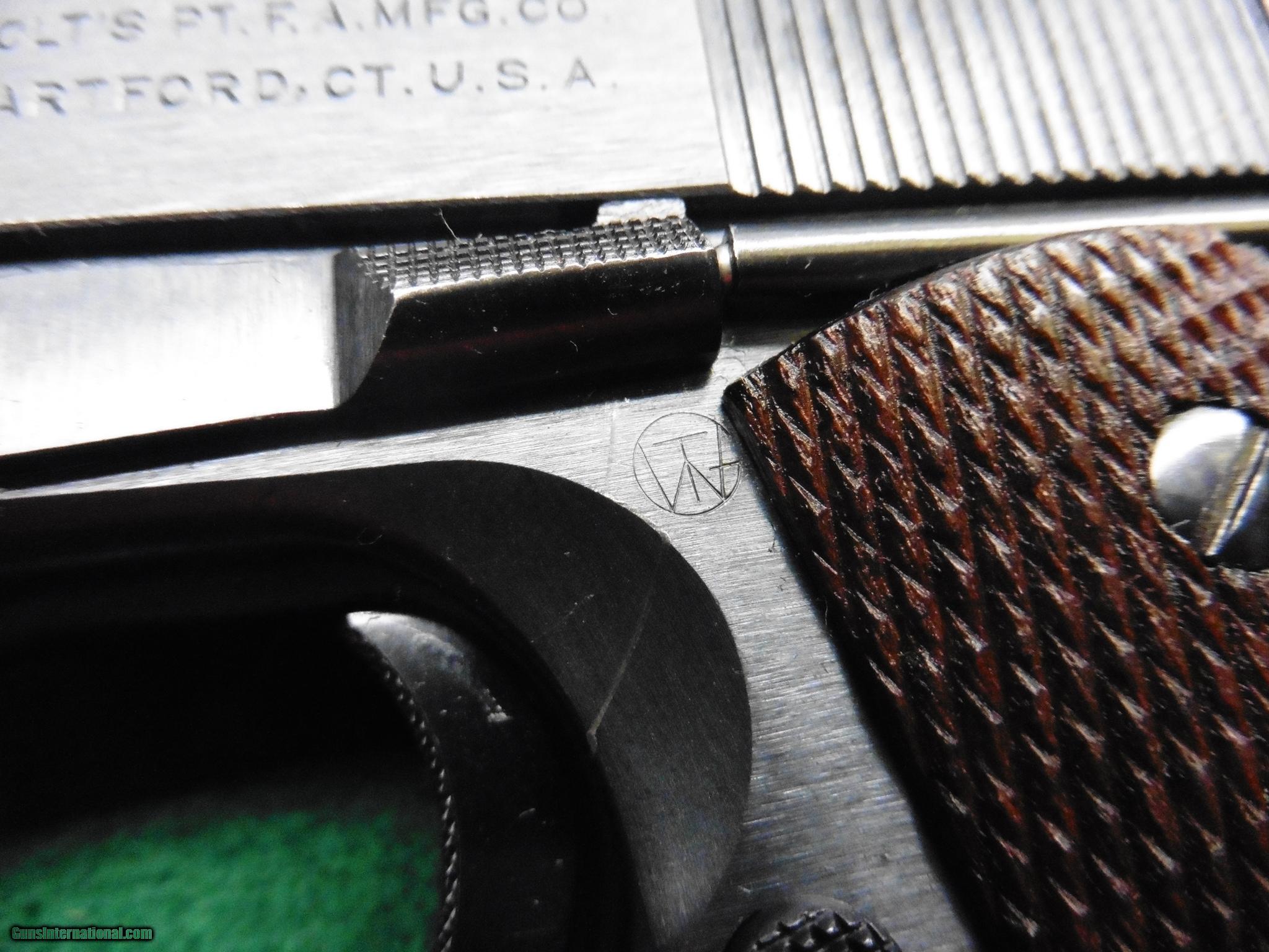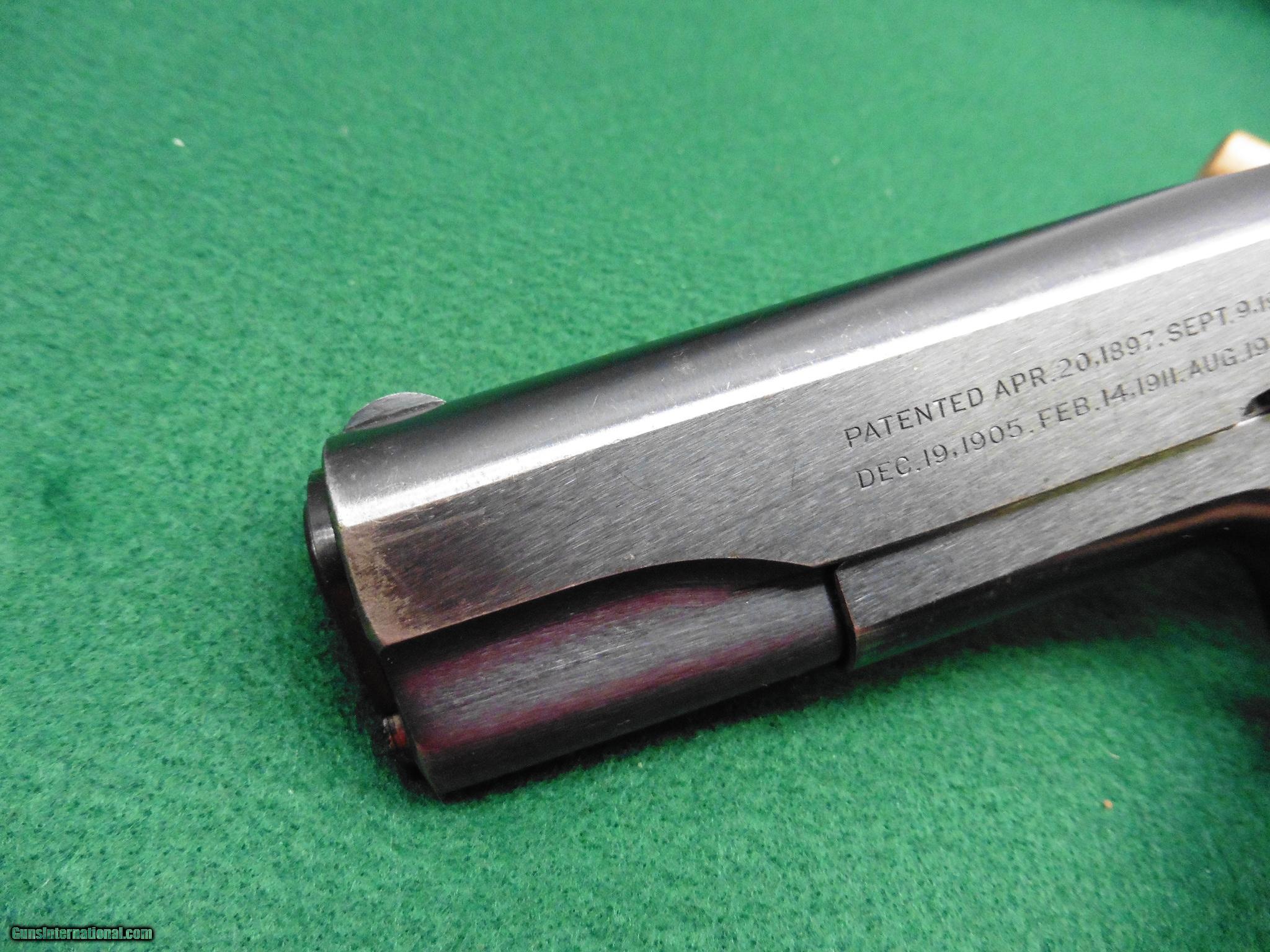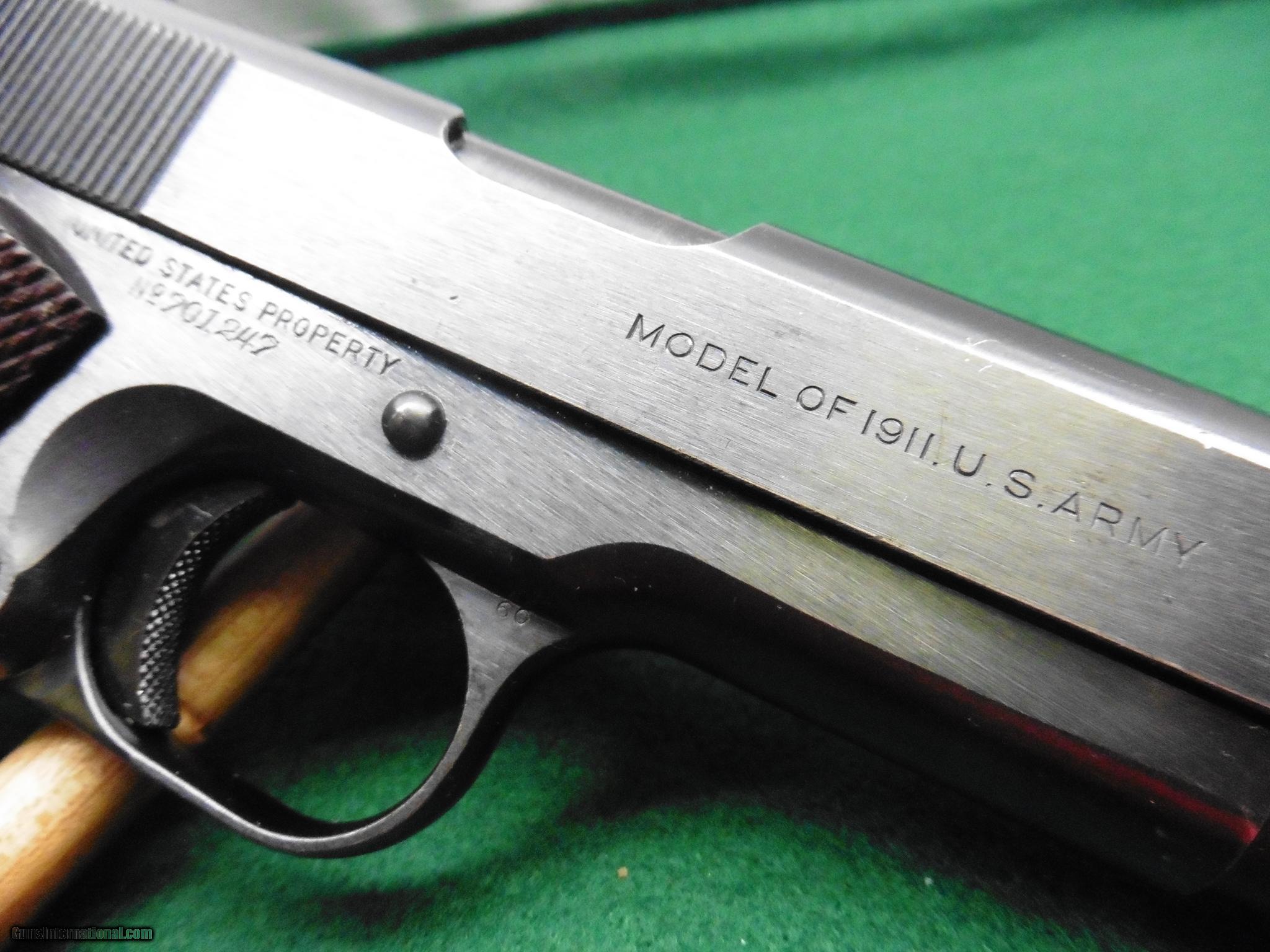 Description: Colt 1911 transition model. Stamped "Model of 1911 U S Army" this is the first year of the 1911A1 production 1924. Chambered in 45ACP with the correct dipped magazine with lanyard. Finished in Brushed Blue. Arched mainspring housing. Pistol is original and correct throughout. Finish is in good condition throghout with legible proof marks. Slight wear noted at the muzzle with some small scratches and nicks to the slide and frame. Wood grips in good condition. Idiot mark (scratch) located below takedown pin on frame. Overall a very good example of the Colt transition model. Enjoy the pictures. Please contact with any questions. We accept all major credit cards, cashier checks and money orders. 3% fee for CC transactions. Buyer to pay shipping. SOLD Curio/Relic: Yes Manufacturer: Colt Model: 1911 Transition Serial Number: 701247 Caliber Info: 45ACP |
