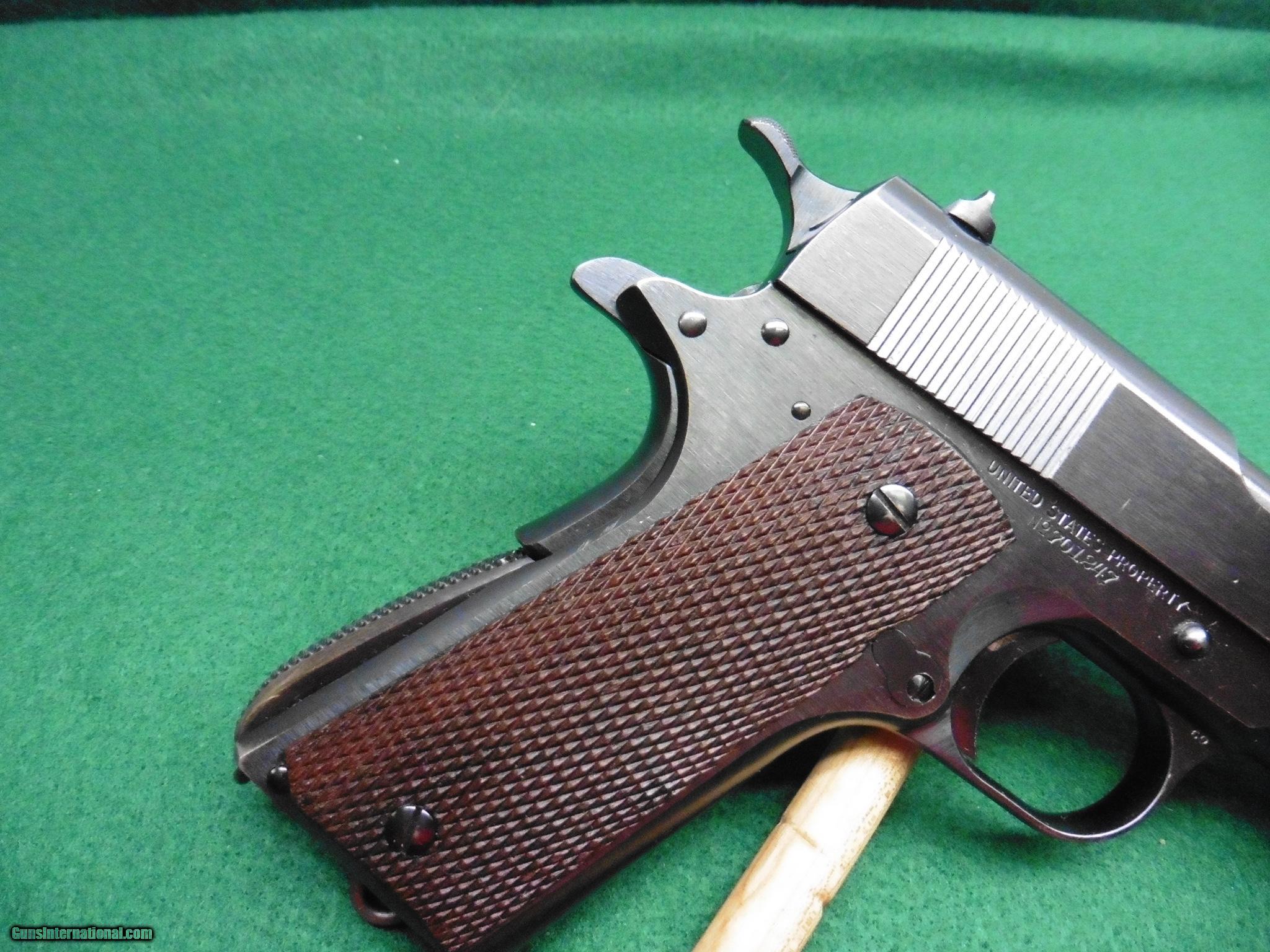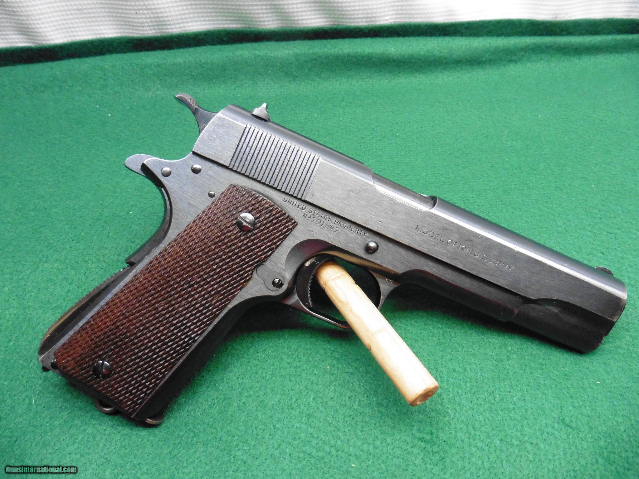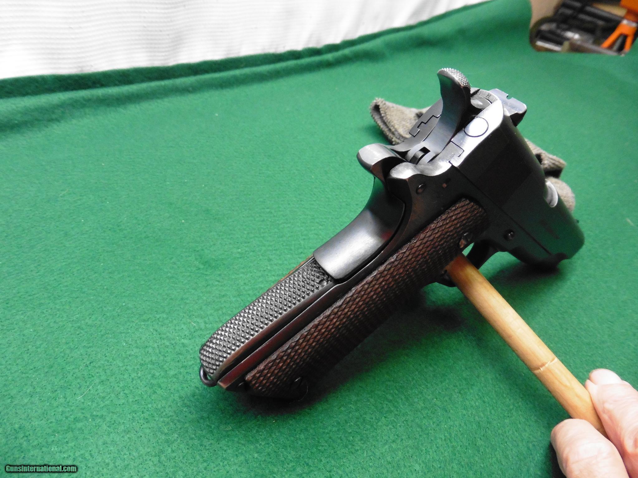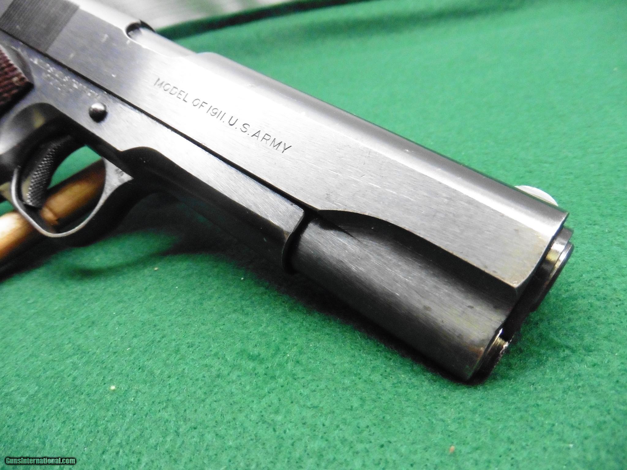 Description: Colt 1911 transition model. Stamped "Model of 1911 U S Army" this is the first year of the 1911A1 production 1924. Chambered in 45ACP with the correct dipped magazine with lanyard. Finished in Brushed Blue. Arched mainspring housing. Pistol is original and correct throughout. Finish is in good condition throghout with legible proof marks. Slight wear noted at the muzzle with some small scratches and nicks to the slide and frame. Wood grips in good condition. Idiot mark (scratch) located below takedown pin on frame. Overall a very good example of the Colt transition model. Enjoy the pictures. Please contact with any questions. We accept all major credit cards, cashier checks and money orders. 3% fee for CC transactions. Buyer to pay shipping. SOLD Curio/Relic: Yes Manufacturer: Colt Model: 1911 Transition Serial Number: 701247 Caliber Info: 45ACP |