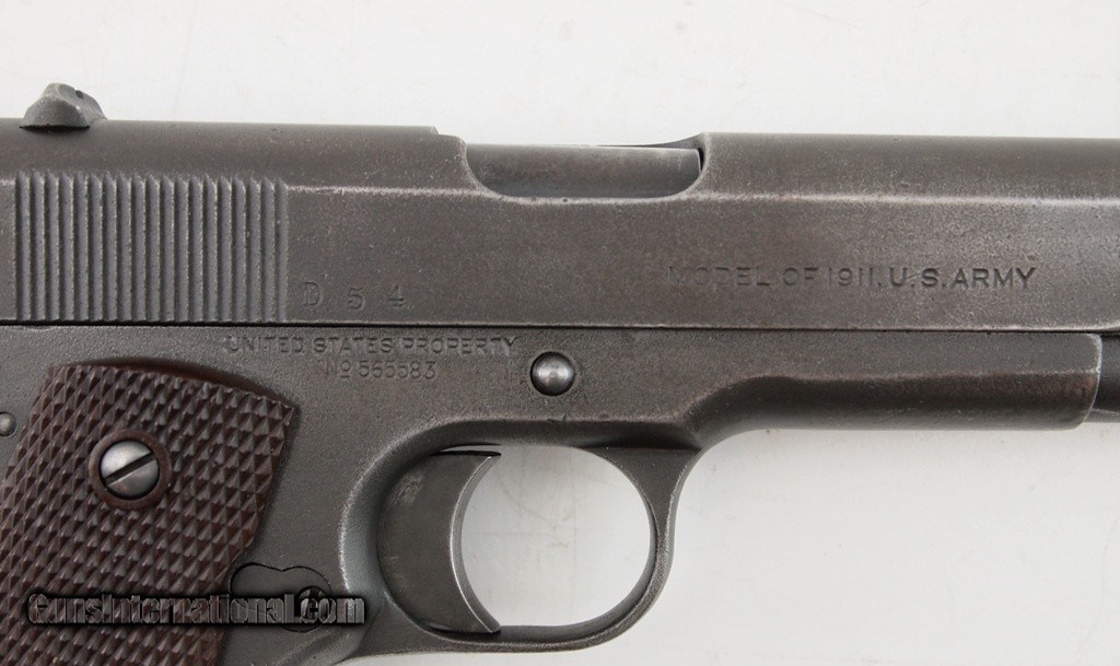 Description: Colt 1911 US ARMY MFG 1918 .45 ACP, 5" bbl, good bore, Arsenal Overhauled, magazine catch lock is correct, magazine is not, recoil spring and plug are correct, safety lock is correct, hammer is not correct, heart shaped openings in grip (frame), slide stop is not correct, grips are later style, High Standard barrel, Augusta Arsenal "AA" on left side of frame, proof mark on left side of frame, Type 1 eagle head inspection mark Inspection Division, May 15, 1918-April 1919, "UNITED STATES PROPERTY No. 565583" stamped on right side of frame, right top grip screw or bushing is stripped, and lanyard loop. Add 3% for Credit Card Shipping $25.00 SOLD |