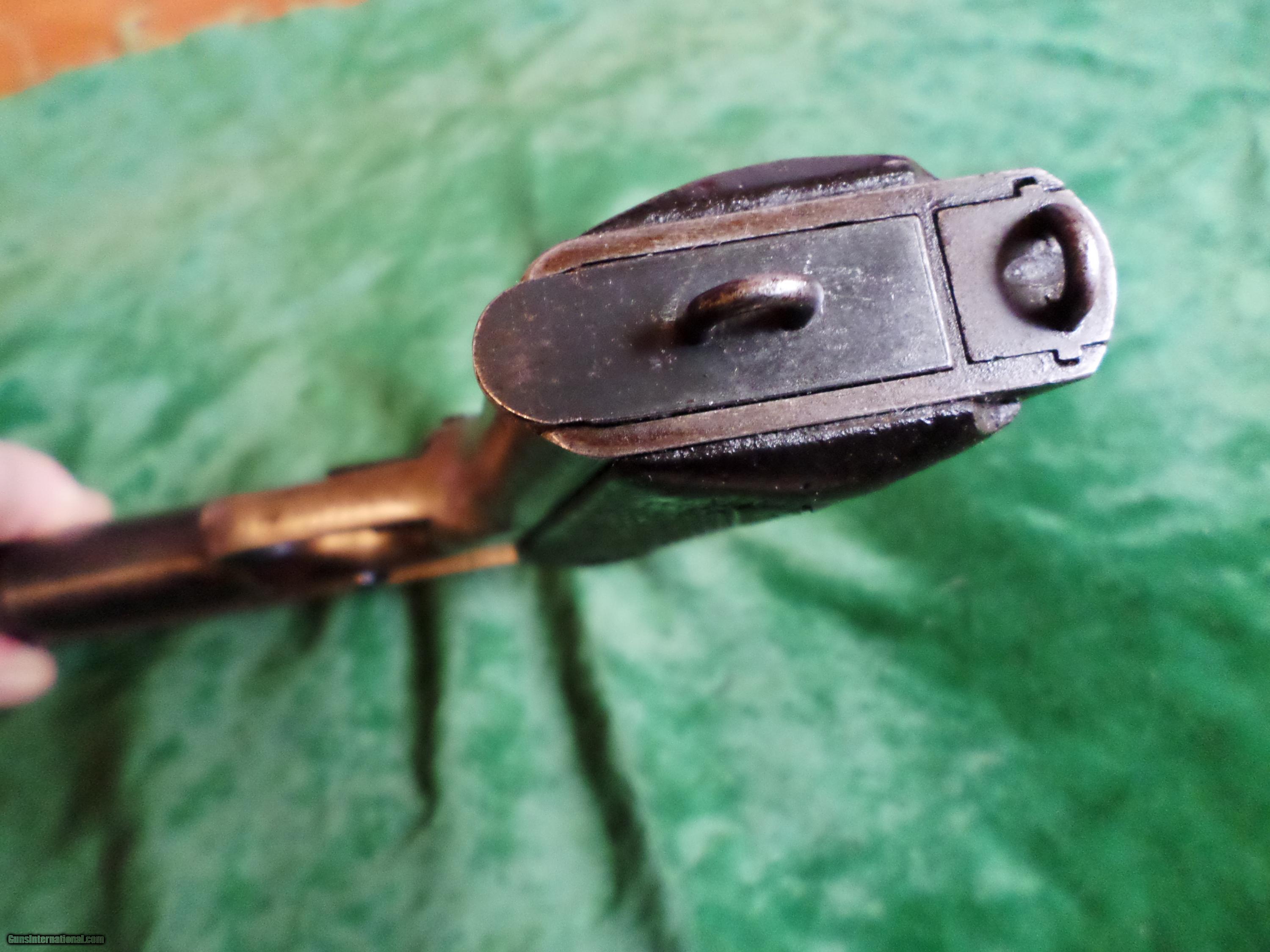 Description: For the collector/investor, extra nice WWI Colt 1911. Serial #490xxx, mfg. 1918. 70% black Army finish, fading thin blue in handling areas, Holster wear on edges and mechanical wear spots; some scratches. No rust or pitting. Bore shiny, marked PH. All markings are clear and strong. Springfield Armory inspectors mark by trigger; "United States Property". All original parts and finish. Original walnut grips have good checkering, no chips. This Colt is mechanically fine. Three extra mags are included. All four are period mags, pinned, two toned and two with lanyard loops. The secomd mag with the lanyard loop appears to have been a WWI battlefield relic, has deep corrosion. A real historical piece; hard to find in this condition and price. Please ask questions. Return in 3 days (non firing) for full refund less $50. Buyer pays all shipping. $45 for priority Mail in the US. C&R OK. SOLD Curio/Relic: Yes |
