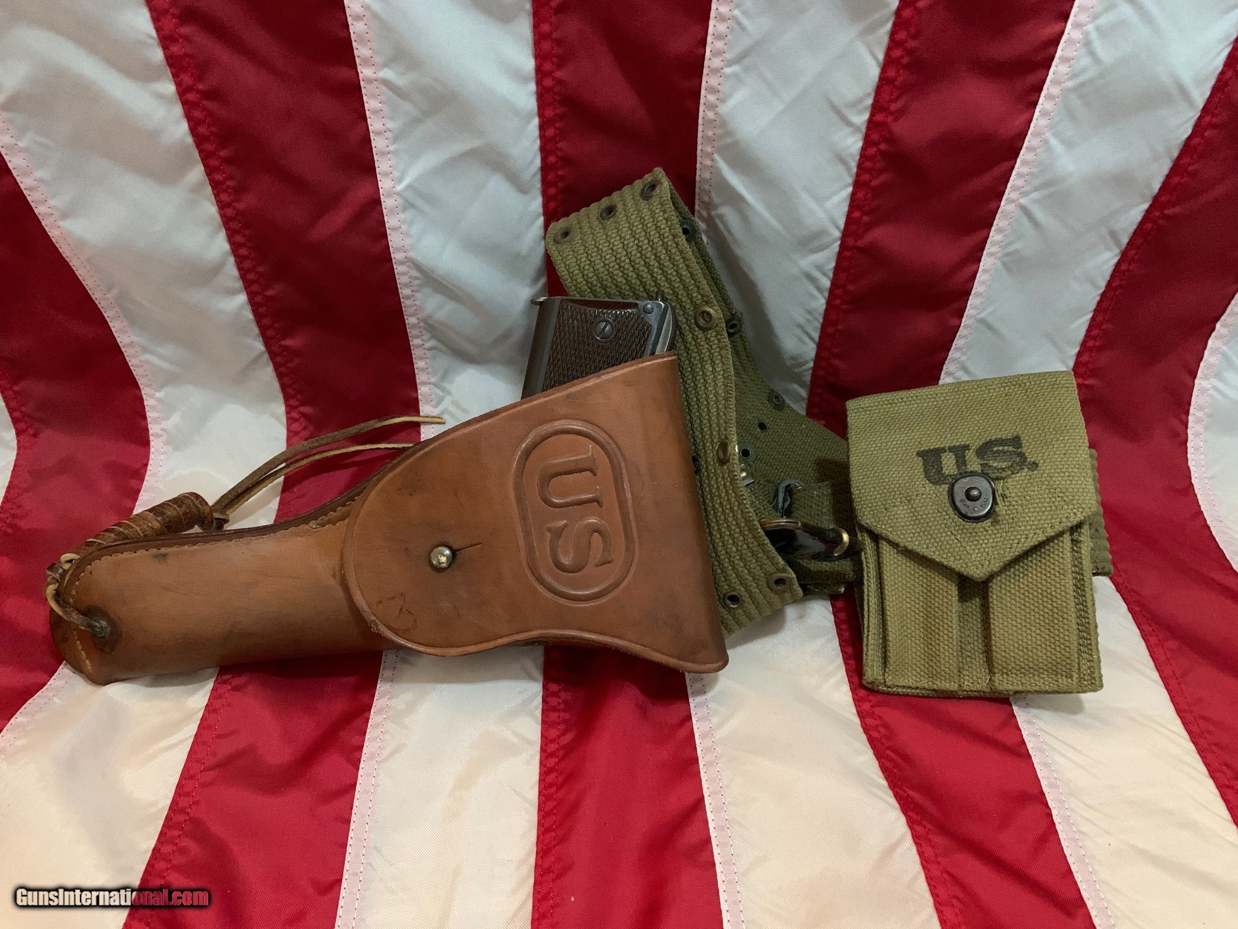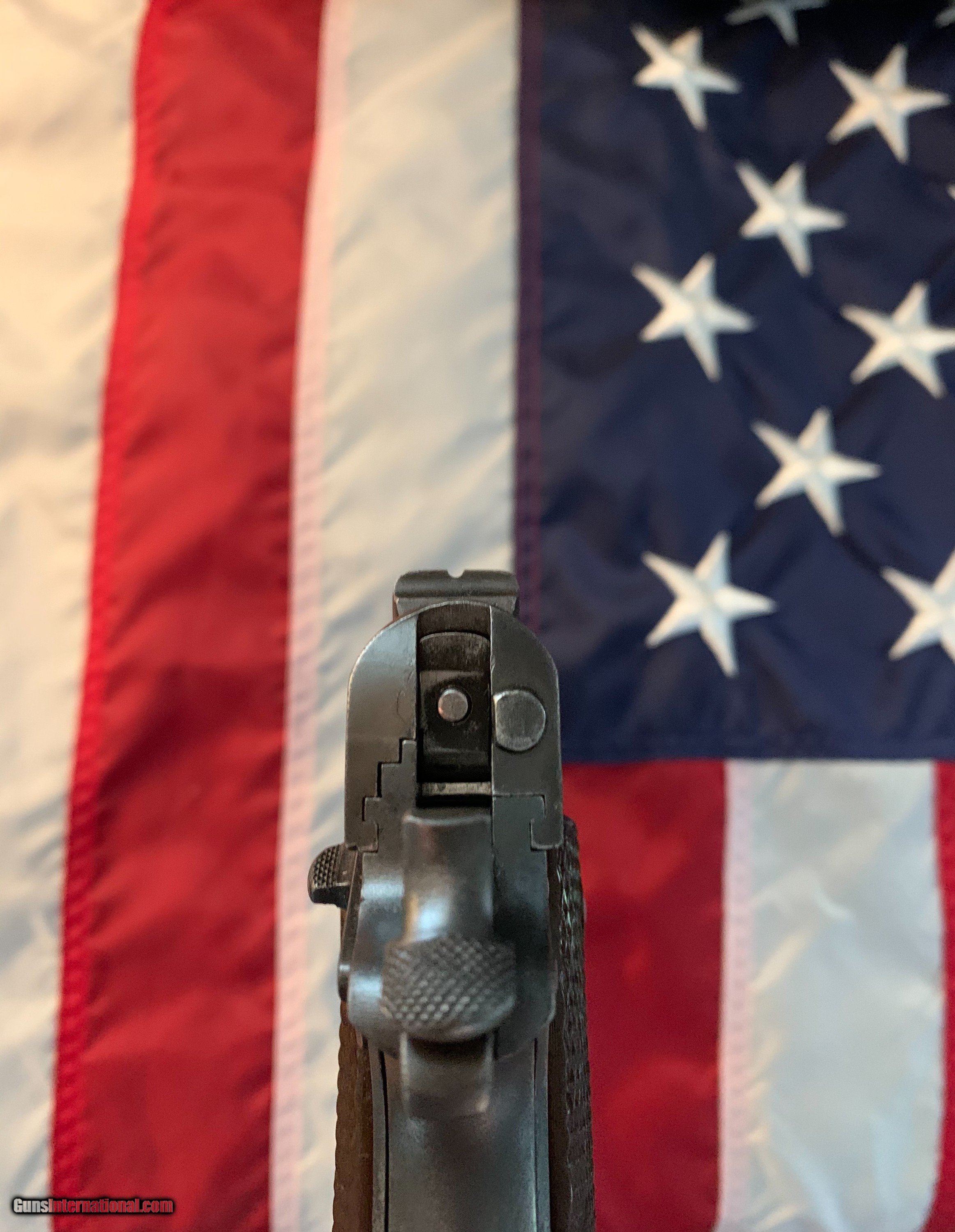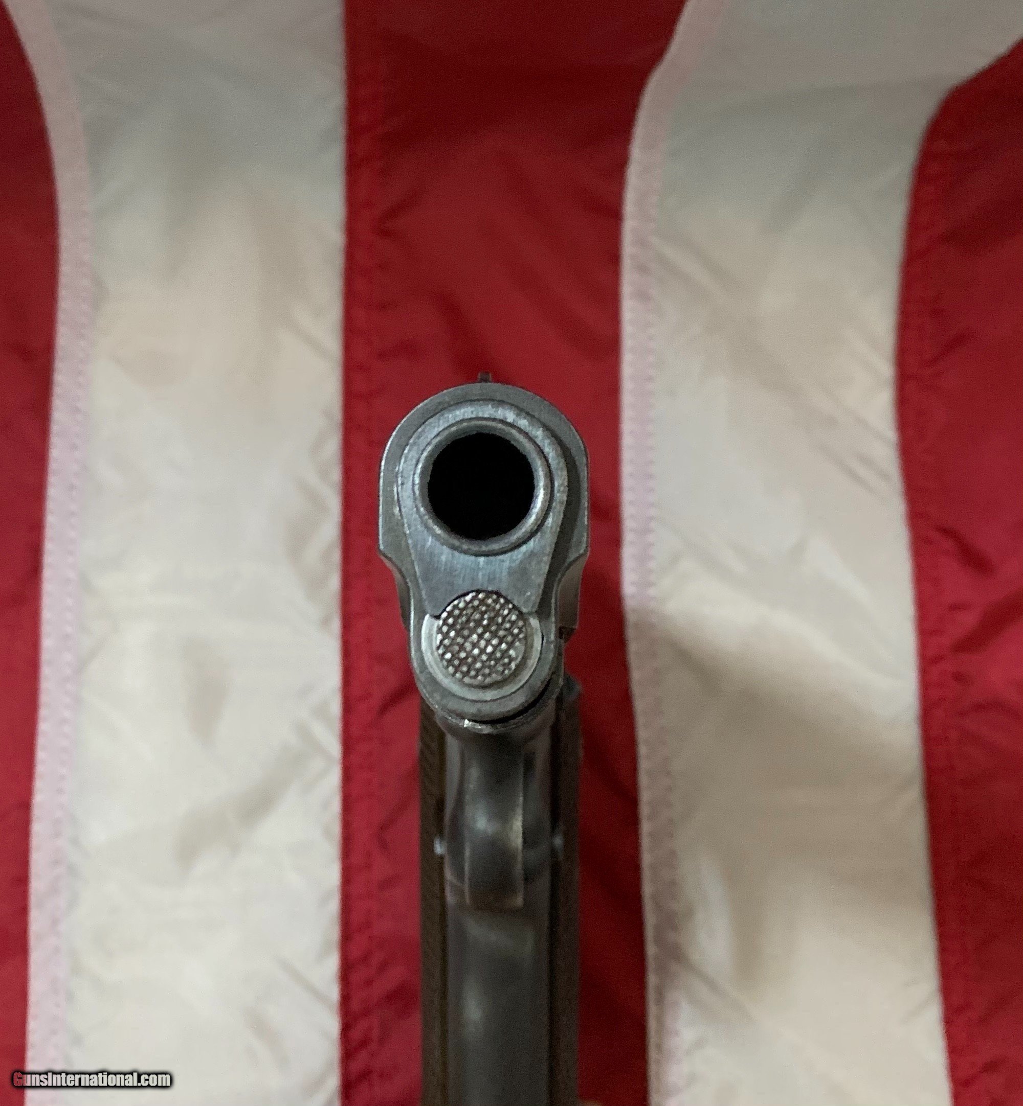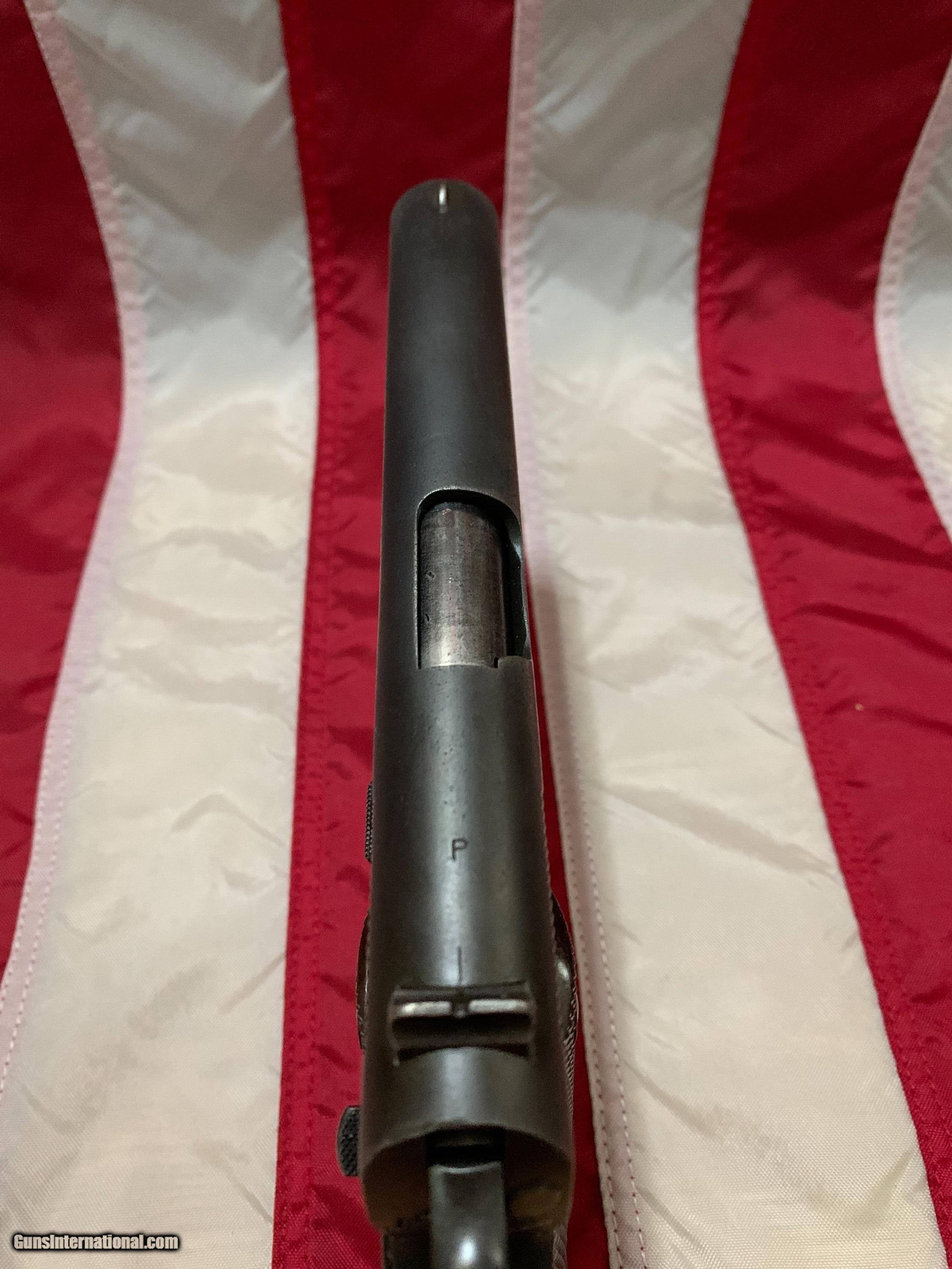 Description: This listing is for a Colt 1911A1 semi automatic pistol chambered in .45 ACP serial number 755916 manufactured in 1941. I hate to let this one go but I know some lucky fella will keep this pony in good hands. The pistol was sent to Springfield Armory on the 27th of December in 1941, only a couple of weeks after Pearl Harbor. It is a rarely seen 1941 "W.B" marked pistol. It must have surely seen some wartime use and wear, and from then till now some harsh storage. There is light pitting and minimal rusting scattered across the slide, frame magazine and checkered mainspring housing, I've treated it over a time or two to ensure that the rusting and pitting is as removed as can be without beginning a serious refinish/ getting it re-Parkerized. However that is the only downside to this beautiful pistol. It is dead accurate and is a dream to shoot. All the proof marks and stampings are still very strong and visible. Along with the gun is also a WWII M1916 "Craighead" holster with original leg tie in excellent condition. This “Craighead” M1916 Holster is undated, which suggests that it is one of the scarcer mid- to late-war example. Most of the M1916 Holster contracts awarded to the several manufacturers were awarded in 1942 in the very first months of the War. Fewer contracts were “let” in subsoquent years and are less common, but most importantly, John R. Craighead Company, Inc. holsters are very rare. Unique to the Craighead Holsters, “U.S.” on the Flap is enclosed in a “Rounded” rectangle rather than an oval as was the practice of the other manufacturers. Craighead also additionally stamped a san-serif “U.S.” on the rear of the Holster beneath the M1910 Belt Hook and above the circular Craighead Crest. The only 'flaw' is a small scratch on the left edge of the Flap visible in the photographs. This Holster has never been dyed post-war. The "Orange" Linen Stitching is in perfect condition. (NB: The current reproduction Holsters use "White" thread.) The small internal Wooden Shaping Block at Toe of the Holster is still present. The Blackened Brass Eyelets for the Leg Lace Tie are still firmly anchored in the leather. The original Leather Lace Leg Tie is present, coiled, and in exceptional condition. The finish on the Blackened Steel M1910 Belt Hook is excellent, showing only the slightest wear from being threaded onto a Pistol Belt. There is ZERO wear or cracking where the leather folds over the M1910 Belt Hook. The 4 Brass Rivets and the Flap Stud are secure and show only the slightest trace trace of verdigris. Lastly there is also the M1936 "O.D" Green canvaspistol belt. It is original, and the strong O.D has faded a bit with the years. Along with the pistol belt is an original 1911 magazine pouch, manufactured (and marked) by Boyle with the date 1942. FEATURES: 1911A1, Parkerized finish, 5" Barrel, "M1911A1 U.S Army" and "United States Property" Markings. "W.B is the stamped inspectors mark and there is the "P" mark near the magazine release. On the right side of the trigger guard there is the "24" marking. Matching slide to frame. On the left side of the trigger guard the correct marking is present. On the top rear of the slide near the sight there is the correct "P" marking. Magazine has L marking on base plate. Non-reinforced correct and original "Coltwood" grips. All patent and proof marks are correct and very visible. SOLD Curio/Relic: Yes Handgun Caliber: .45 ACP (.45 Auto) Manufacturer: Colt Model: M1911 A1 Condition: Good Bore Condition: Excellent Finish: Parkerized Weight: 2.00 Manufacture Date: 1941 |