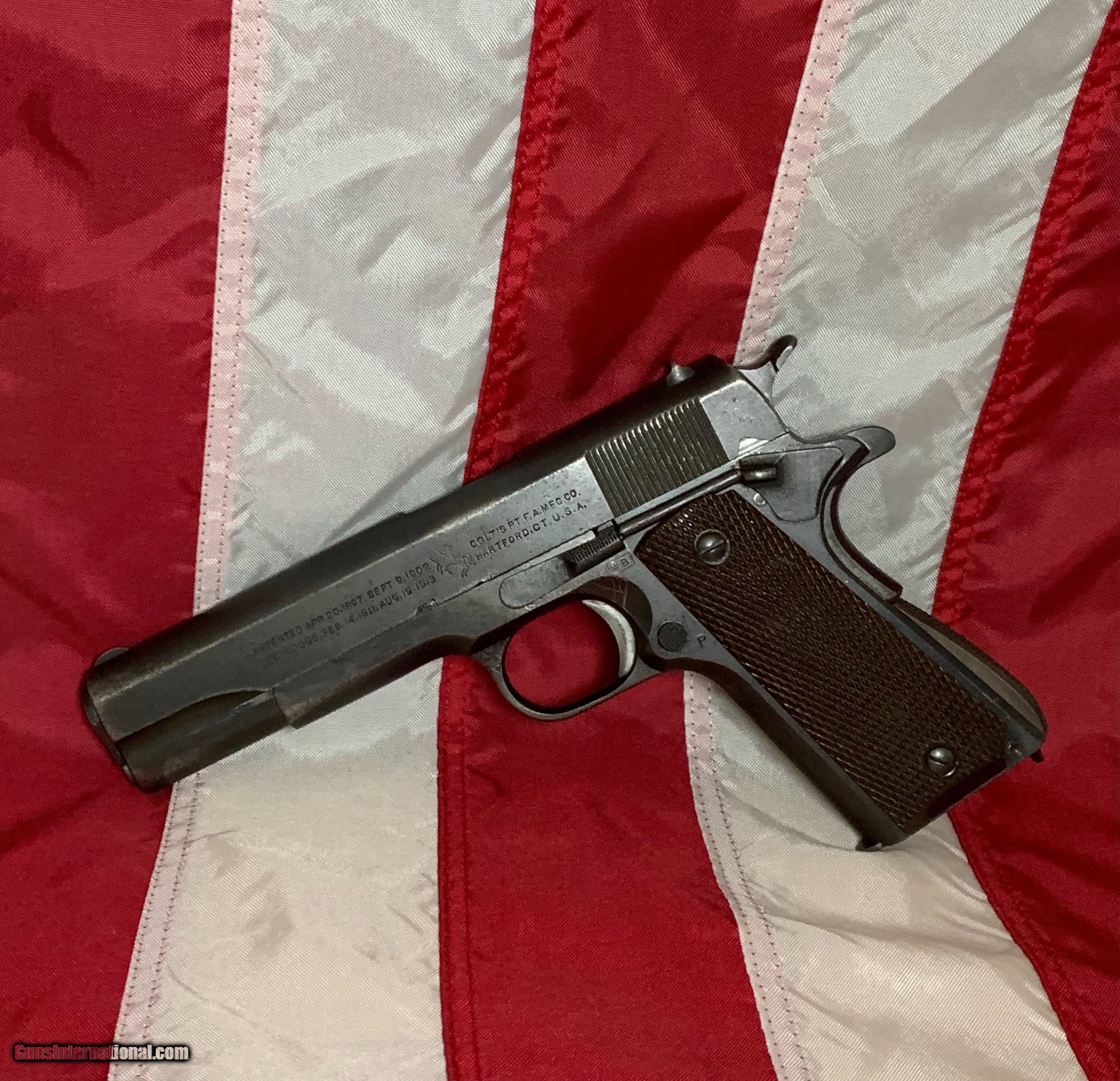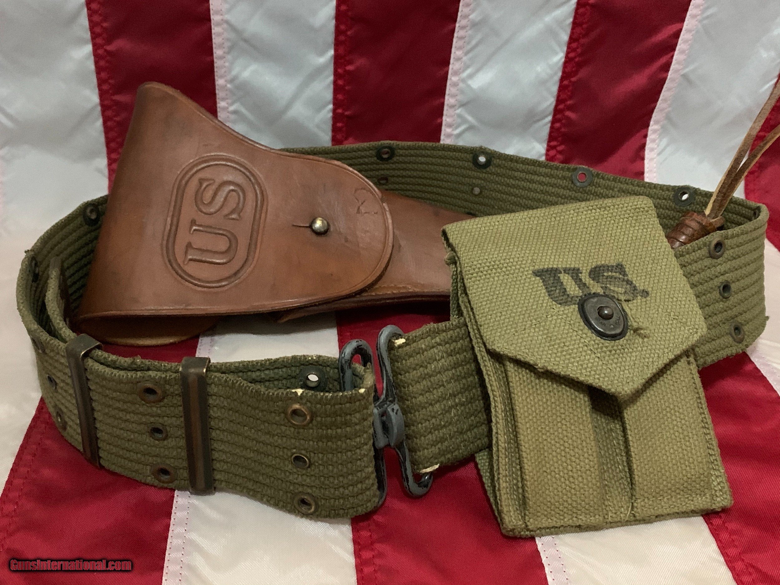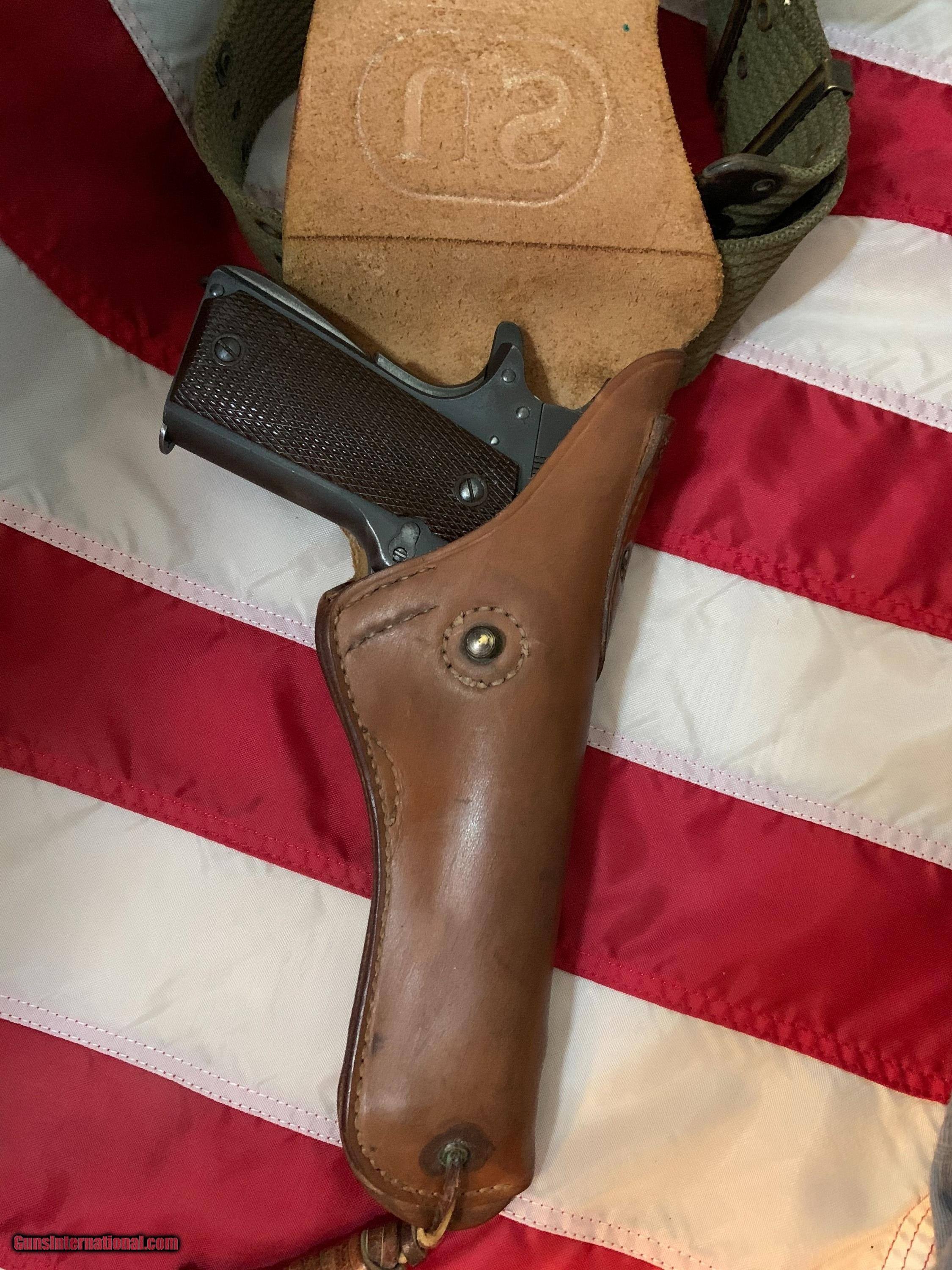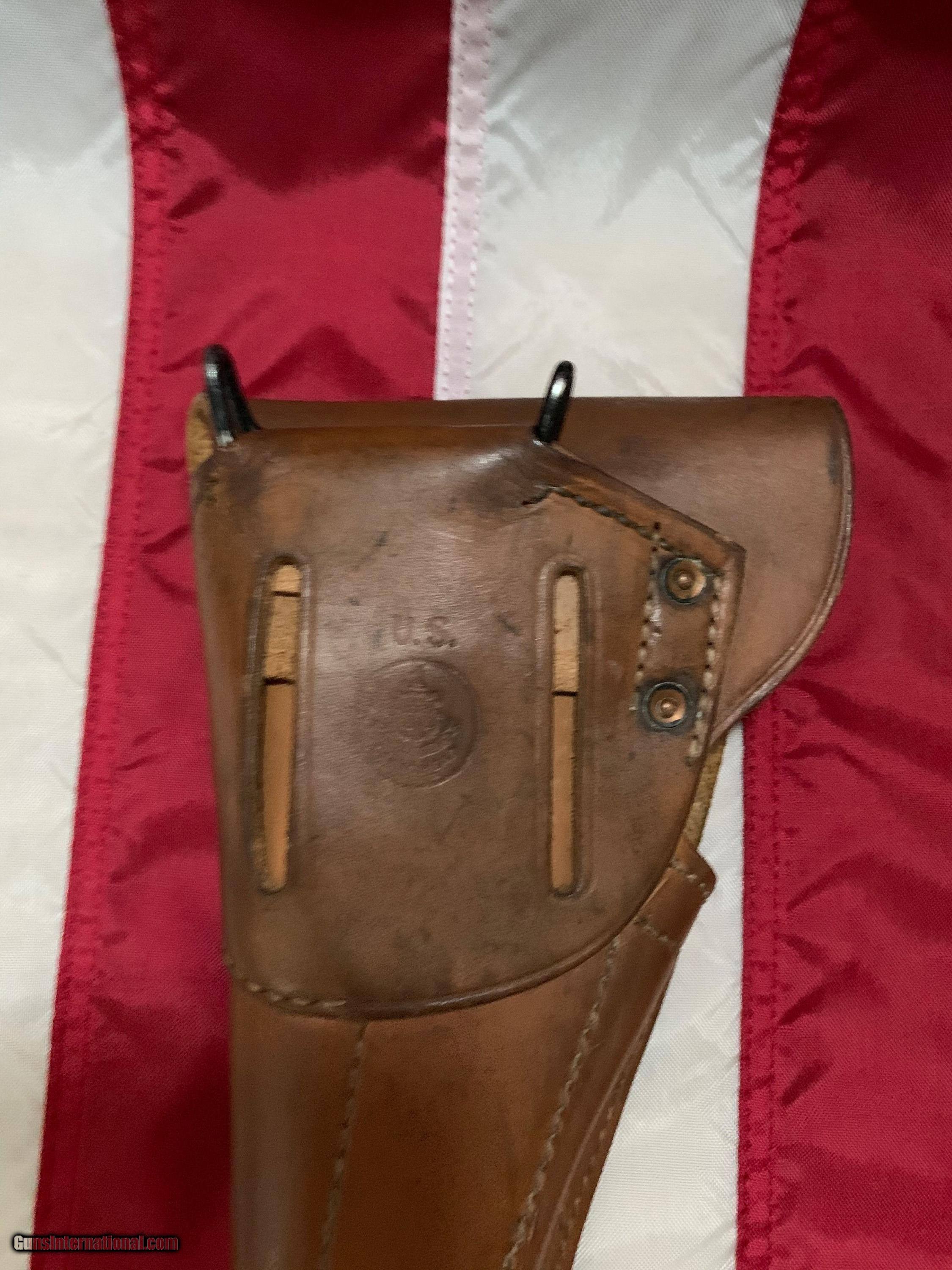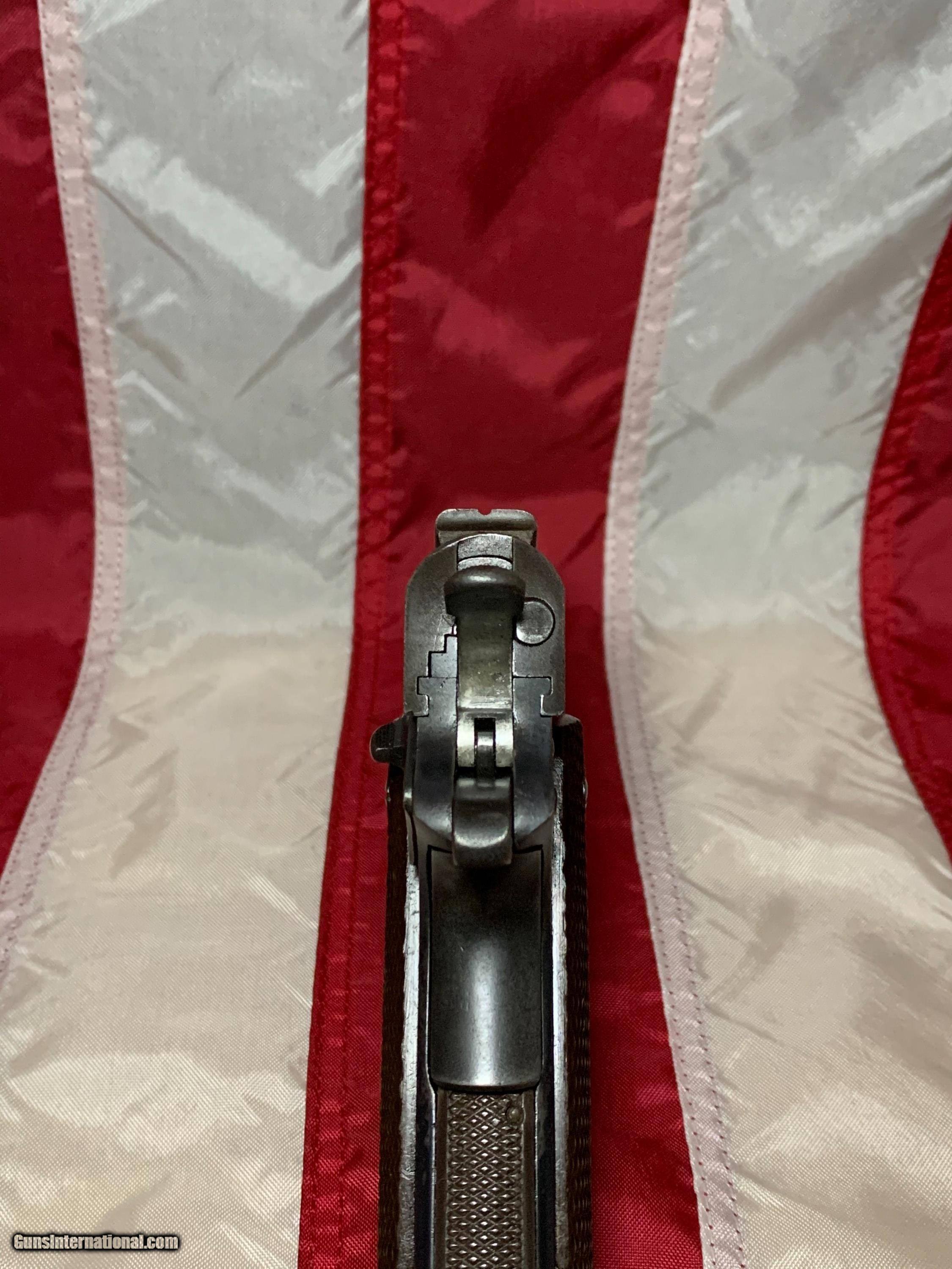 Description: This listing is for a Colt 1911A1 semi automatic pistol chambered in .45 ACP serial number 755916 manufactured in 1941. I hate to let this one go but I know some lucky fella will keep this pony in good hands. The pistol was sent to Springfield Armory on the 27th of December in 1941, only a couple of weeks after Pearl Harbor. It is a rarely seen 1941 "W.B" marked pistol. It must have surely seen some wartime use and wear, and from then till now some harsh storage. There is light pitting and minimal rusting scattered across the slide, frame magazine and checkered mainspring housing, I've treated it over a time or two to ensure that the rusting and pitting is as removed as can be without beginning a serious refinish/ getting it re-Parkerized. However that is the only downside to this beautiful pistol. It is dead accurate and is a dream to shoot. All the proof marks and stampings are still very strong and visible. Along with the gun is also a WWII M1916 "Craighead" holster with original leg tie in excellent condition. This “Craighead” M1916 Holster is undated, which suggests that it is one of the scarcer mid- to late-war example. Most of the M1916 Holster contracts awarded to the several manufacturers were awarded in 1942 in the very first months of the War. Fewer contracts were “let” in subsoquent years and are less common, but most importantly, John R. Craighead Company, Inc. holsters are very rare. Unique to the Craighead Holsters, “U.S.” on the Flap is enclosed in a “Rounded” rectangle rather than an oval as was the practice of the other manufacturers. Craighead also additionally stamped a san-serif “U.S.” on the rear of the Holster beneath the M1910 Belt Hook and above the circular Craighead Crest. The only 'flaw' is a small scratch on the left edge of the Flap visible in the photographs. This Holster has never been dyed post-war. The "Orange" Linen Stitching is in perfect condition. (NB: The current reproduction Holsters use "White" thread.) The small internal Wooden Shaping Block at Toe of the Holster is still present. The Blackened Brass Eyelets for the Leg Lace Tie are still firmly anchored in the leather. The original Leather Lace Leg Tie is present, coiled, and in exceptional condition. The finish on the Blackened Steel M1910 Belt Hook is excellent, showing only the slightest wear from being threaded onto a Pistol Belt. There is ZERO wear or cracking where the leather folds over the M1910 Belt Hook. The 4 Brass Rivets and the Flap Stud are secure and show only the slightest trace trace of verdigris. Lastly there is also the M1936 "O.D" Green canvaspistol belt. It is original, and the strong O.D has faded a bit with the years. Along with the pistol belt is an original 1911 magazine pouch, manufactured (and marked) by Boyle with the date 1942. FEATURES: 1911A1, Parkerized finish, 5" Barrel, "M1911A1 U.S Army" and "United States Property" Markings. "W.B is the stamped inspectors mark and there is the "P" mark near the magazine release. On the right side of the trigger guard there is the "24" marking. Matching slide to frame. On the left side of the trigger guard the correct marking is present. On the top rear of the slide near the sight there is the correct "P" marking. Magazine has L marking on base plate. Non-reinforced correct and original "Coltwood" grips. All patent and proof marks are correct and very visible. SOLD Curio/Relic: Yes Handgun Caliber: .45 ACP (.45 Auto) Manufacturer: Colt Model: M1911 A1 Condition: Good Bore Condition: Excellent Finish: Parkerized Weight: 2.00 Manufacture Date: 1941 |