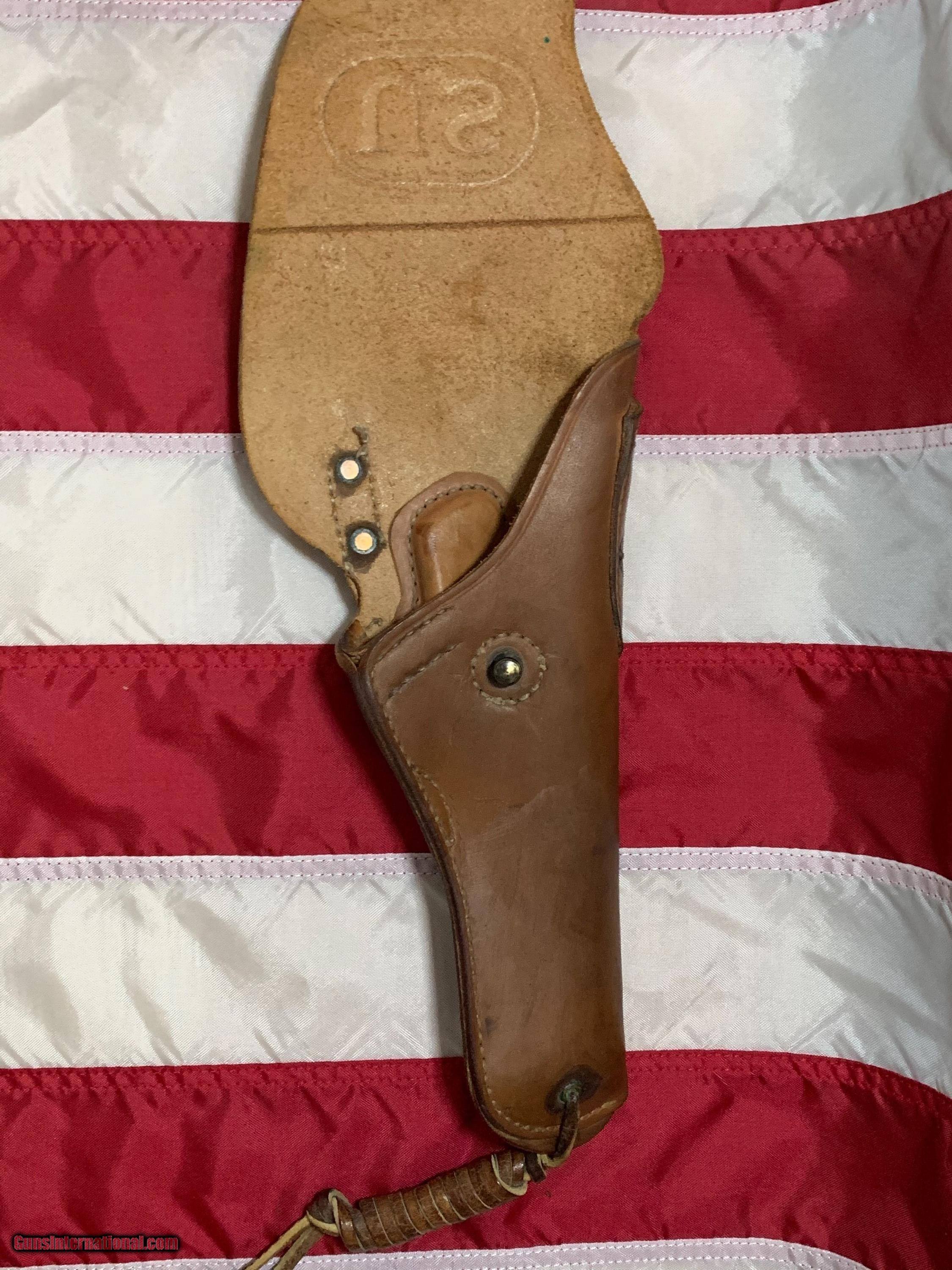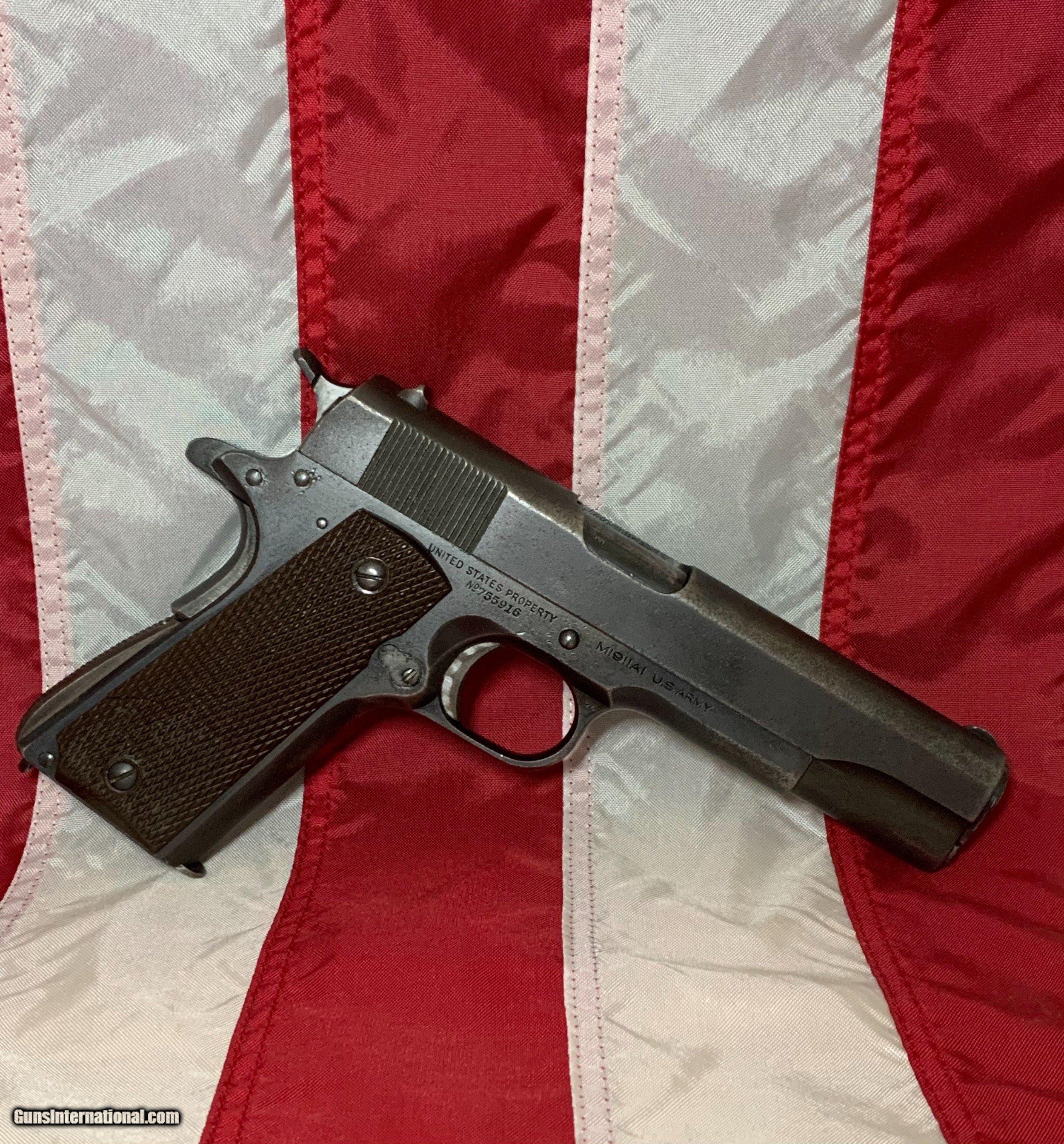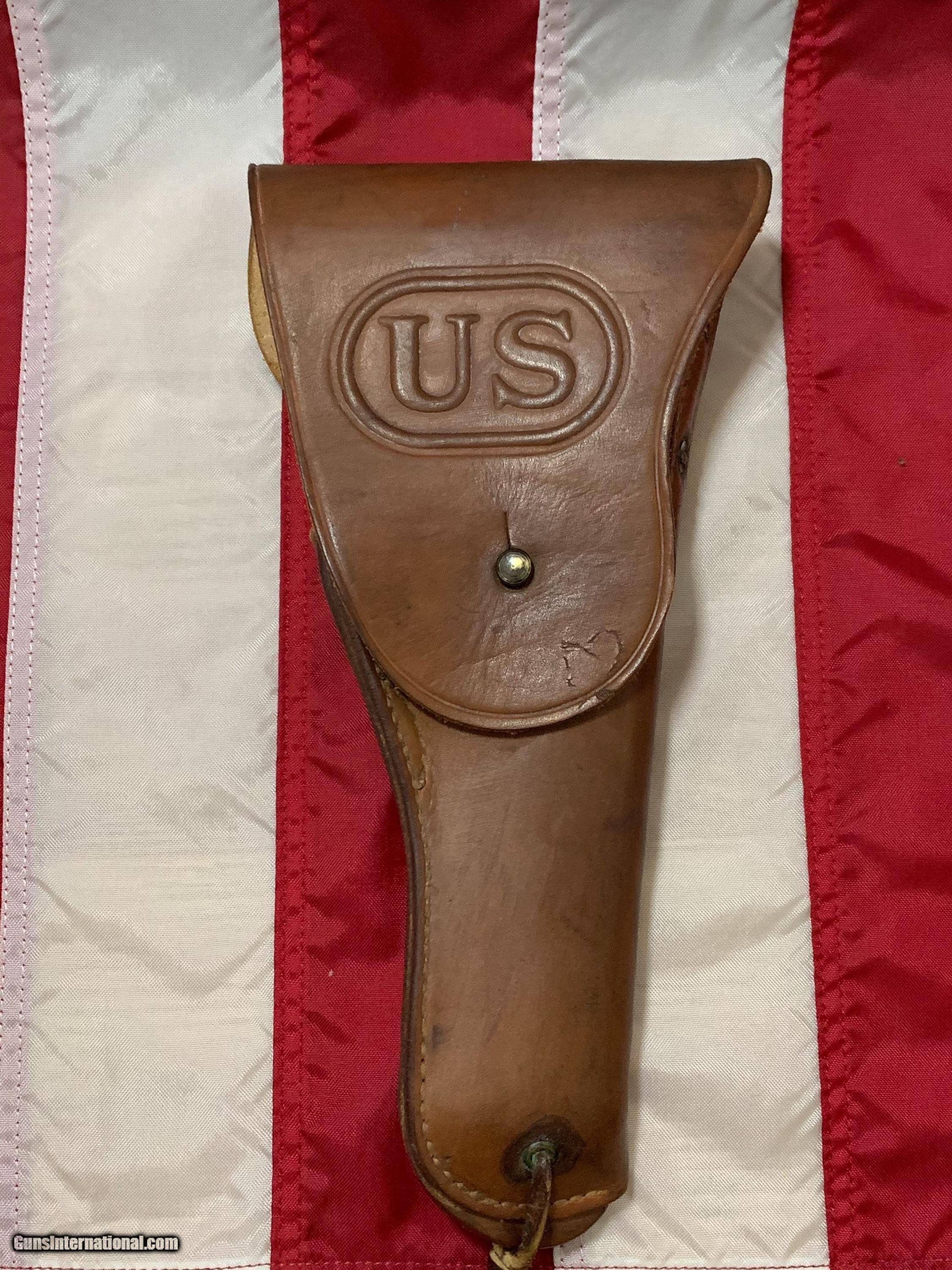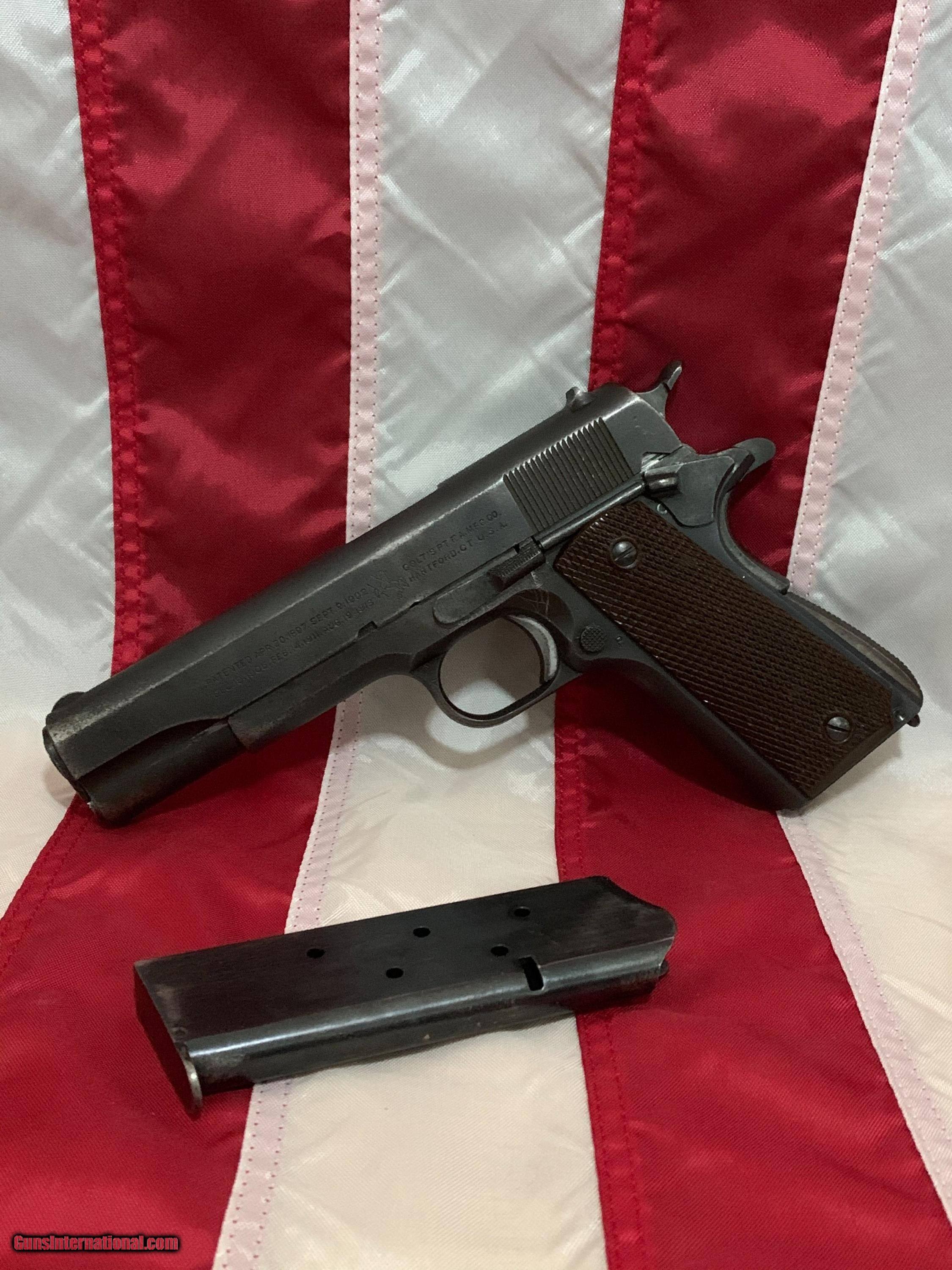 Description: This listing is for a Colt 1911A1 semi automatic pistol chambered in .45 ACP serial number 755916 manufactured in 1941. I hate to let this one go but I know some lucky fella will keep this pony in good hands. The pistol was sent to Springfield Armory on the 27th of December in 1941, only a couple of weeks after Pearl Harbor. It is a rarely seen 1941 "W.B" marked pistol. It must have surely seen some wartime use and wear, and from then till now some harsh storage. There is light pitting and minimal rusting scattered across the slide, frame magazine and checkered mainspring housing, I've treated it over a time or two to ensure that the rusting and pitting is as removed as can be without beginning a serious refinish/ getting it re-Parkerized. However that is the only downside to this beautiful pistol. It is dead accurate and is a dream to shoot. All the proof marks and stampings are still very strong and visible. Along with the gun is also a WWII M1916 "Craighead" holster with original leg tie in excellent condition. This “Craighead” M1916 Holster is undated, which suggests that it is one of the scarcer mid- to late-war example. Most of the M1916 Holster contracts awarded to the several manufacturers were awarded in 1942 in the very first months of the War. Fewer contracts were “let” in subsoquent years and are less common, but most importantly, John R. Craighead Company, Inc. holsters are very rare. Unique to the Craighead Holsters, “U.S.” on the Flap is enclosed in a “Rounded” rectangle rather than an oval as was the practice of the other manufacturers. Craighead also additionally stamped a san-serif “U.S.” on the rear of the Holster beneath the M1910 Belt Hook and above the circular Craighead Crest. The only 'flaw' is a small scratch on the left edge of the Flap visible in the photographs. This Holster has never been dyed post-war. The "Orange" Linen Stitching is in perfect condition. (NB: The current reproduction Holsters use "White" thread.) The small internal Wooden Shaping Block at Toe of the Holster is still present. The Blackened Brass Eyelets for the Leg Lace Tie are still firmly anchored in the leather. The original Leather Lace Leg Tie is present, coiled, and in exceptional condition. The finish on the Blackened Steel M1910 Belt Hook is excellent, showing only the slightest wear from being threaded onto a Pistol Belt. There is ZERO wear or cracking where the leather folds over the M1910 Belt Hook. The 4 Brass Rivets and the Flap Stud are secure and show only the slightest trace trace of verdigris. Lastly there is also the M1936 "O.D" Green canvaspistol belt. It is original, and the strong O.D has faded a bit with the years. Along with the pistol belt is an original 1911 magazine pouch, manufactured (and marked) by Boyle with the date 1942. FEATURES: 1911A1, Parkerized finish, 5" Barrel, "M1911A1 U.S Army" and "United States Property" Markings. "W.B is the stamped inspectors mark and there is the "P" mark near the magazine release. On the right side of the trigger guard there is the "24" marking. Matching slide to frame. On the left side of the trigger guard the correct marking is present. On the top rear of the slide near the sight there is the correct "P" marking. Magazine has L marking on base plate. Non-reinforced correct and original "Coltwood" grips. All patent and proof marks are correct and very visible. SOLD Curio/Relic: Yes Handgun Caliber: .45 ACP (.45 Auto) Manufacturer: Colt Model: M1911 A1 Condition: Good Bore Condition: Excellent Finish: Parkerized Weight: 2.00 Manufacture Date: 1941 |