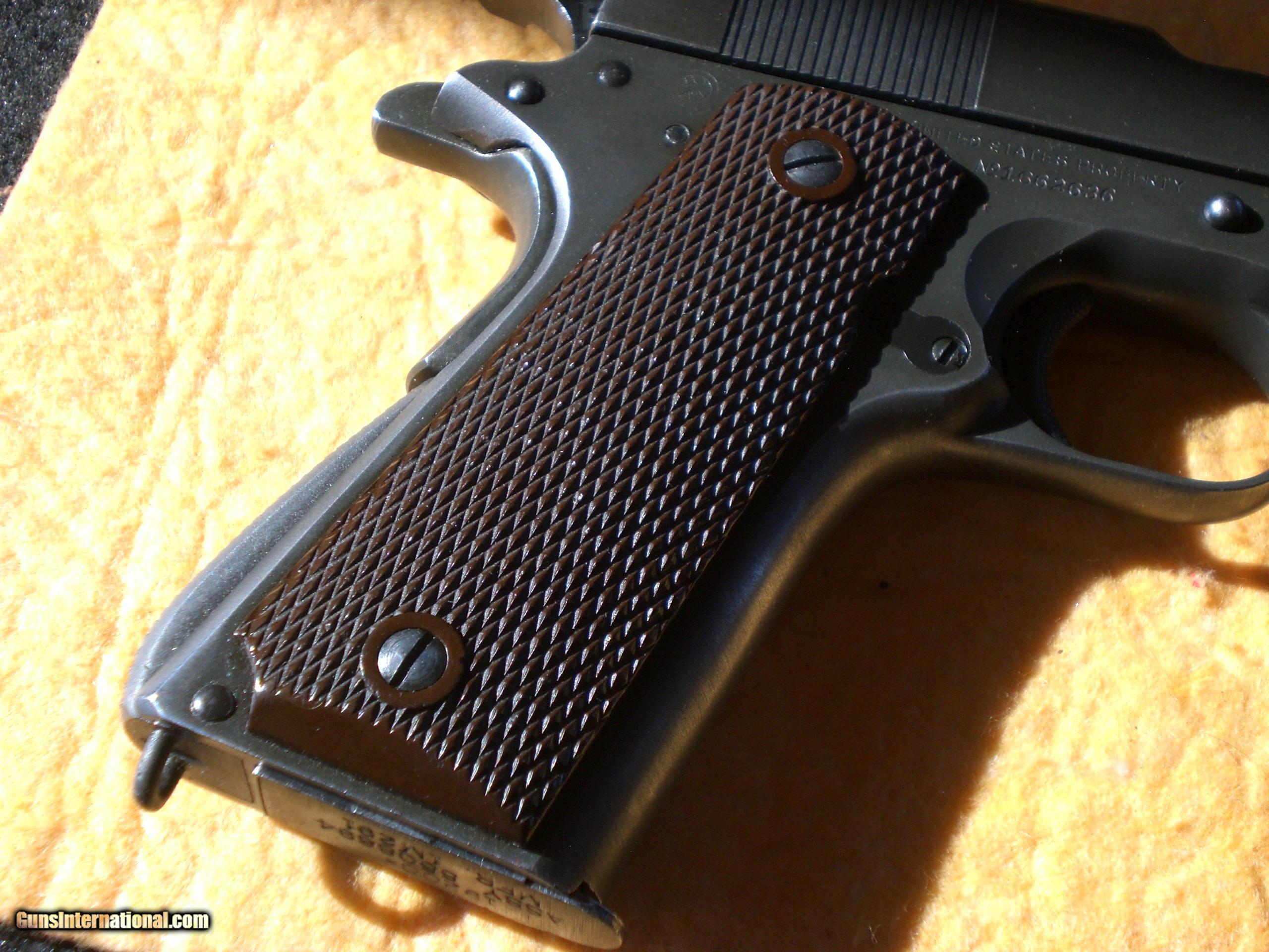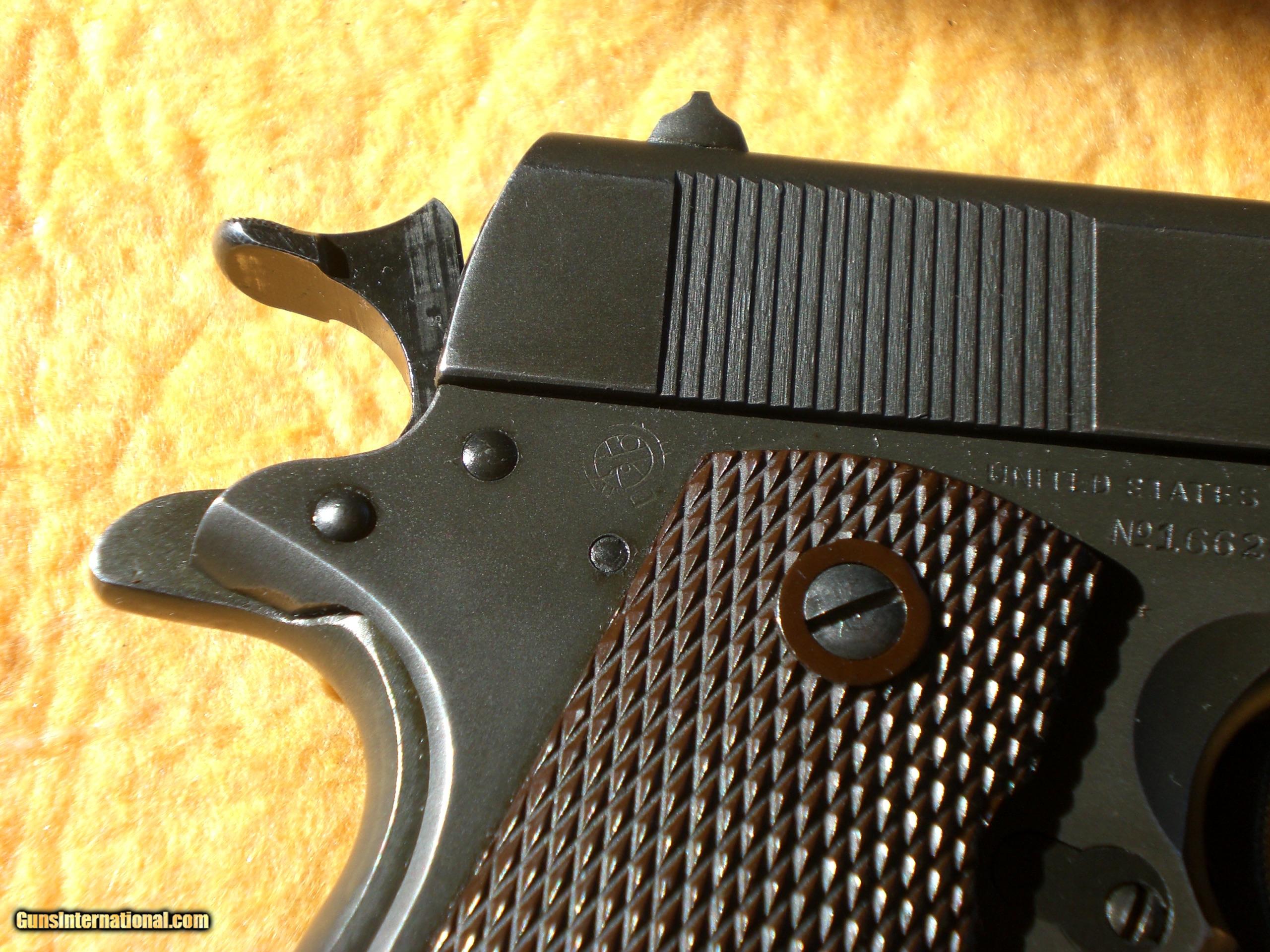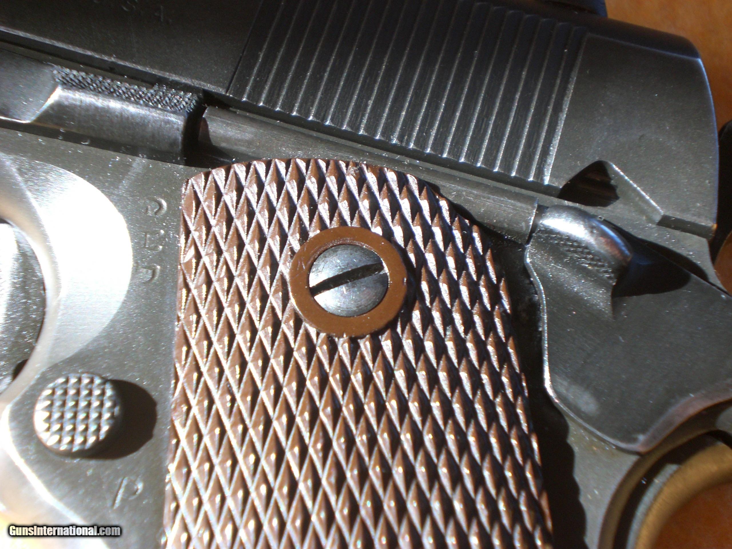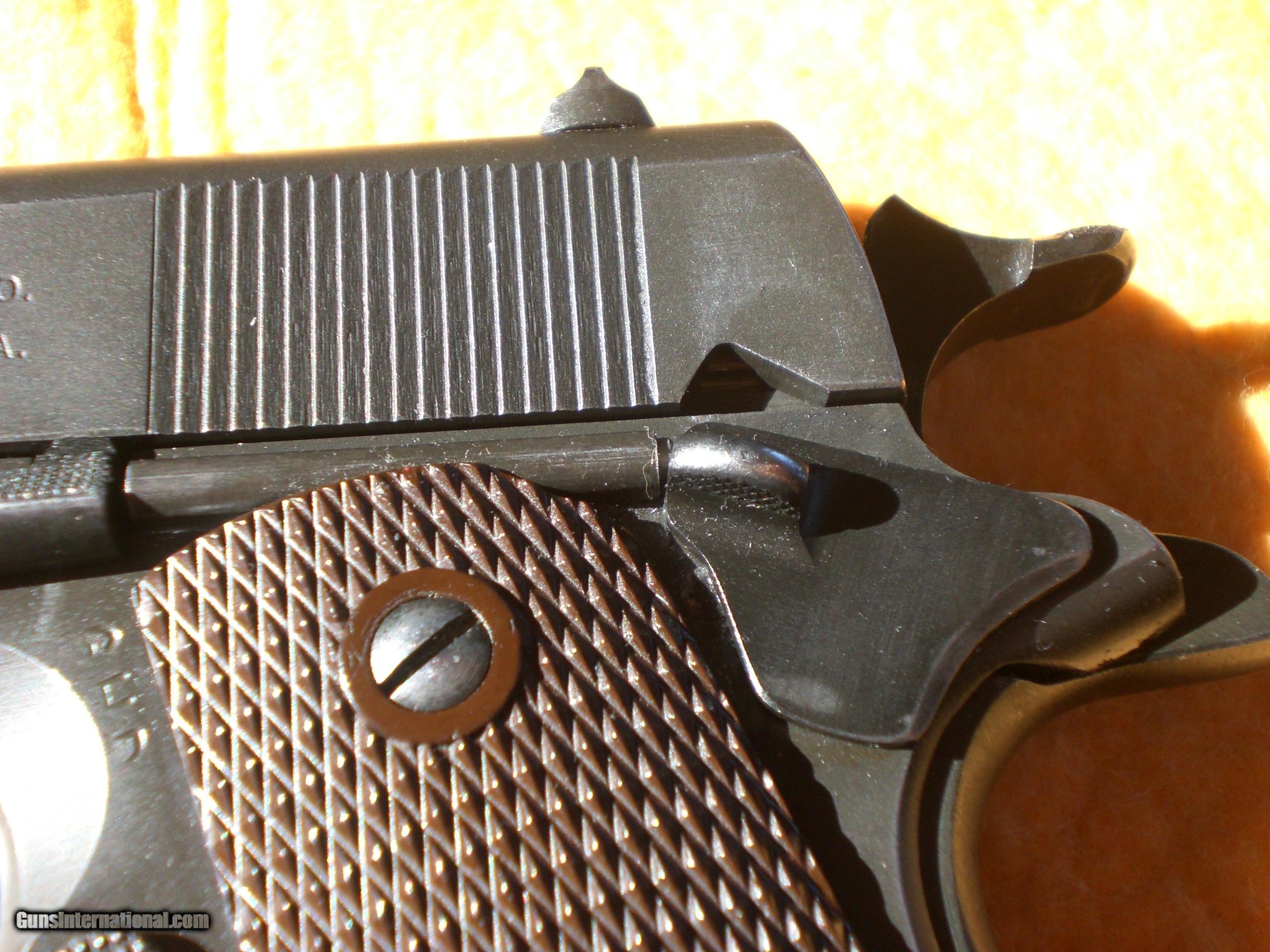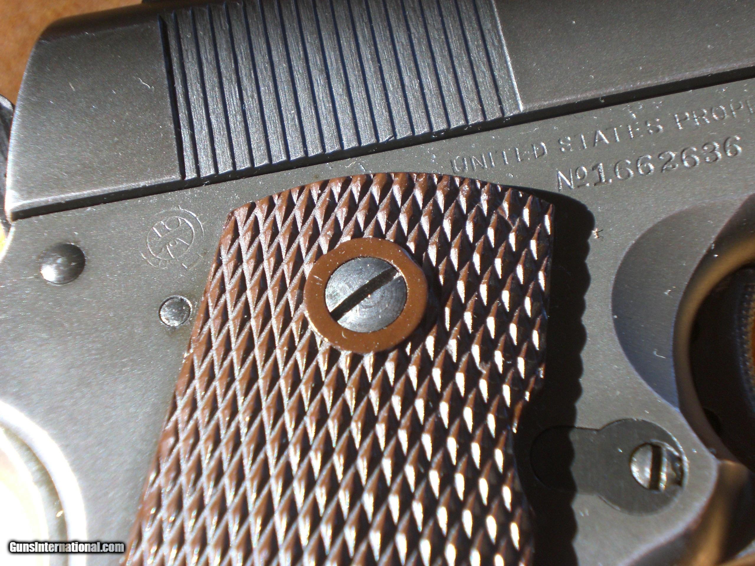 Description: Very late production (1945; serial no. 1,662,XXX) Colt manufacture 1911A!. Complete, unaltered, every mark and part there. Looks like maybe an MP's pistol, because left side, especially slide release and safety, show finish wear, as do sharp edges, as if if a lot of unholstering and holstering (for inspection?). Original barrel finish worn somewhat at ejection port, consistent with same history. Otherwise as issued. Mirror bore. HCD inspector's mark for BG Hugh C. Drewry, senior Army inspector. Grips and grips screws appear untouched. Magazine floorplate has contractor markings (see photos). Overall, excellent late WWII collector. SOLD Curio/Relic: Yes |