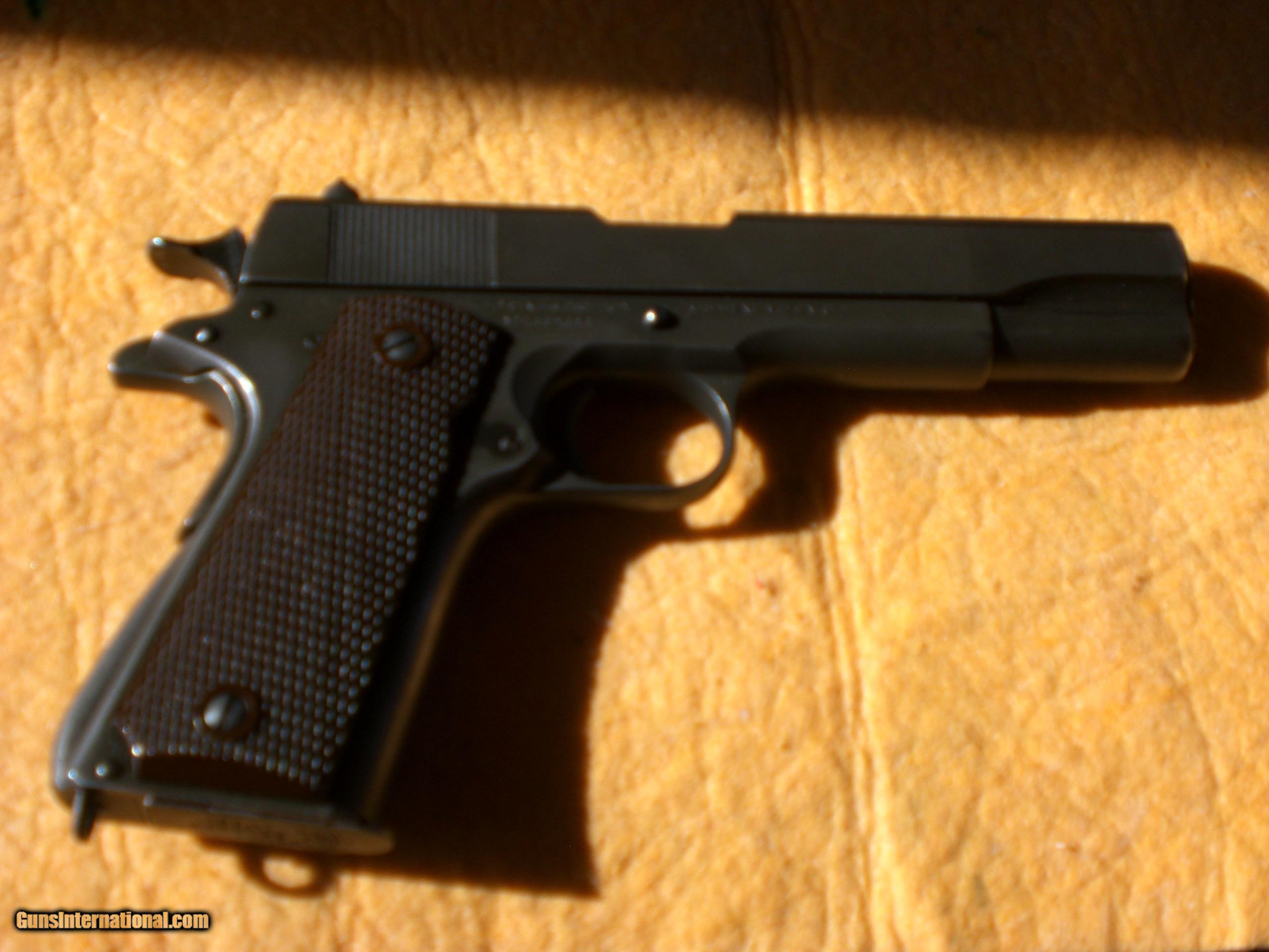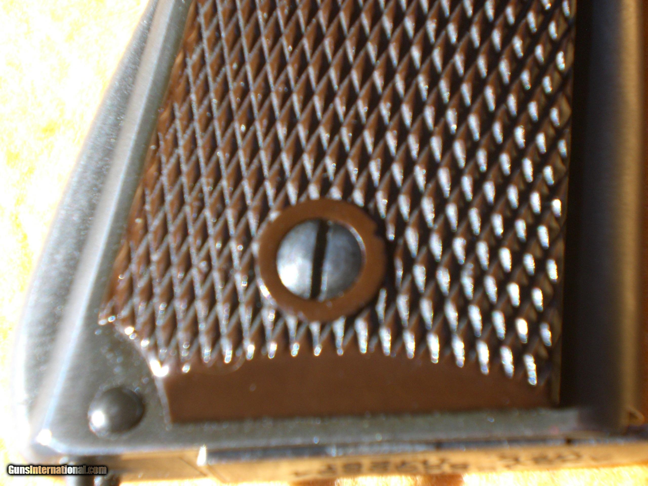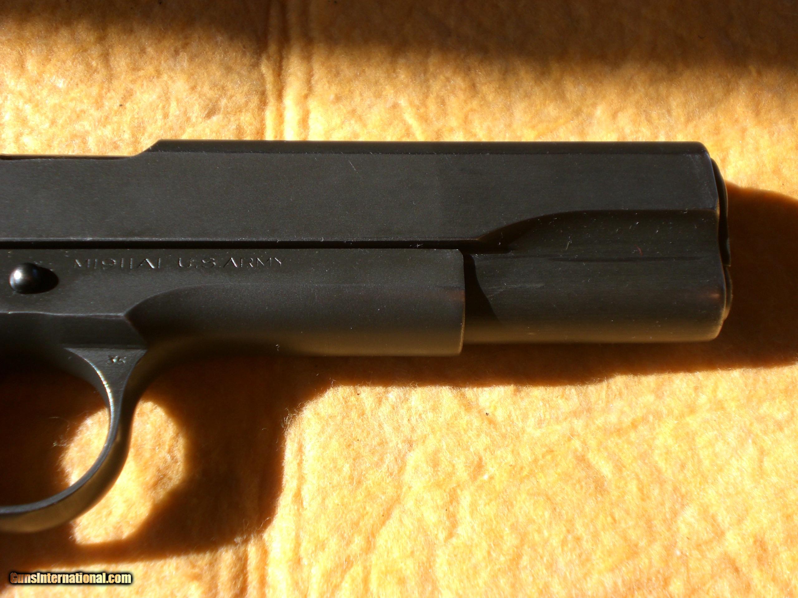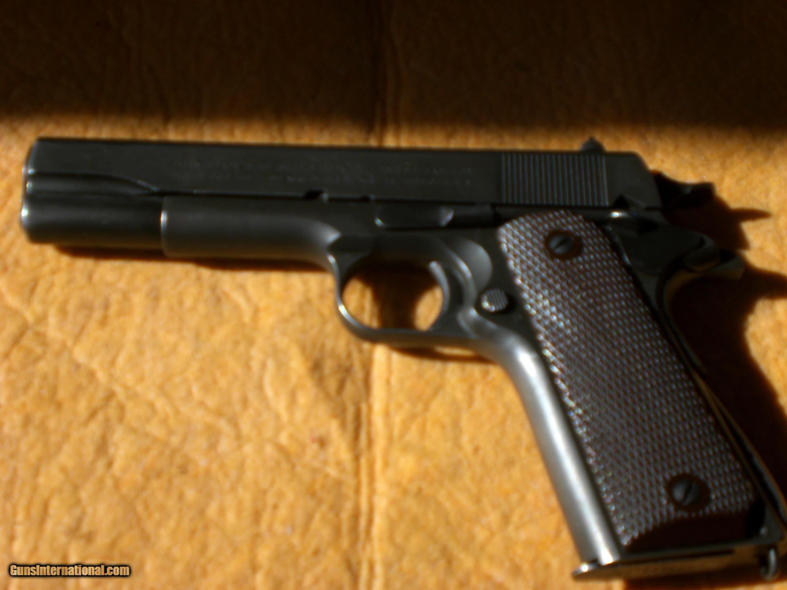 Description: Very late production (1945; serial no. 1,662,XXX) Colt manufacture 1911A!. Complete, unaltered, every mark and part there. Looks like maybe an MP's pistol, because left side, especially slide release and safety, show finish wear, as do sharp edges, as if if a lot of unholstering and holstering (for inspection?). Original barrel finish worn somewhat at ejection port, consistent with same history. Otherwise as issued. Mirror bore. HCD inspector's mark for BG Hugh C. Drewry, senior Army inspector. Grips and grips screws appear untouched. Magazine floorplate has contractor markings (see photos). Overall, excellent late WWII collector. SOLD Curio/Relic: Yes |