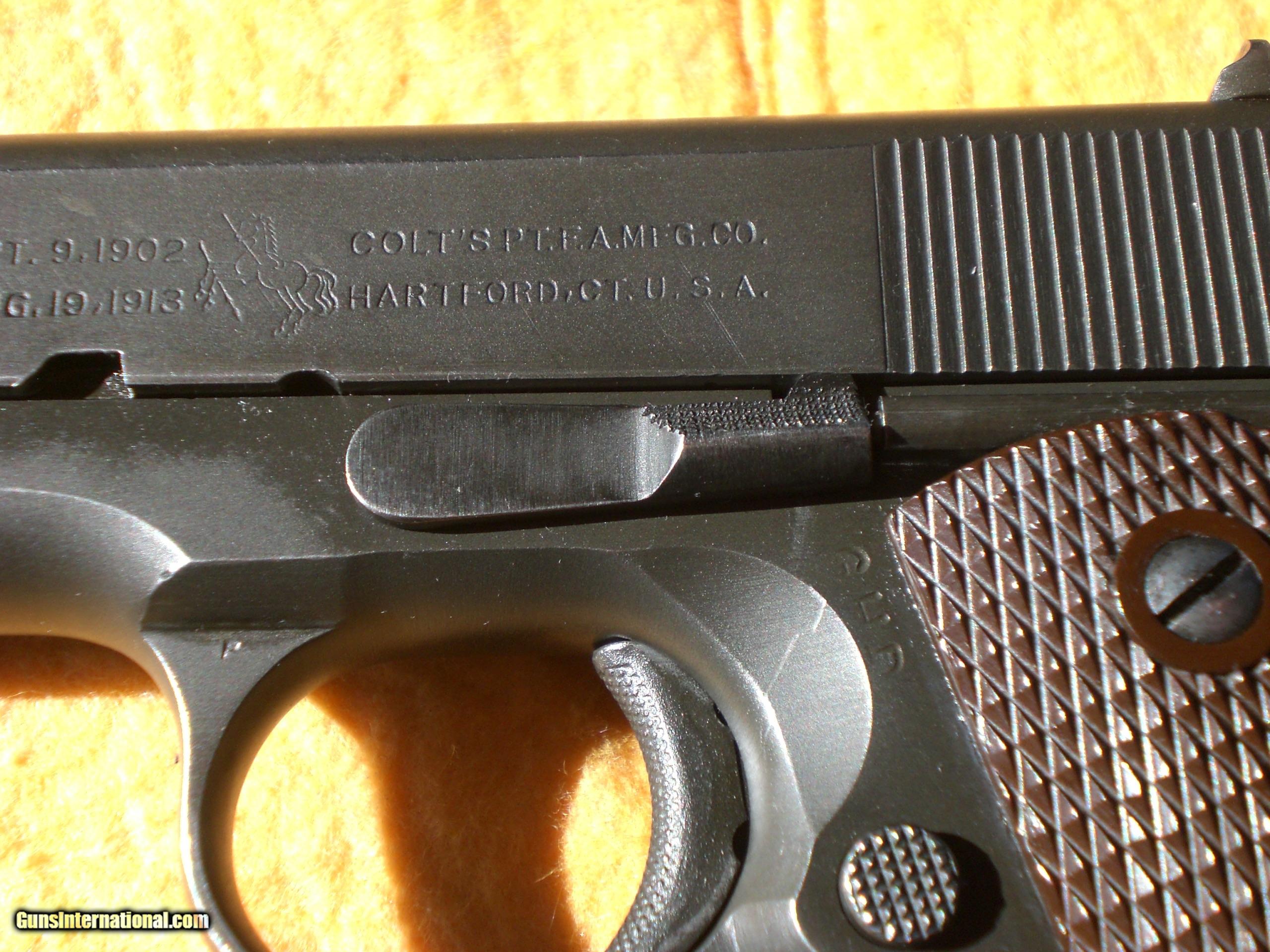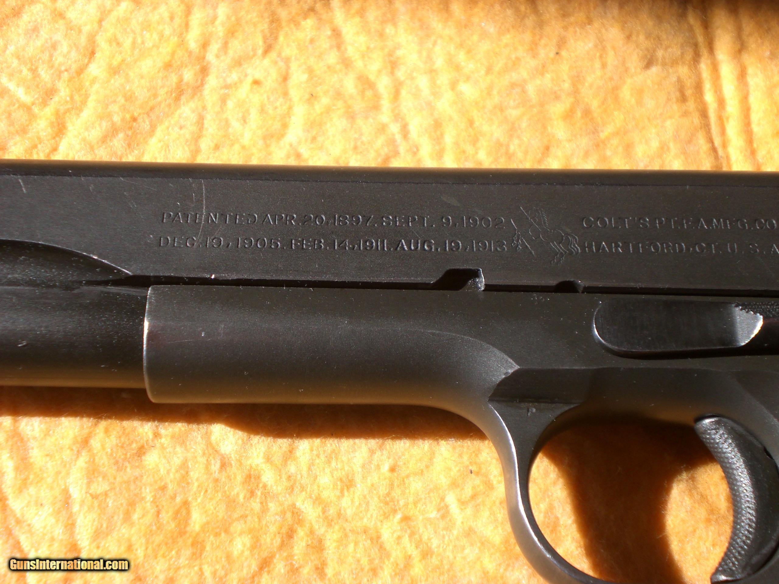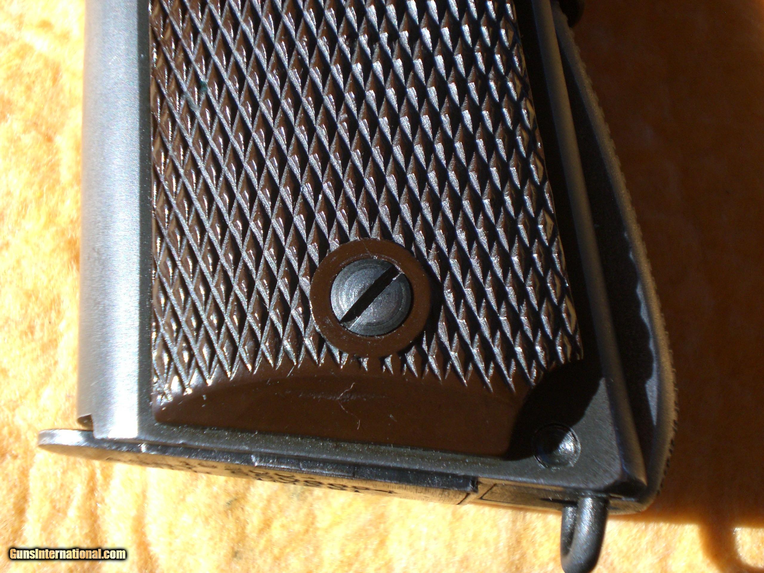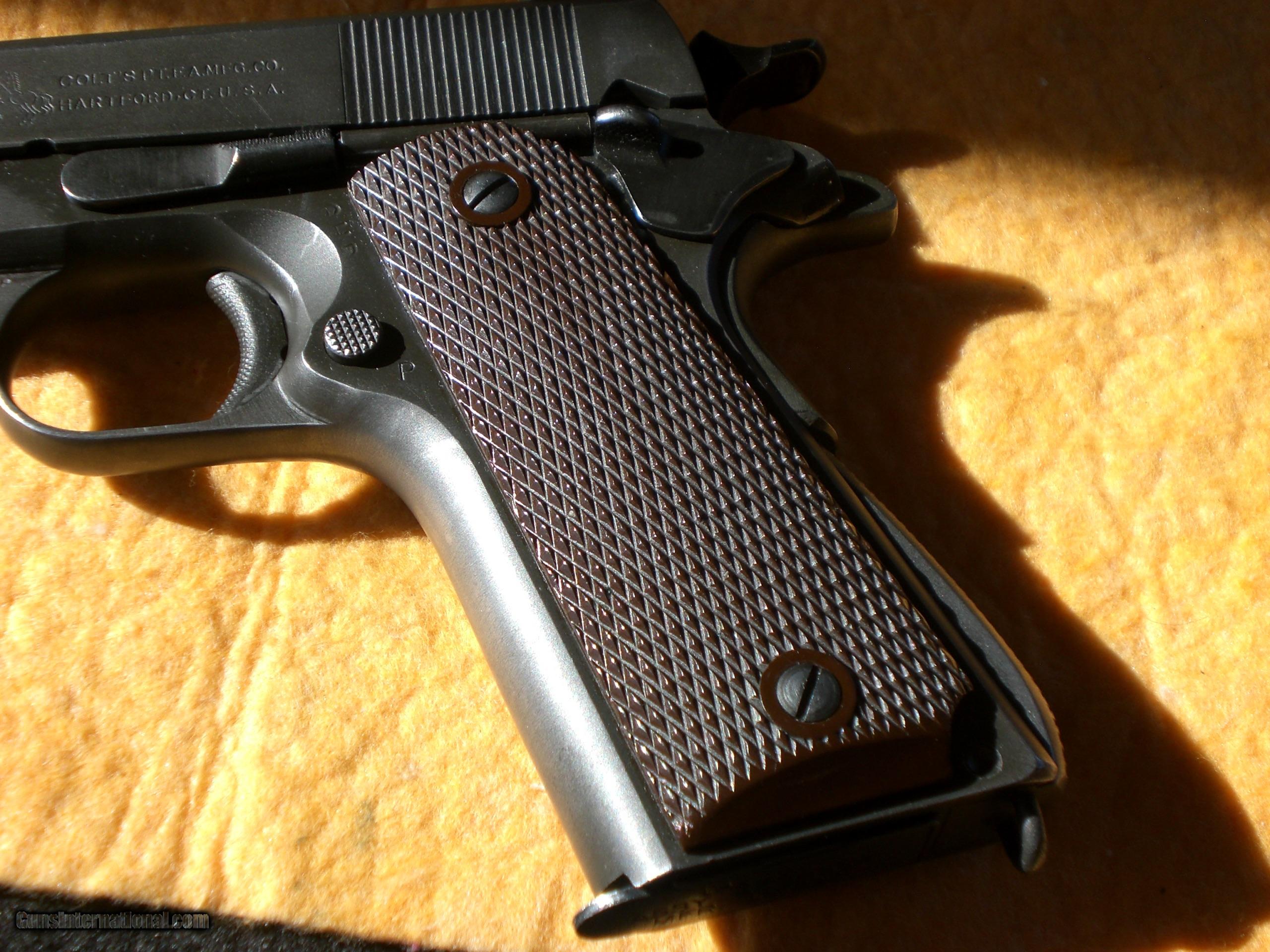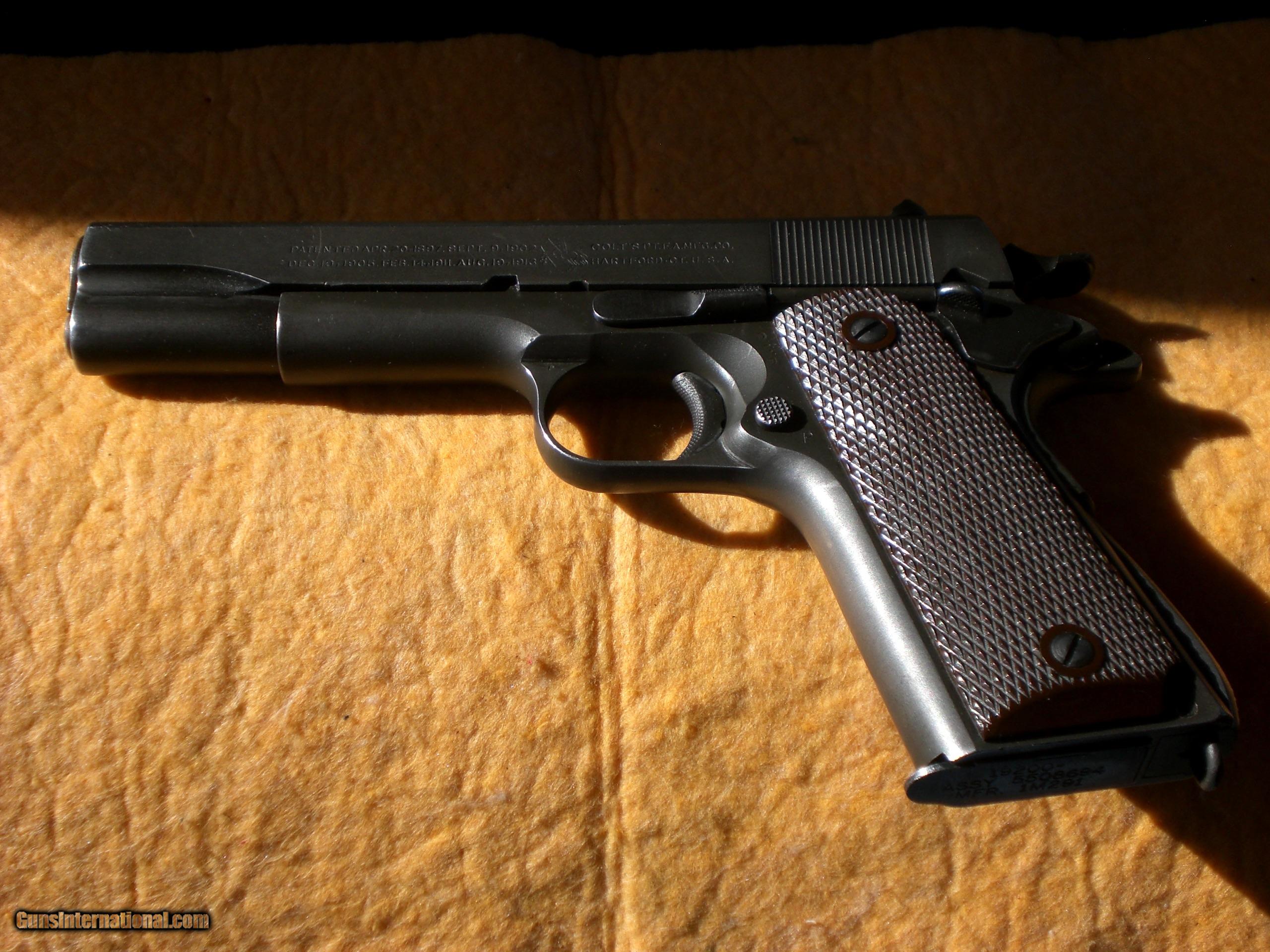 Description: Very late production (1945; serial no. 1,662,XXX) Colt manufacture 1911A!. Complete, unaltered, every mark and part there. Looks like maybe an MP's pistol, because left side, especially slide release and safety, show finish wear, as do sharp edges, as if if a lot of unholstering and holstering (for inspection?). Original barrel finish worn somewhat at ejection port, consistent with same history. Otherwise as issued. Mirror bore. HCD inspector's mark for BG Hugh C. Drewry, senior Army inspector. Grips and grips screws appear untouched. Magazine floorplate has contractor markings (see photos). Overall, excellent late WWII collector. SOLD Curio/Relic: Yes |