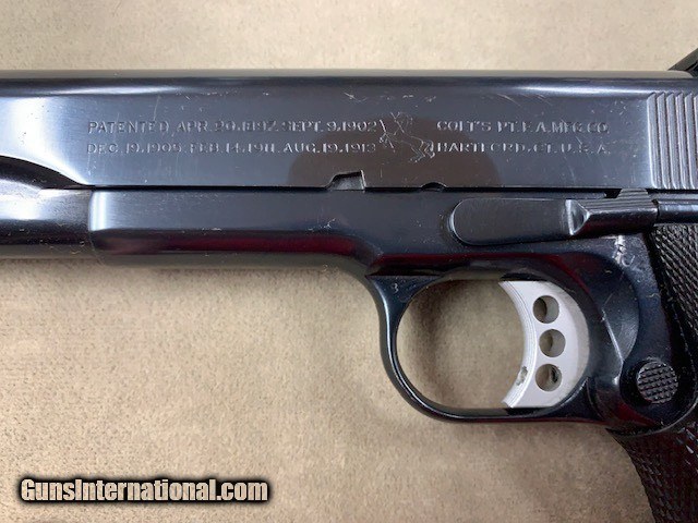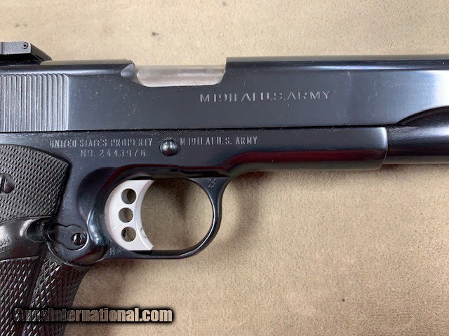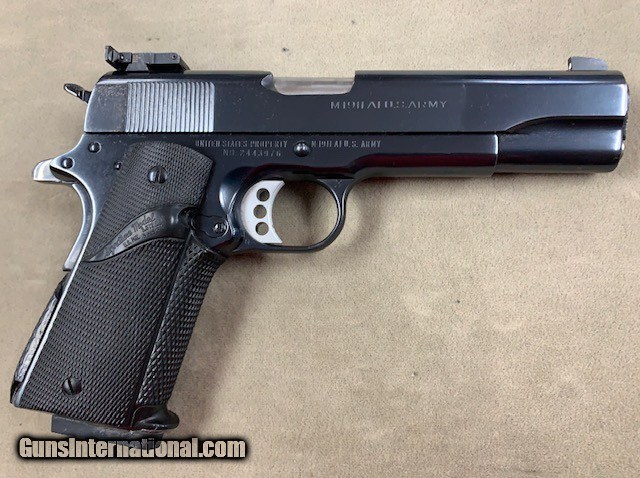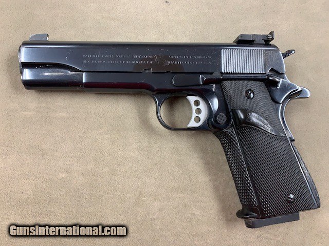 Description: This an example of a 1911A1 .45 acp Pistol manufactured in 1945 that was probably sold as surplus after the war. The purchaser then did a custom job on the pistol, trigger, action, sights, custom refinish, etc. and no doubt used the gun in competition. The 40's, 50's, and 60's were the hayday of the .45 auto competitions around the country - civilians, police, and the military had their own and frequently joined together. Many of them did what this owner did to customize their .45 auto's and this is a prime example. I believe it is all original from that era except the sights were modified probably sometime in the 1970's forward as evidenced by the 3 dot system used (not common in the 50's or 60's). SOLD Curio/Relic: Yes Handgun Caliber: .45 ACP (.45 Auto) |