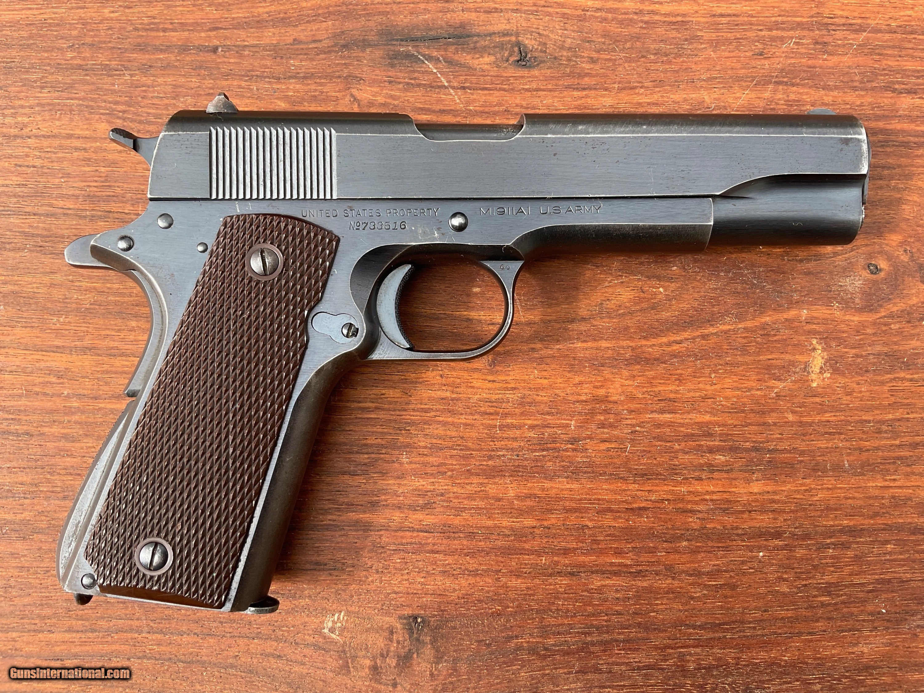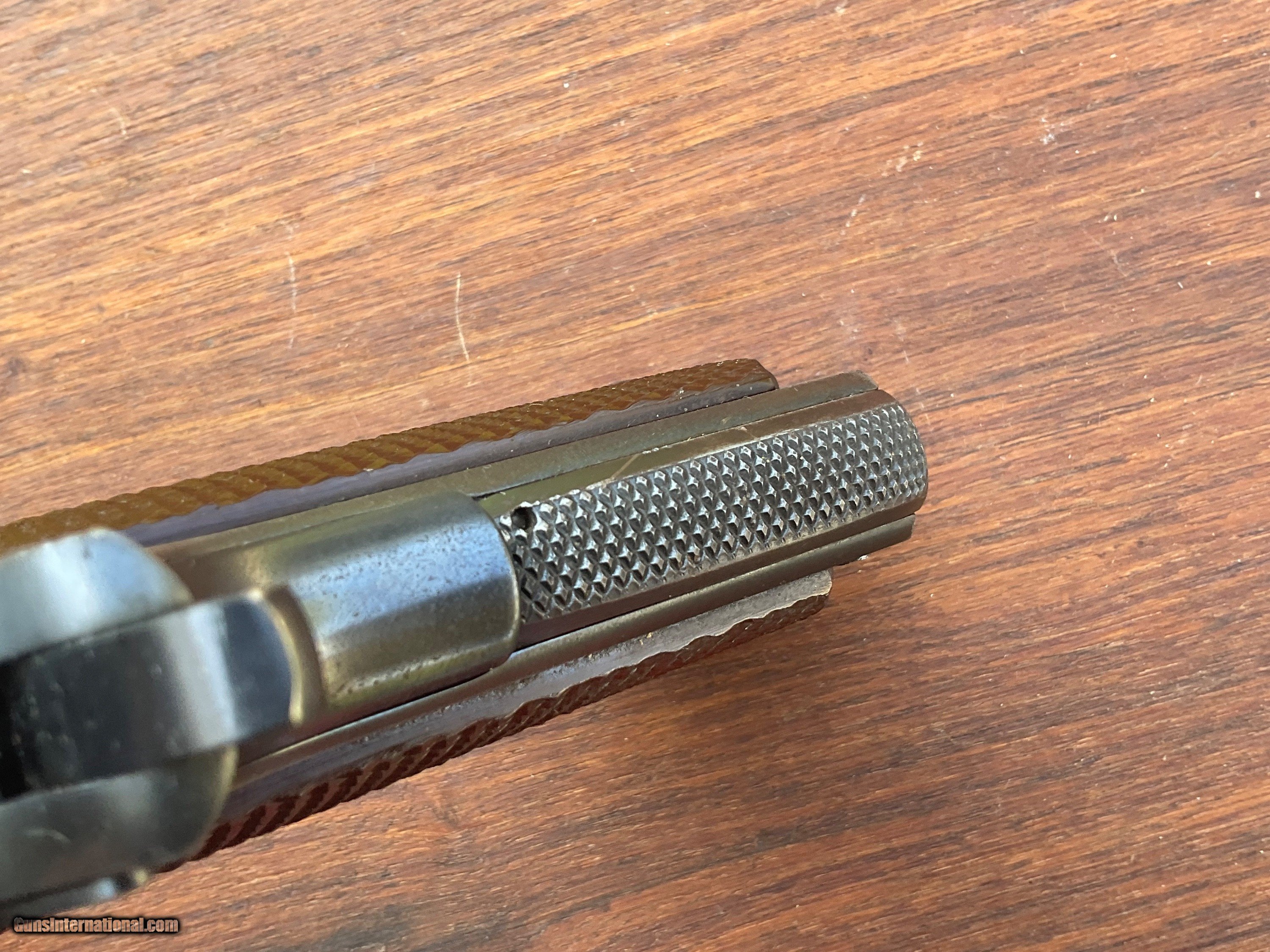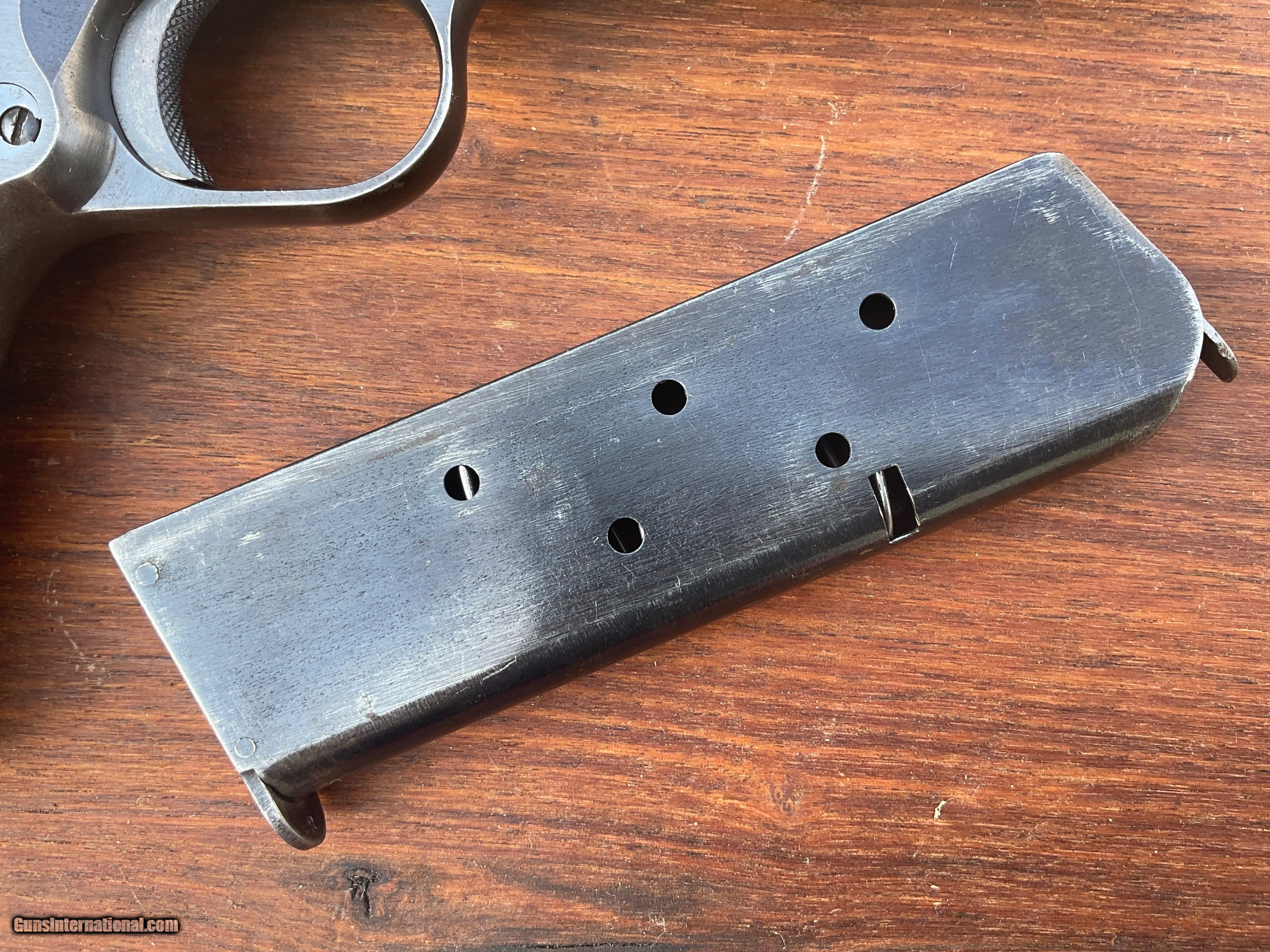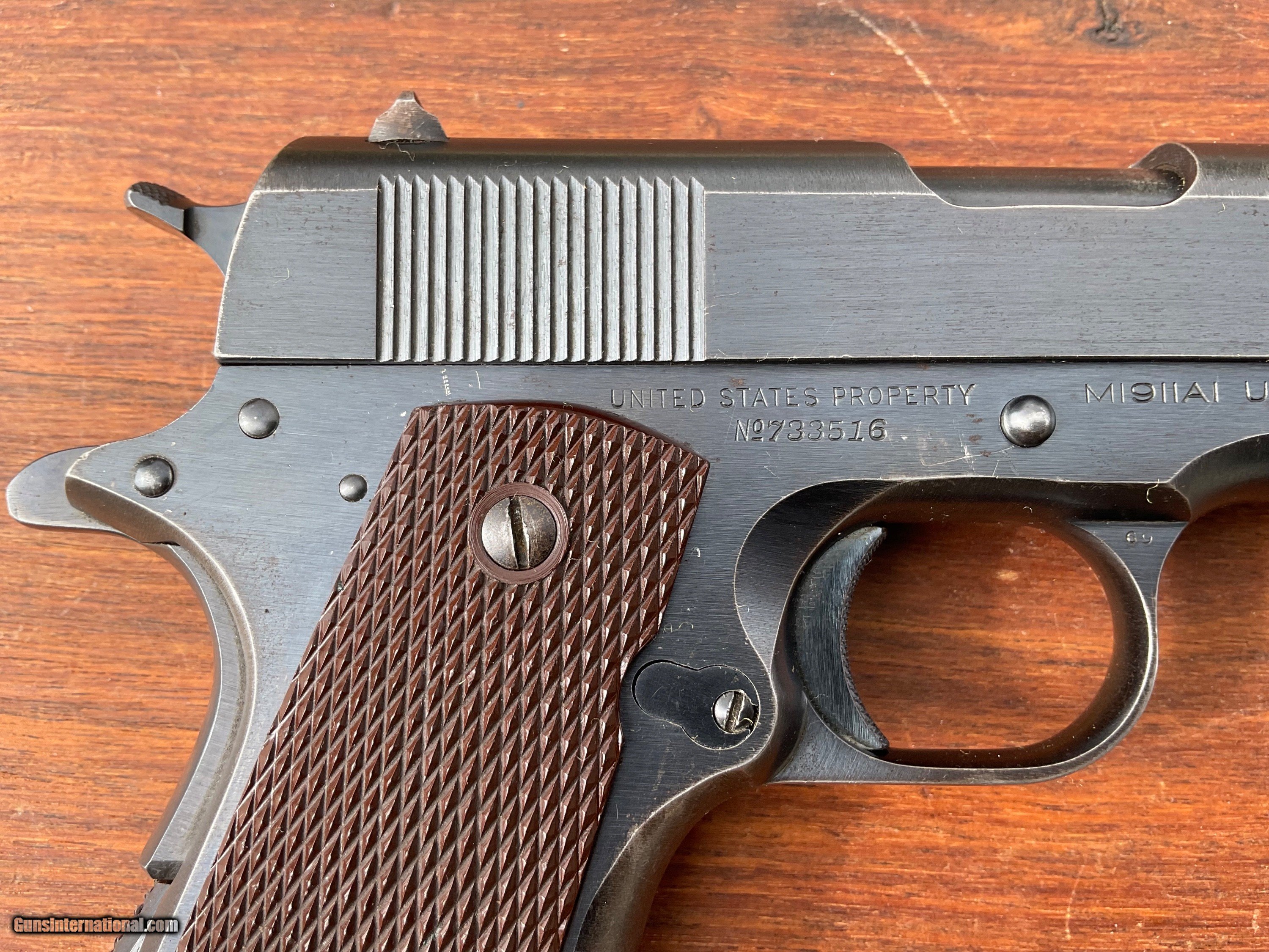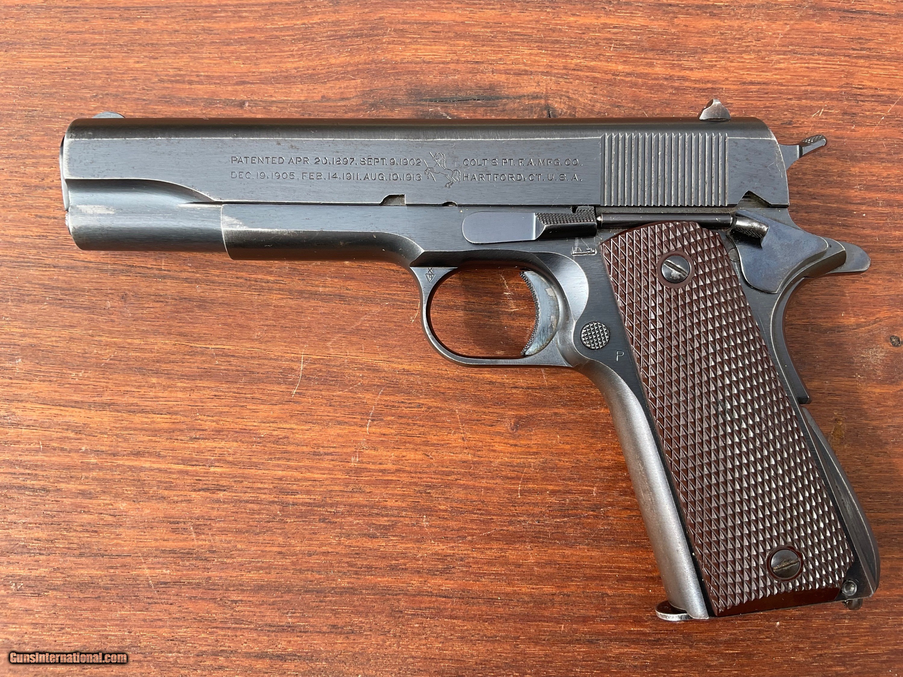 Description: Offered for sale this week is a fine example of the very coveted and desirable blued finish M1911A1. This example was shipped to the Springfield Armory on June 28th, 1941. The finish is original and still very lustrous. Many collectors consider these to be amoung the most beautiful pistols Colts ever produced. The combination of the brushed blue finish and high polish small parts really makes these guns stand out. The pistol has its numbered matching slide, Coltwood hollowback grips as well has a COLT 45 Auto marked barrel with the small G in front of the lug. The magazine is an early war pinned base full blue contractor mag and is S marked on the toe. The pistol shows only honest wear from handling. These pistols were almost certainly issued out during WW2 making decent examples very scarce. I only see about one or two of these a year. SOLD Curio/Relic: Yes |