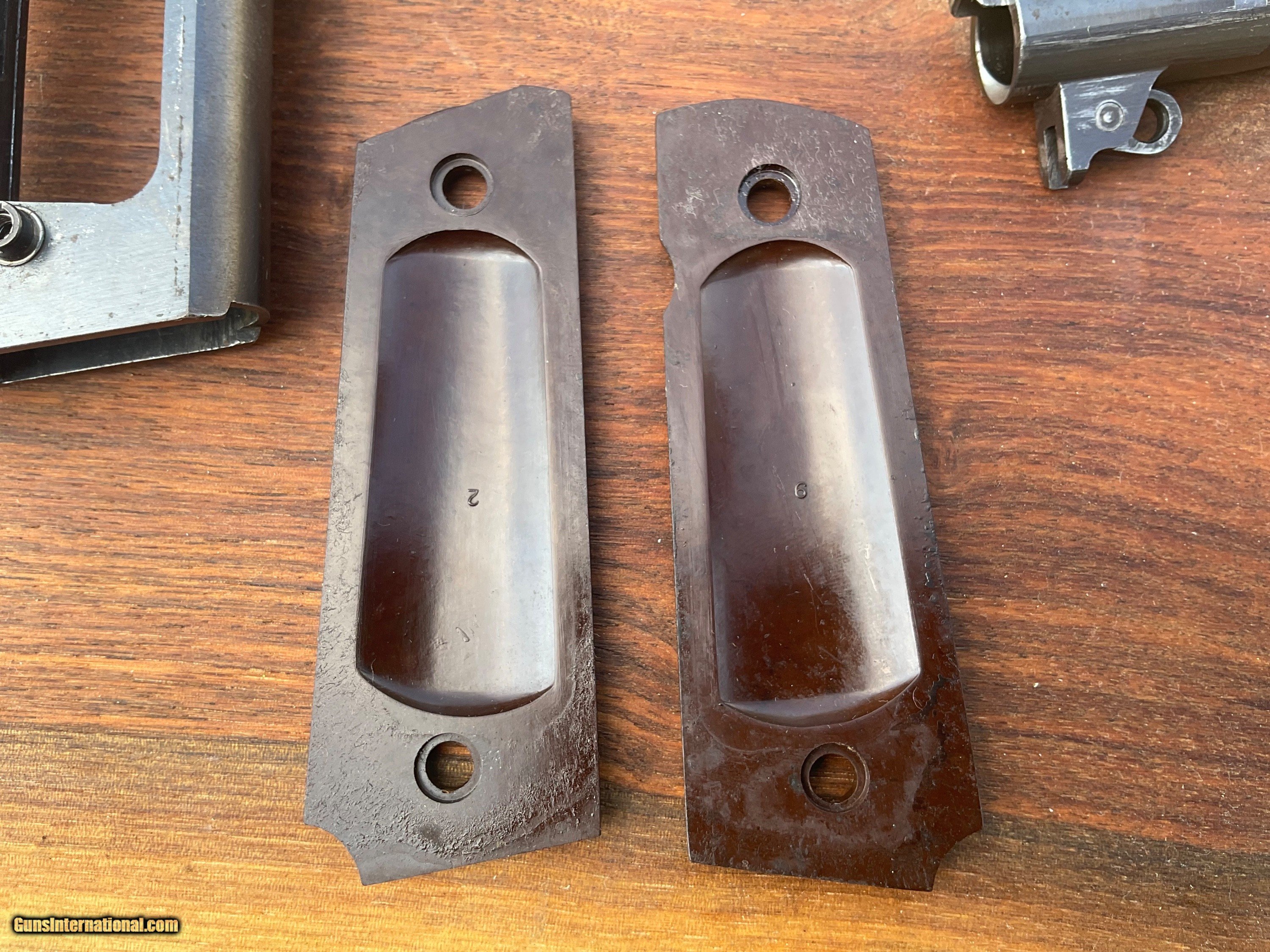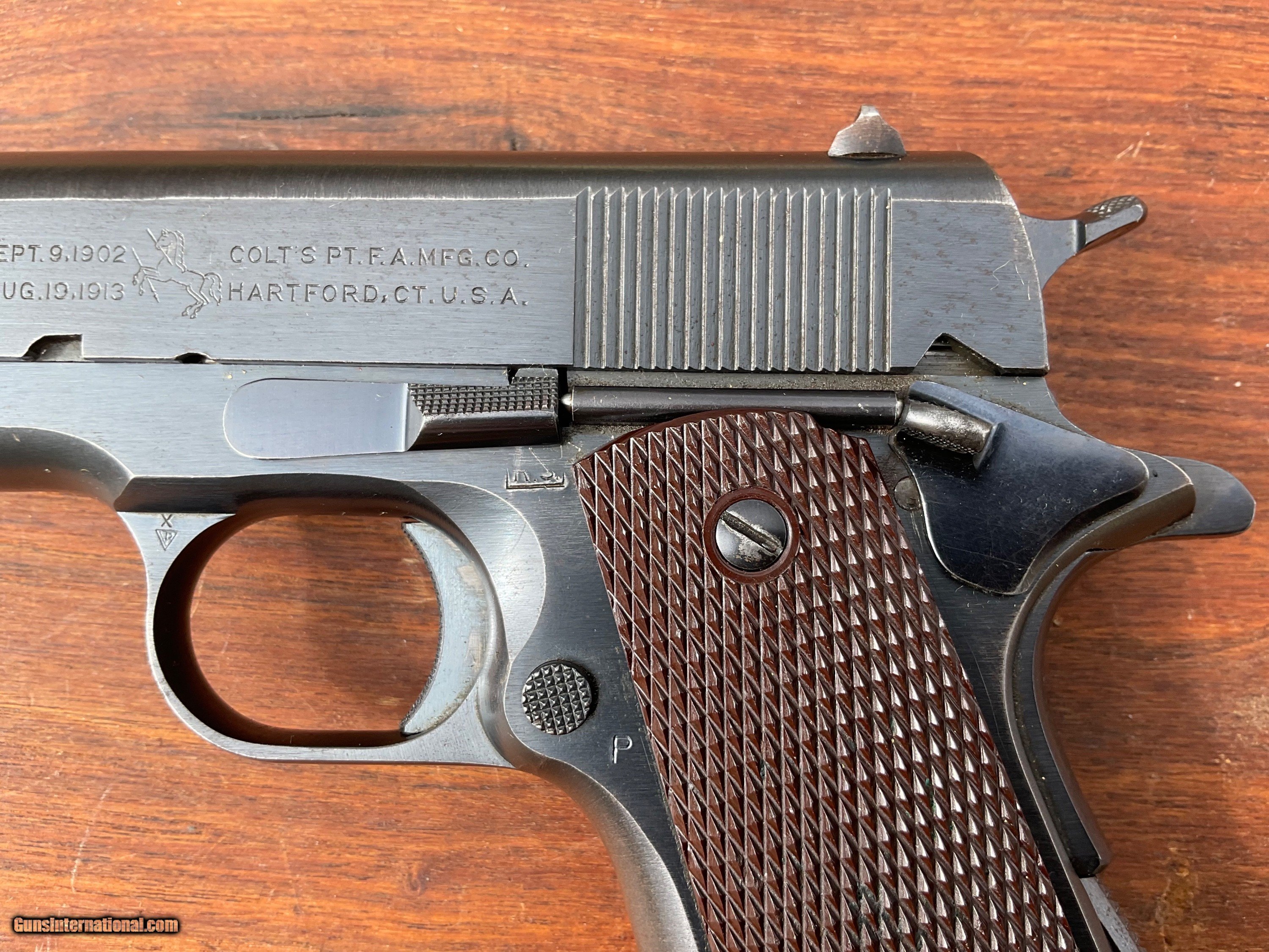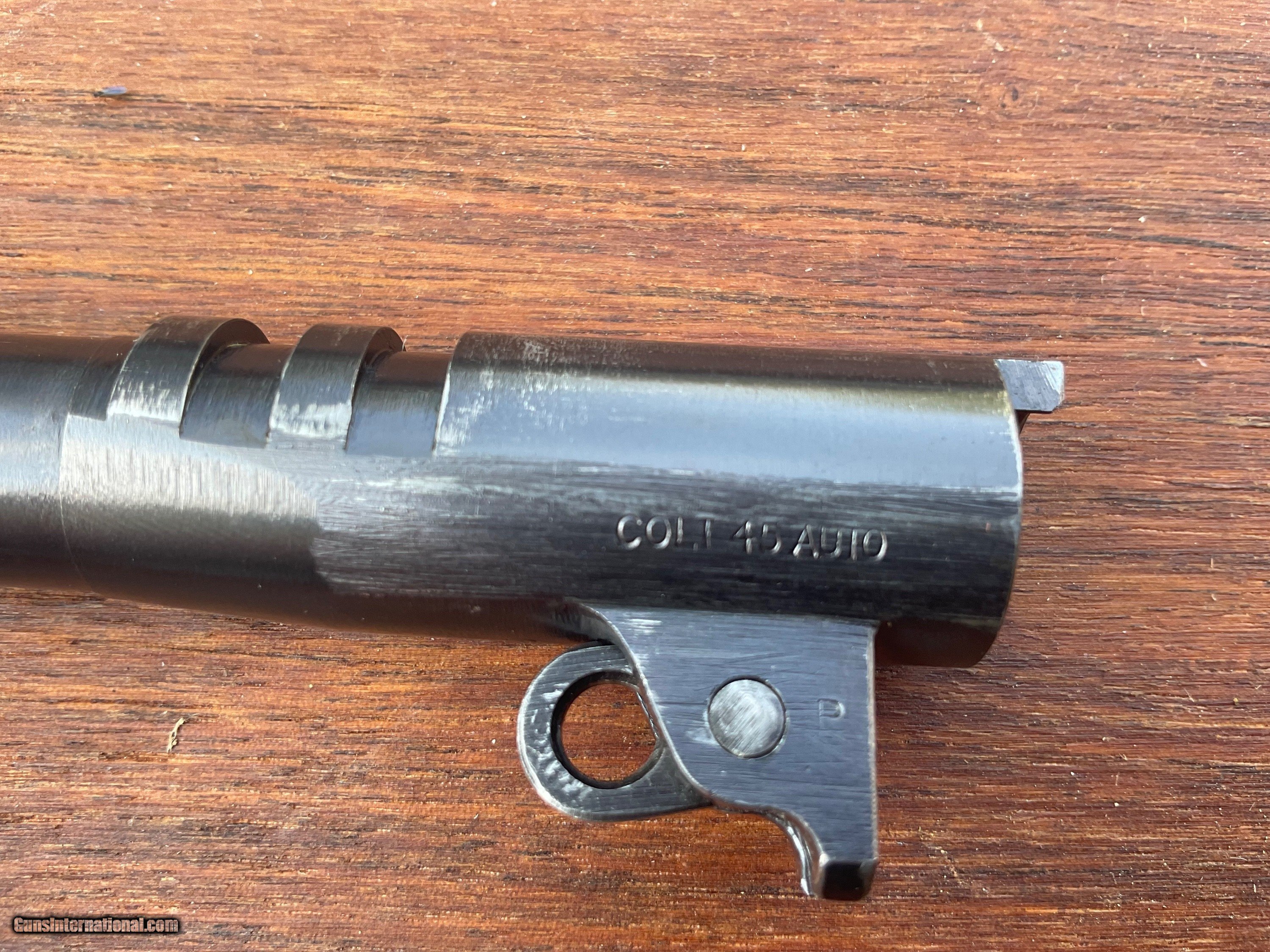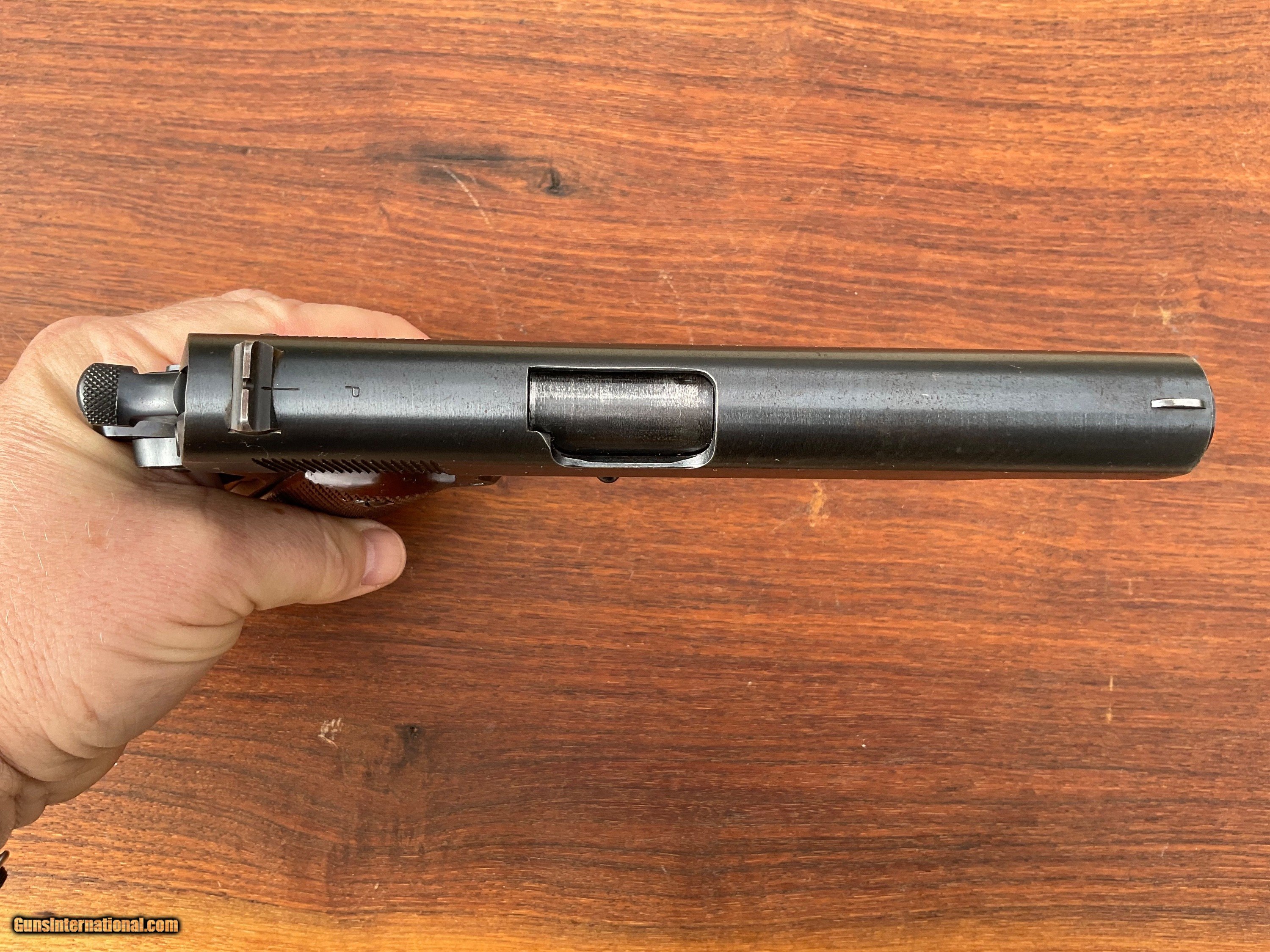 Description: Offered for sale this week is a fine example of the very coveted and desirable blued finish M1911A1. This example was shipped to the Springfield Armory on June 28th, 1941. The finish is original and still very lustrous. Many collectors consider these to be amoung the most beautiful pistols Colts ever produced. The combination of the brushed blue finish and high polish small parts really makes these guns stand out. The pistol has its numbered matching slide, Coltwood hollowback grips as well has a COLT 45 Auto marked barrel with the small G in front of the lug. The magazine is an early war pinned base full blue contractor mag and is S marked on the toe. The pistol shows only honest wear from handling. These pistols were almost certainly issued out during WW2 making decent examples very scarce. I only see about one or two of these a year. SOLD Curio/Relic: Yes |