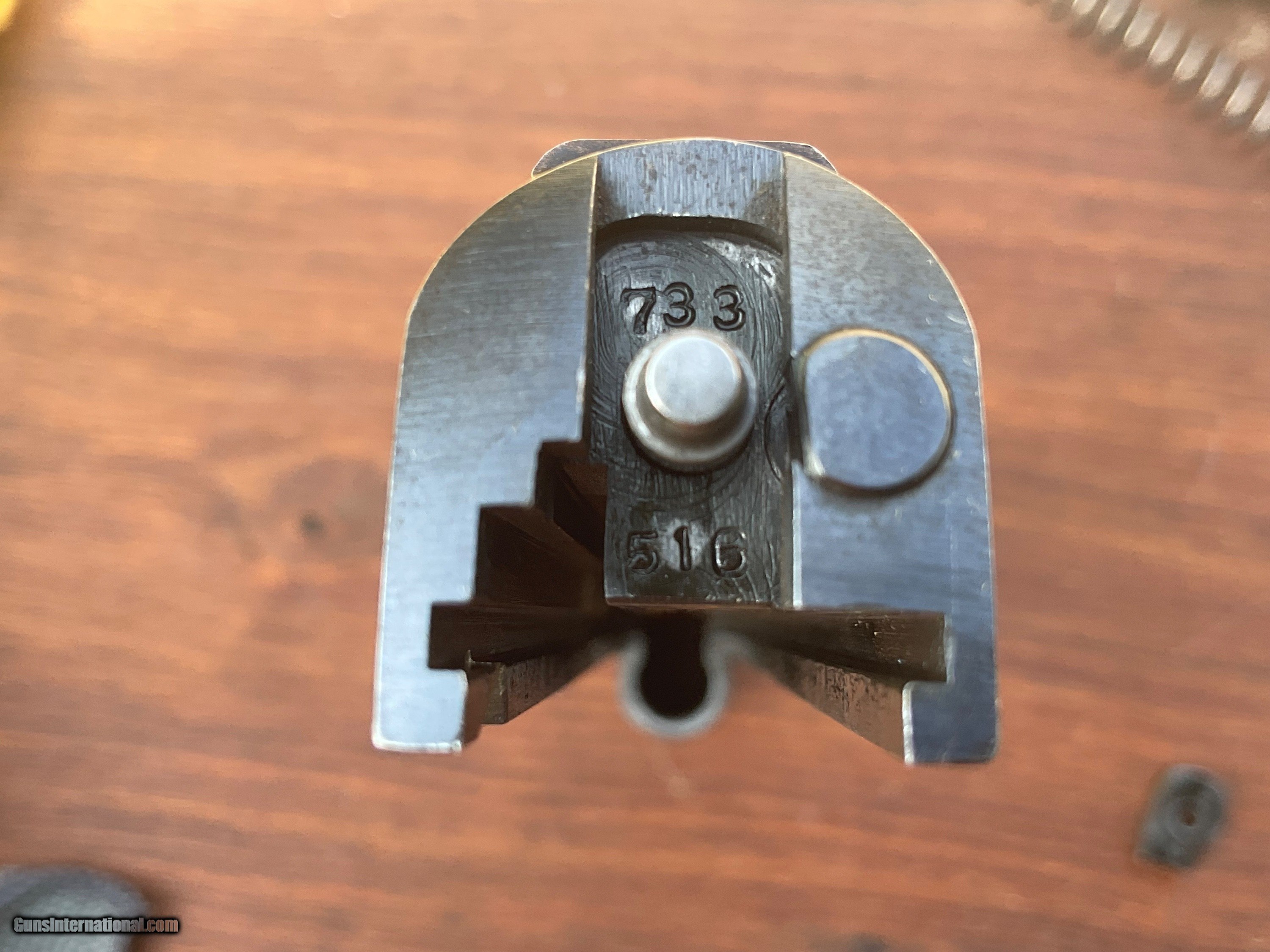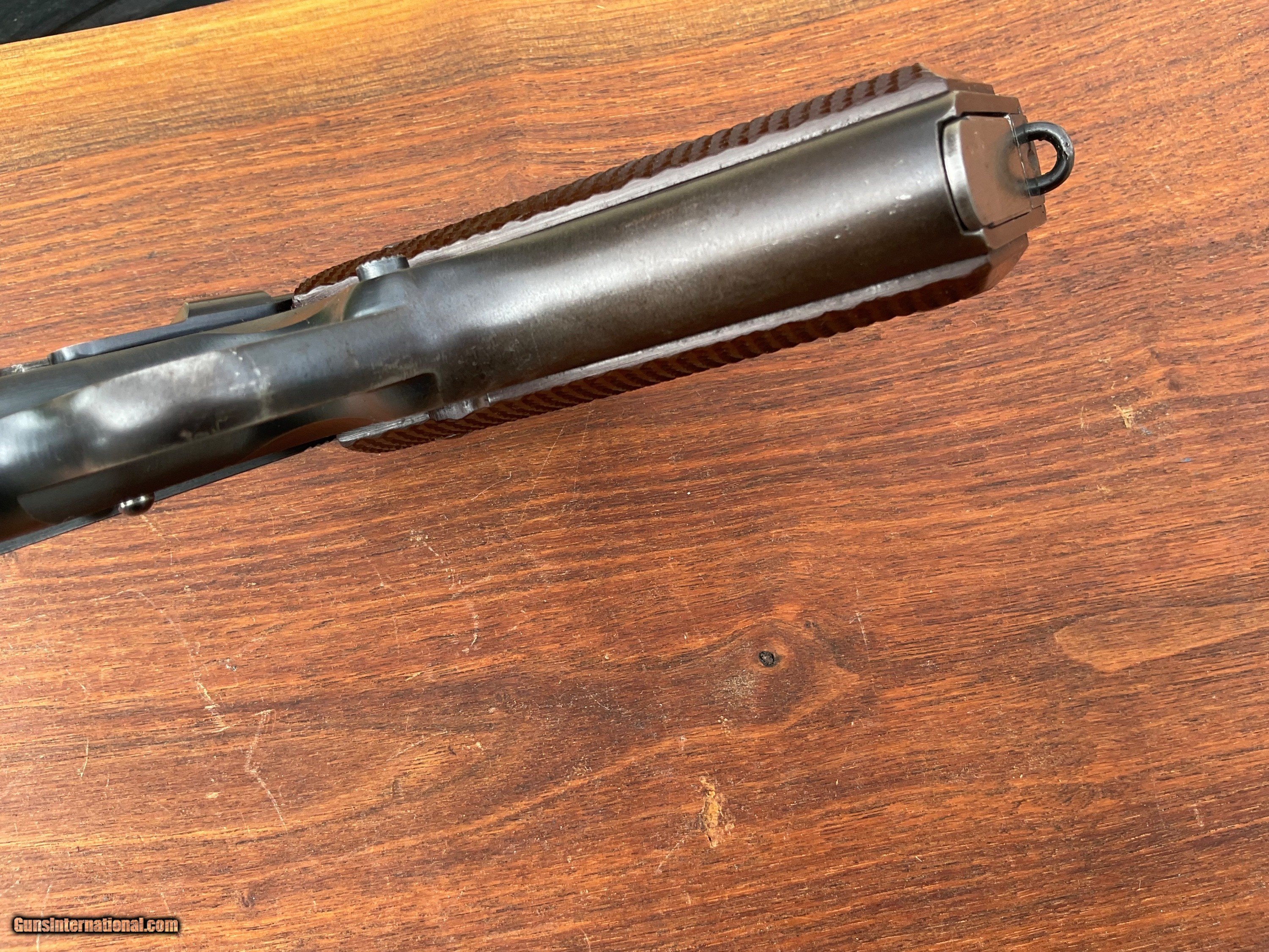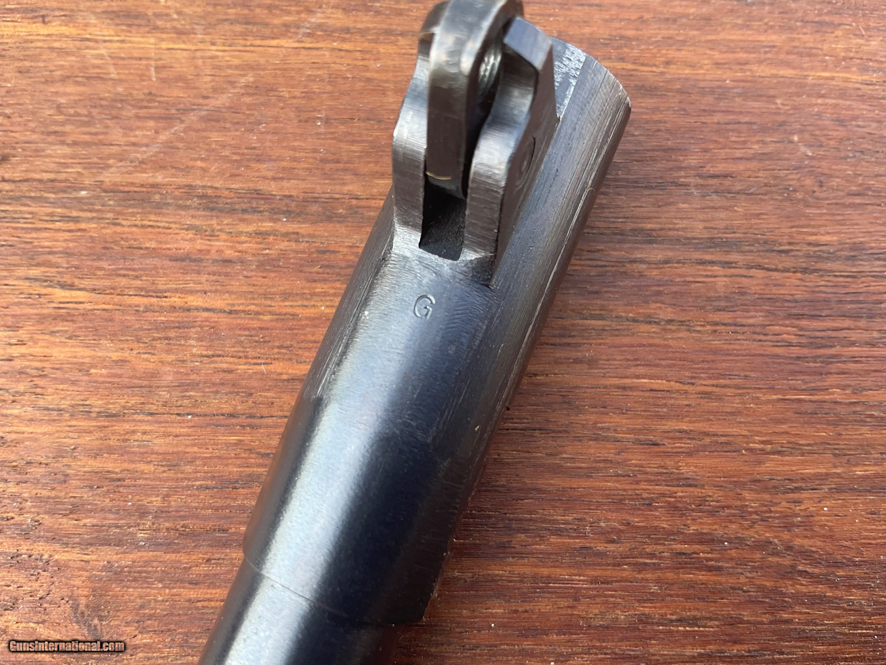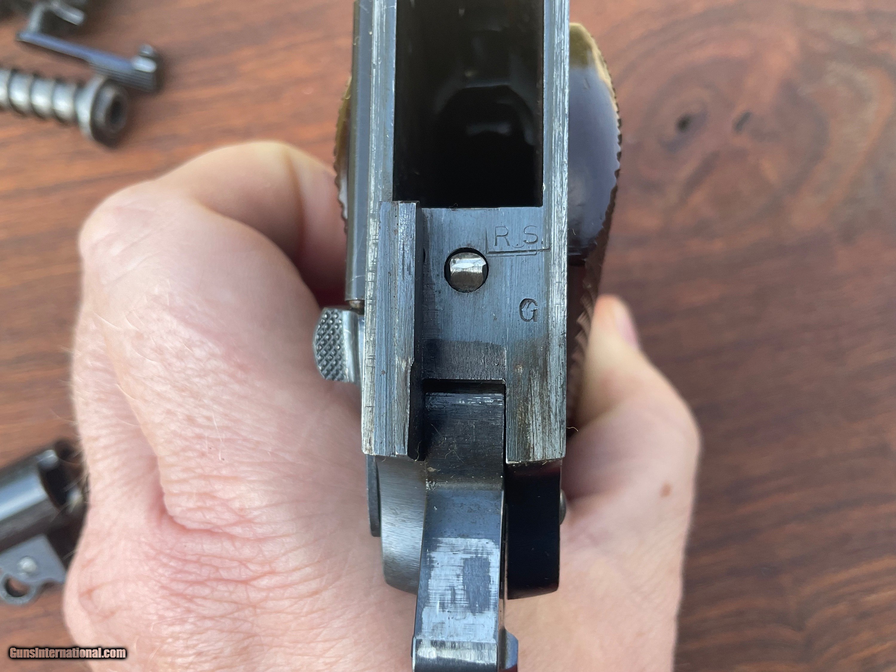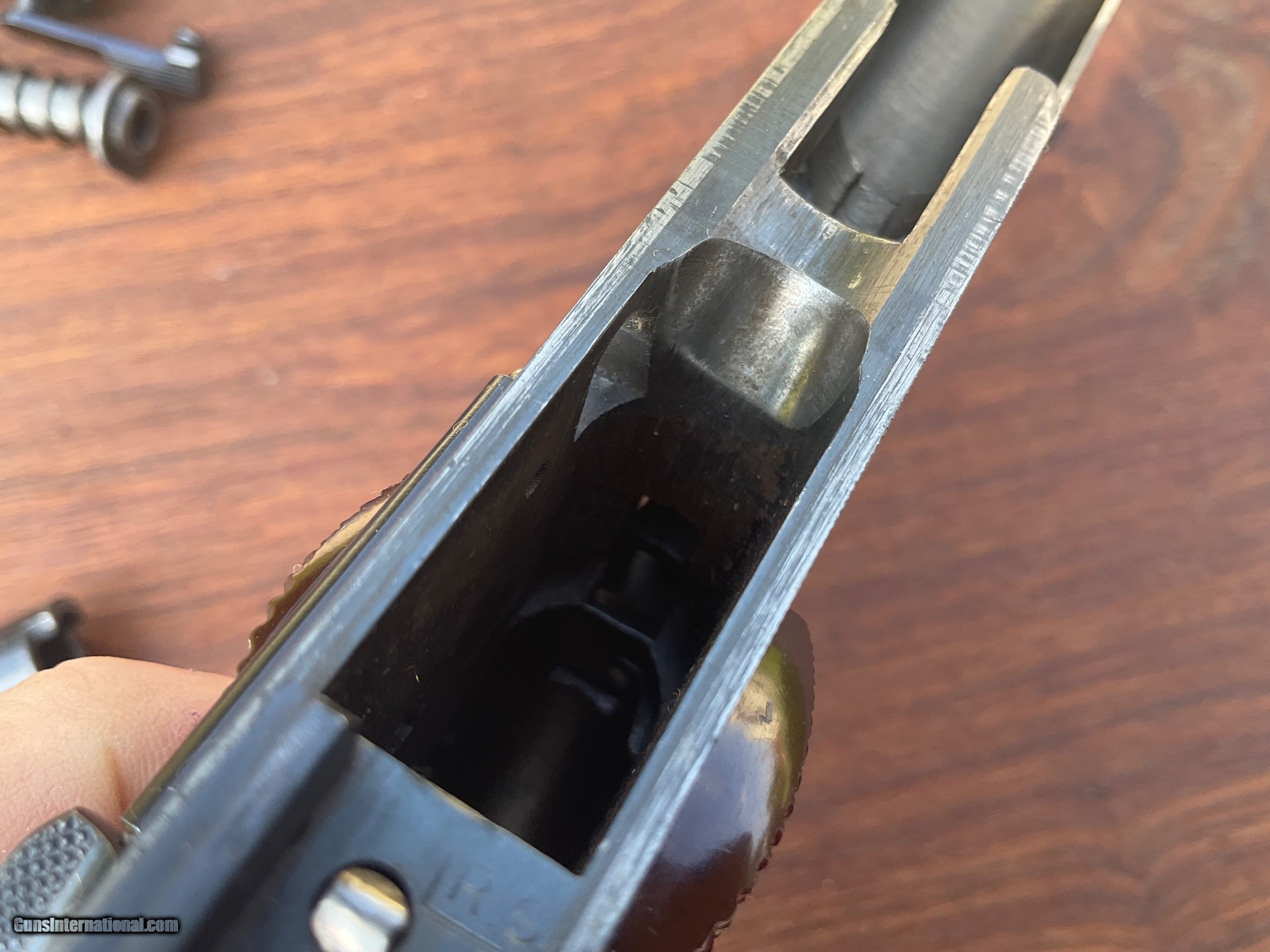 Description: Offered for sale this week is a fine example of the very coveted and desirable blued finish M1911A1. This example was shipped to the Springfield Armory on June 28th, 1941. The finish is original and still very lustrous. Many collectors consider these to be amoung the most beautiful pistols Colts ever produced. The combination of the brushed blue finish and high polish small parts really makes these guns stand out. The pistol has its numbered matching slide, Coltwood hollowback grips as well has a COLT 45 Auto marked barrel with the small G in front of the lug. The magazine is an early war pinned base full blue contractor mag and is S marked on the toe. The pistol shows only honest wear from handling. These pistols were almost certainly issued out during WW2 making decent examples very scarce. I only see about one or two of these a year. SOLD Curio/Relic: Yes |