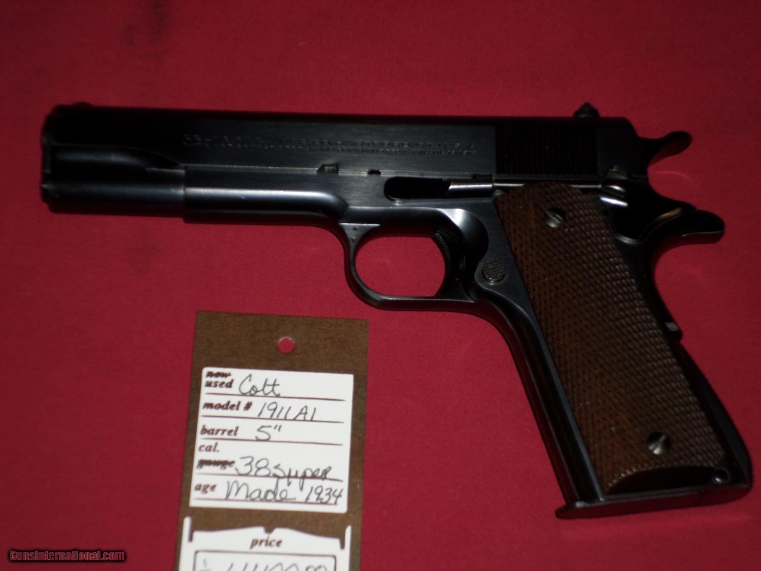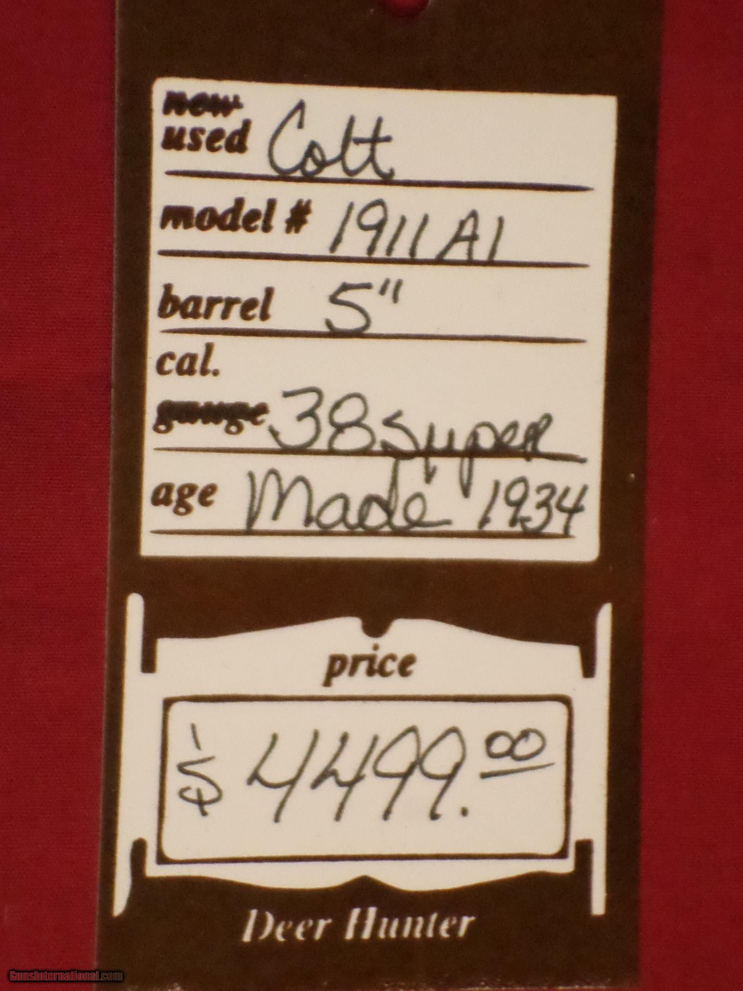 Description: SOLD For sale, Colt 1911a1 .38 Super, all original and correct, almost flawless finish. Circa 1934. SOLD To see more of our inventory, visit deerhunter guns,com We accept MC, Visa and Discover, no AmEx. No Sales to California. Like us on Facebook: Deer Hunter Guns SOLD Curio/Relic: Yes |