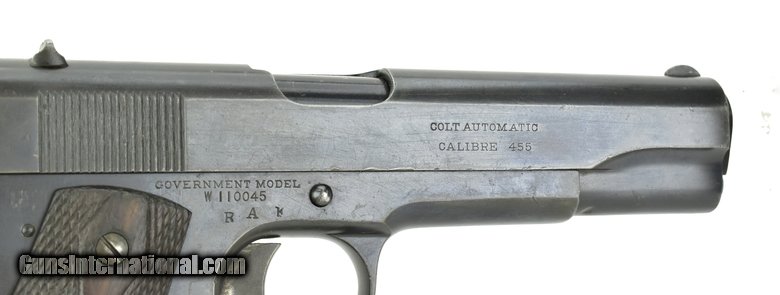 Colt Government .45 ACP caliber pistol. WWII RAF (Royal Air Force) contract Government model. This contract was for .455 caliber. Barrel and magazine have been replaced to .45 ACP. Frame is marked RAF and has British proofs. Bore is very good with strong rifling and minor frosting. Very good overall. An affordable RAF marked 1911.