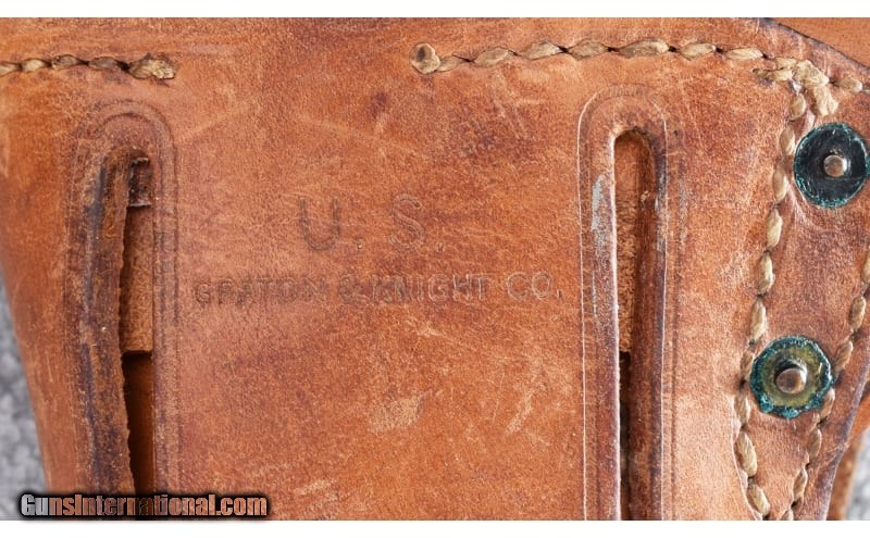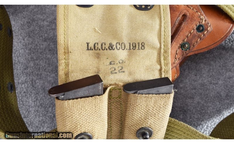 Description: This Colt M1911A1 was manufactured in 1943 and remains in excellent overall condition. Frame has some finish loss at muzzle and on high edges with some scratches around the safety. Gun has "G.H.D." inspector mark on left frame. Original iron sights and checkered plastic grips. Bore is excellent. Gun is complete with "US" belt and leather "Graton & Knight" leather holster. Also includes "L.C.C. & Co. 1918" "CO 22" magazine holster with two spare magazines. Very nice gun!! .45 ACP SOLD Metal Condition: Excellent Bore Condition: Excellent Barrels: 5 Triggers: Factory Butt Pad: Checkered Brown Plastic Grips Weight: 40 Oz. Sights: Bladed Front - Fixed Square Notch Rear Item Location: Wheeling |
