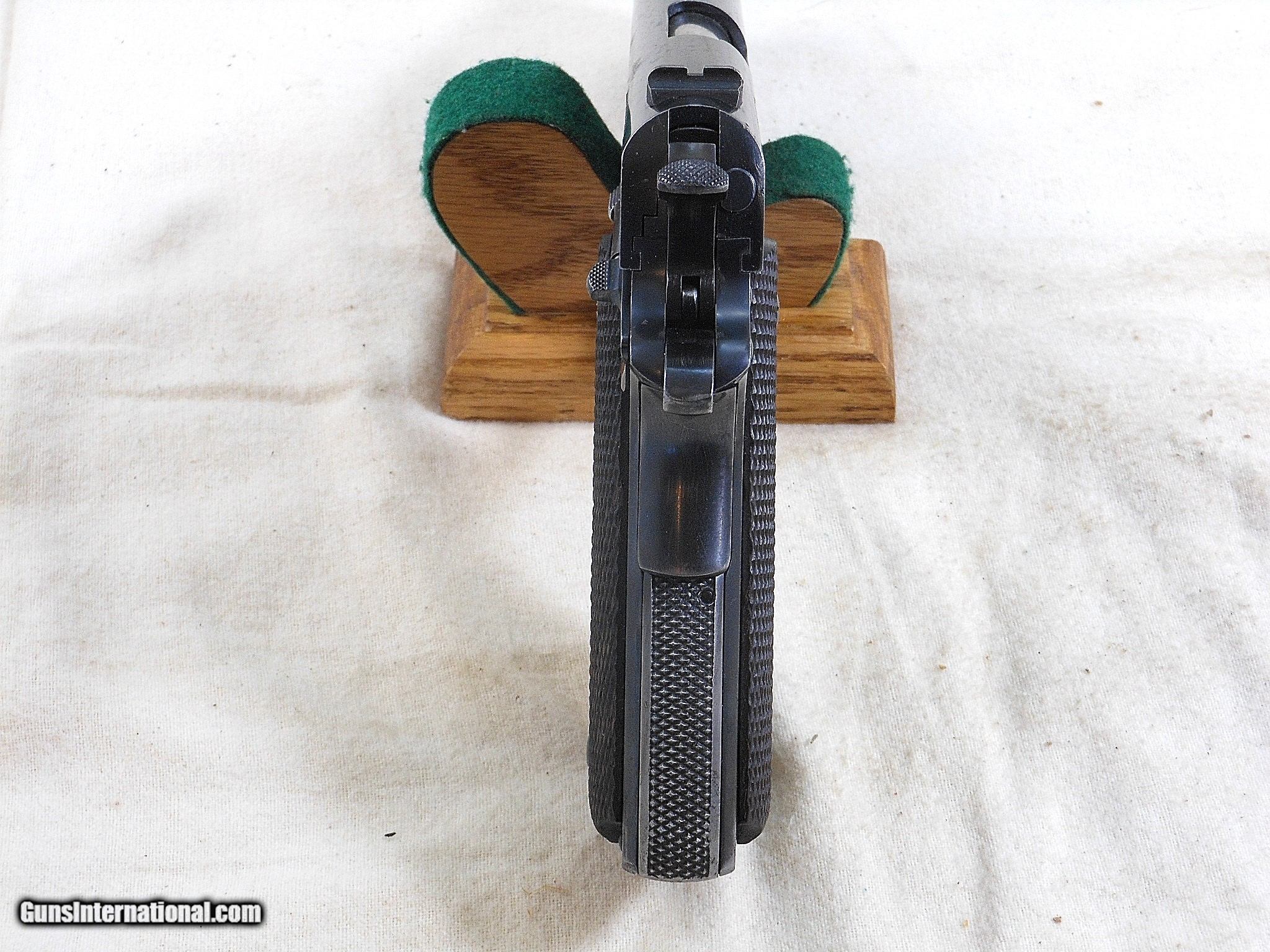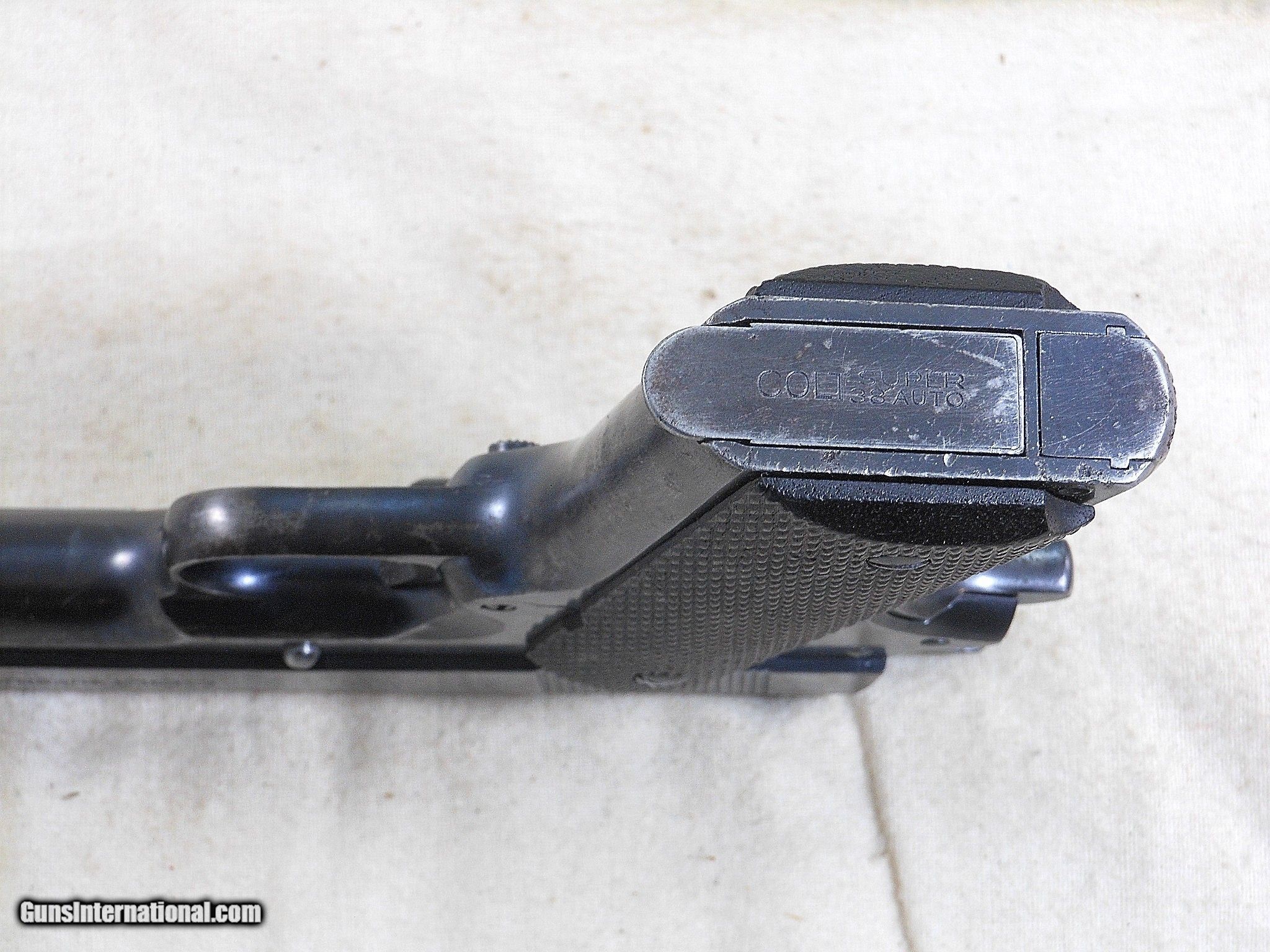 Description: SOLD This Colt Pistol was produced in 1940. The pistol's serial number is 34705. The original 38 Super barrel is in fine condition with a bright clean bore. This Colt is fitted with the rare Swartz safety. Most of the Swartz safety's were found on the 45 A.C.P. models. very few were fitted on the 38 Supers. This Colt was shipped June 18th 1940 To British Purchasing Commission through Winchester Repeating Arms Co. This Colt has the Royal Inspector at Enfield Stamp And The British Broad Arrow Property Stamp. by the safety cut out on the slide. This rare pistol is still in the original condition with no alterations or replaced parts. The all checkered wood grips are in very fine condition. This Colt does show some service use and wear. The original bluing would rate a 84% overall condition. This magazine is the correct original all blued body style magazine. The Swartz safety is intact and this Colt functions great! This is a rare Civilian Model 1911-A1 38 Super that has the rare Swartz Safety and went to England on The Lend Lease Program. This Rare Colt is a true survivor of World War 2! This Pistol deserves to be in an advanced Colt Collection! The original early box of 38 Super can be purchased. Curio&Relic AORE (12) F. No. 645 -22 SOLD Curio/Relic: Yes Handgun Caliber: .38 Super Auto Manufacturer: Colt Model: 1911 A1 Serial Number: 34705 Barrel Length: 5 Inch Chambers: Very Fine Condition: 84% Metal Condition: Very Good Wood Condition: Very Good Bore Condition: Very Fine Barrels: Original Colt Barrel Barrel Type: Commercial Action: Self Loading Finish: Blued Sights: Standard Manufacture Date: 1940 |